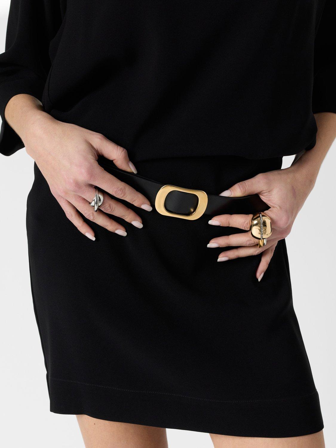 This mini shift dress pairs a V-neckline with three quarter sleeves for a confident everyday look. Its simple shape flatters your form and adapts easily to your plans, finished with a dropped waist belt detail.