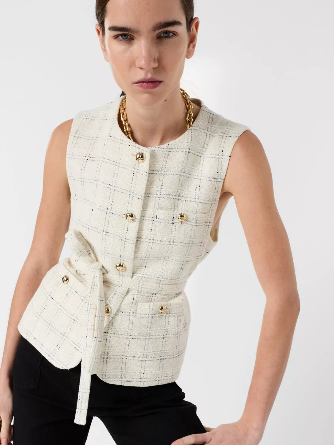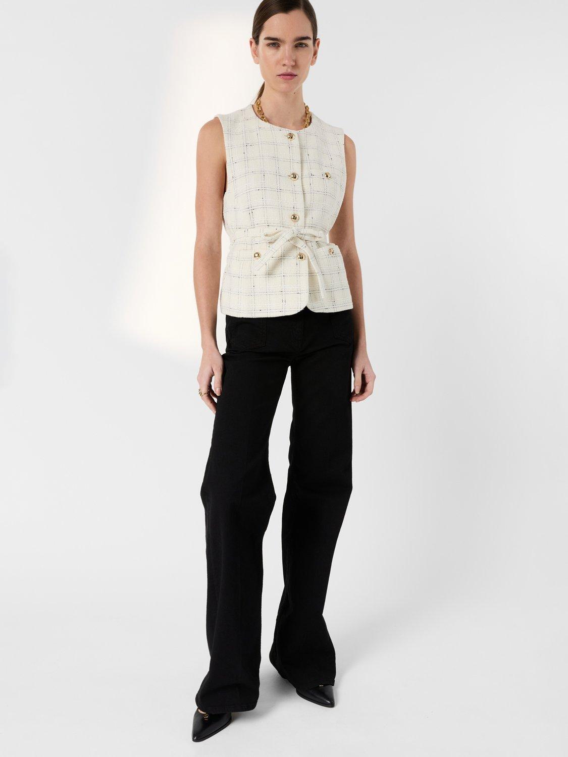 Putting a modern spin on things, this sleeveless jacket from Gerard Darel is made from a breathable cotton blend to a tweed finish and is belted to draw in at the waist.