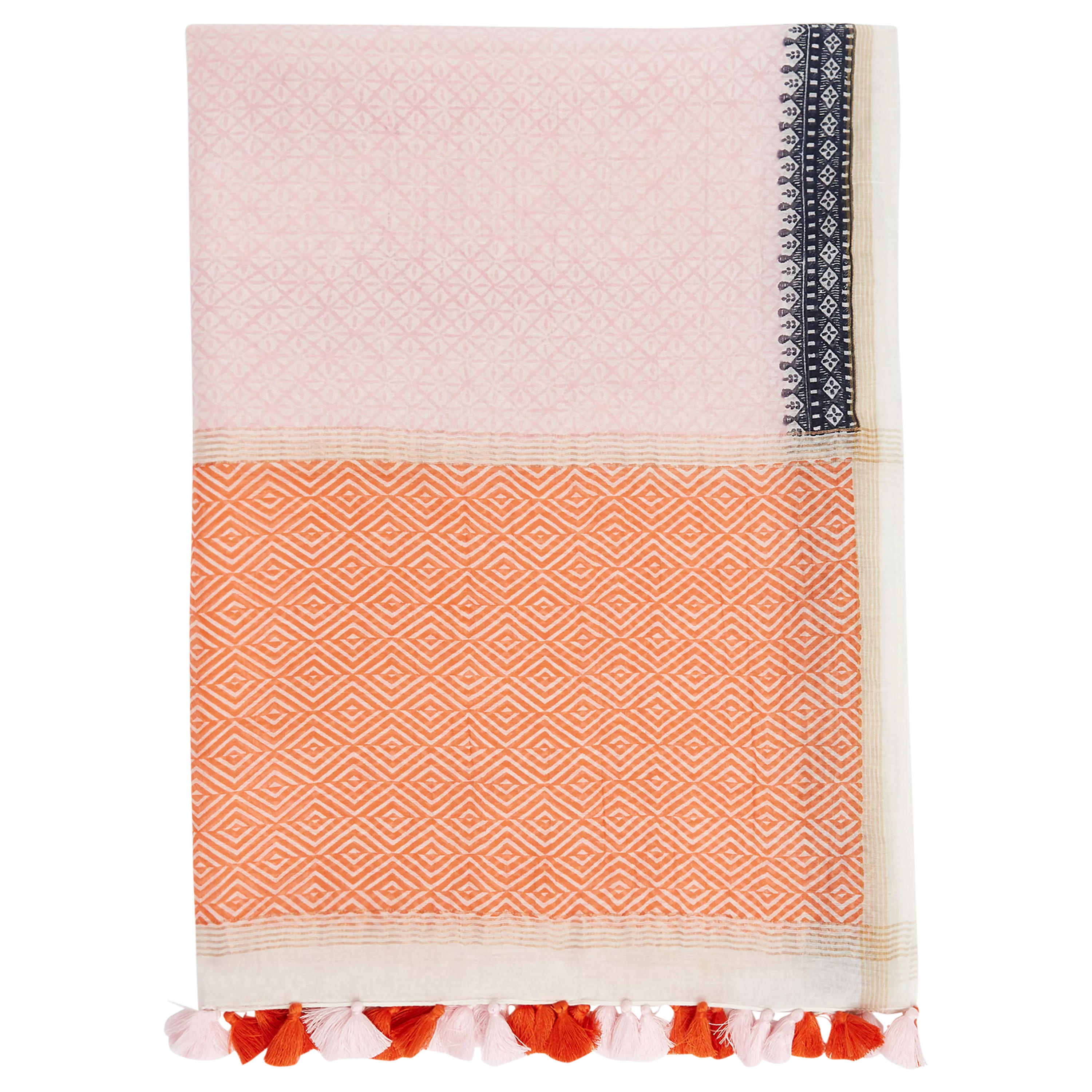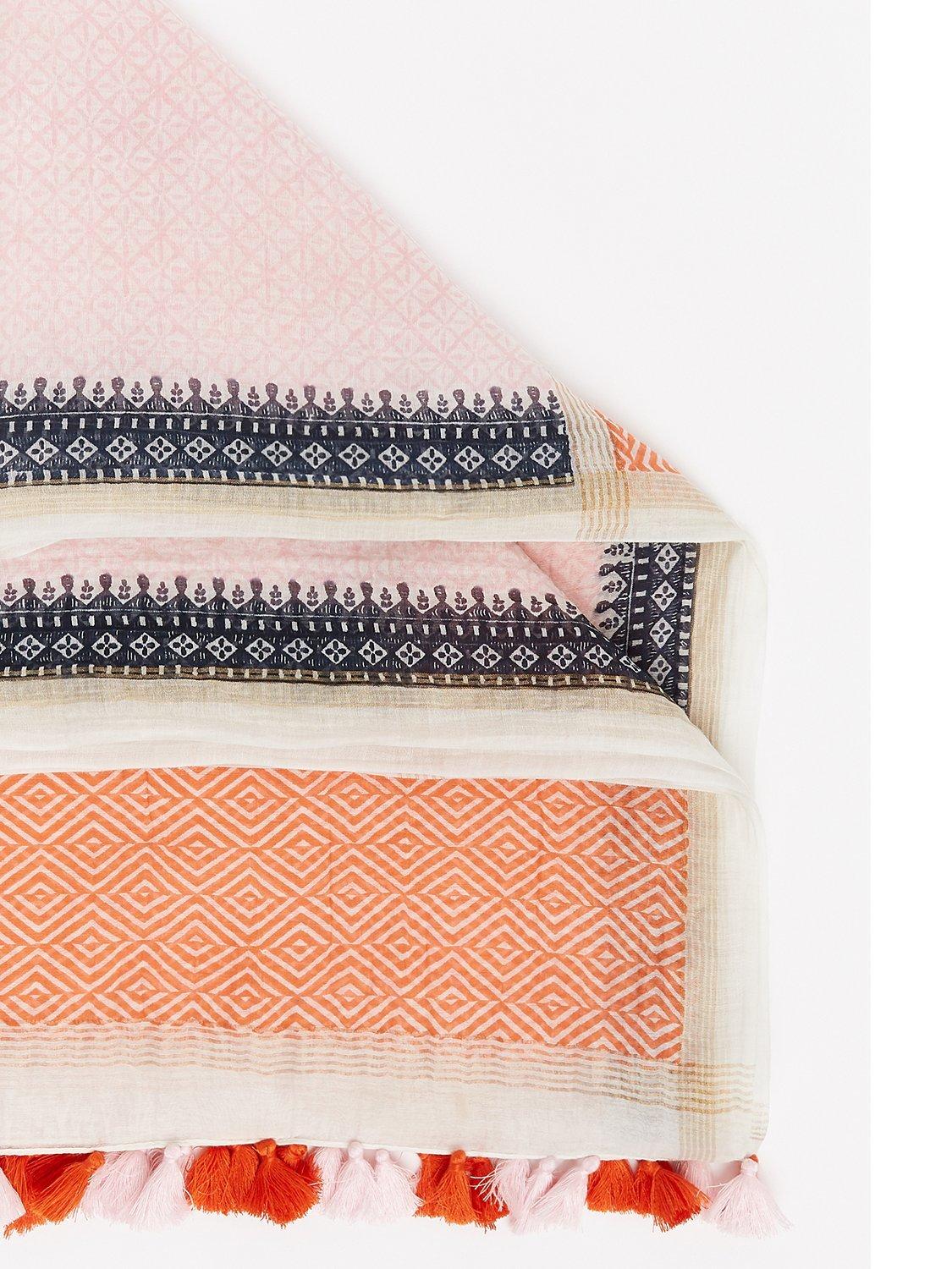 Perfect for keeping off the Spring chill, it features an abstract pattern and is finished with playful pom-poms.