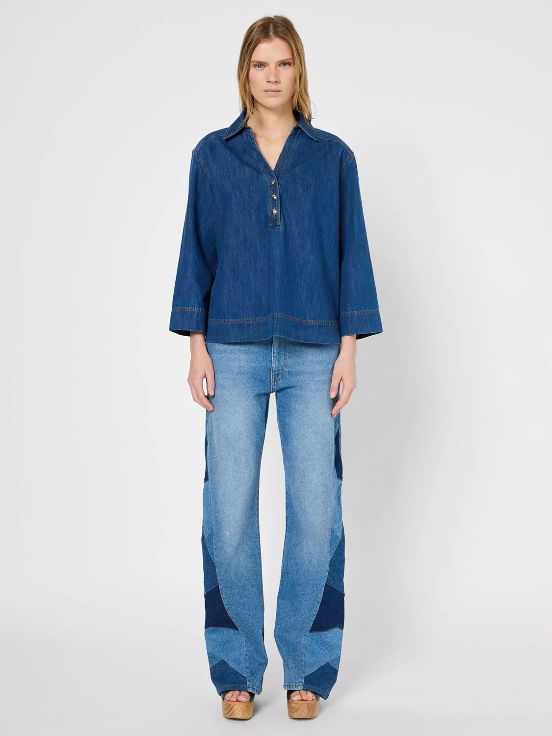 Bringing a neat addition to your wardrobe, this cotton-denim blouse from Gerard Darel is framed with a collar neckline and long sleeves.
