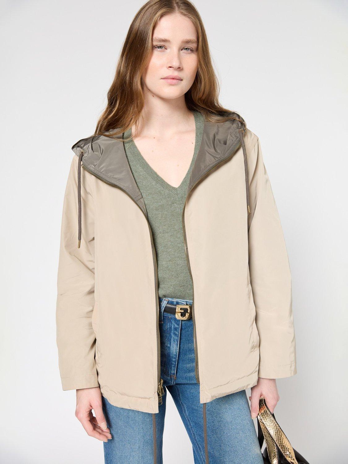 A practical option with its built-in drawstring hood and front zip, it is made from durable fabric that's fully reversible, giving you the option of two looks in one. Just choose between khaki or beige.