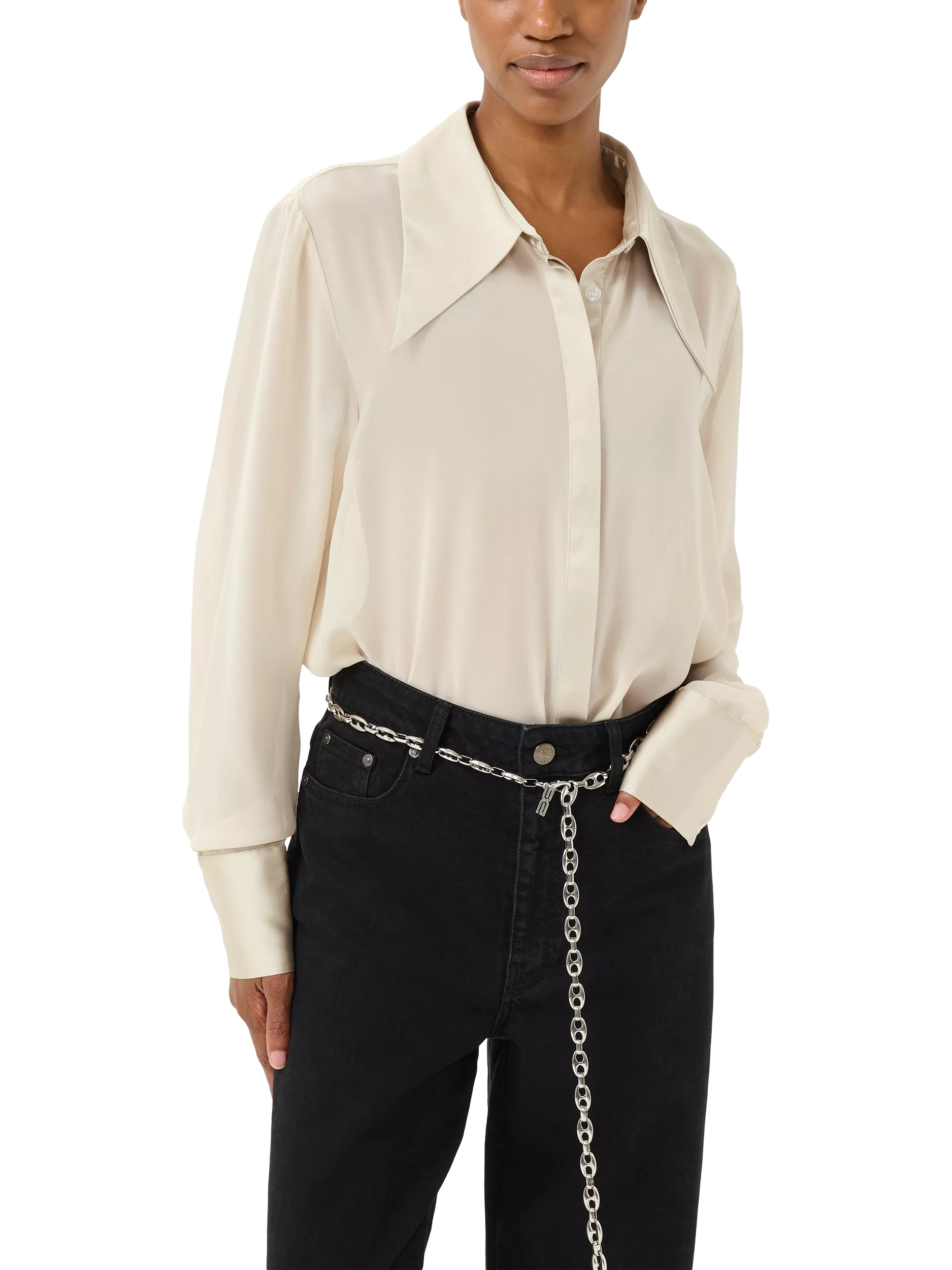 This shirt is crafted from recycled polyester and designed with an oversized collar. Tuck it into jeans or skirts to elevate your style.