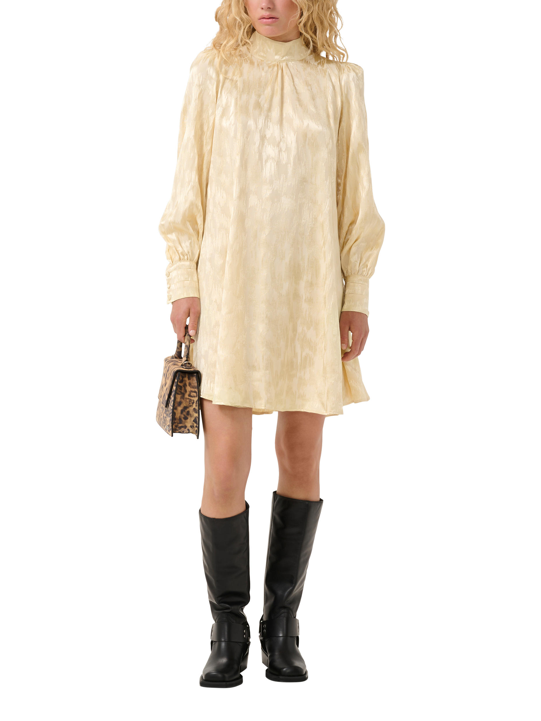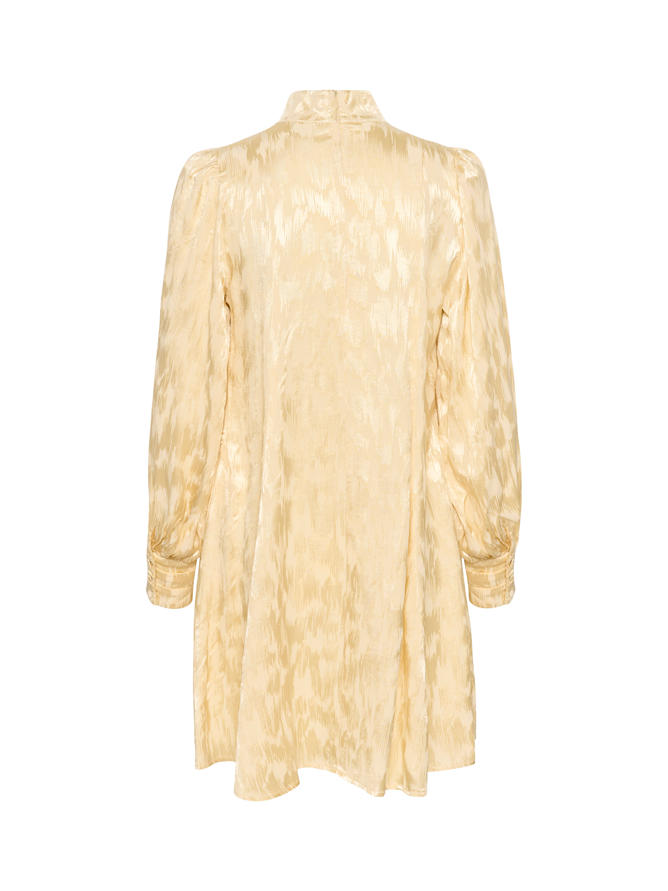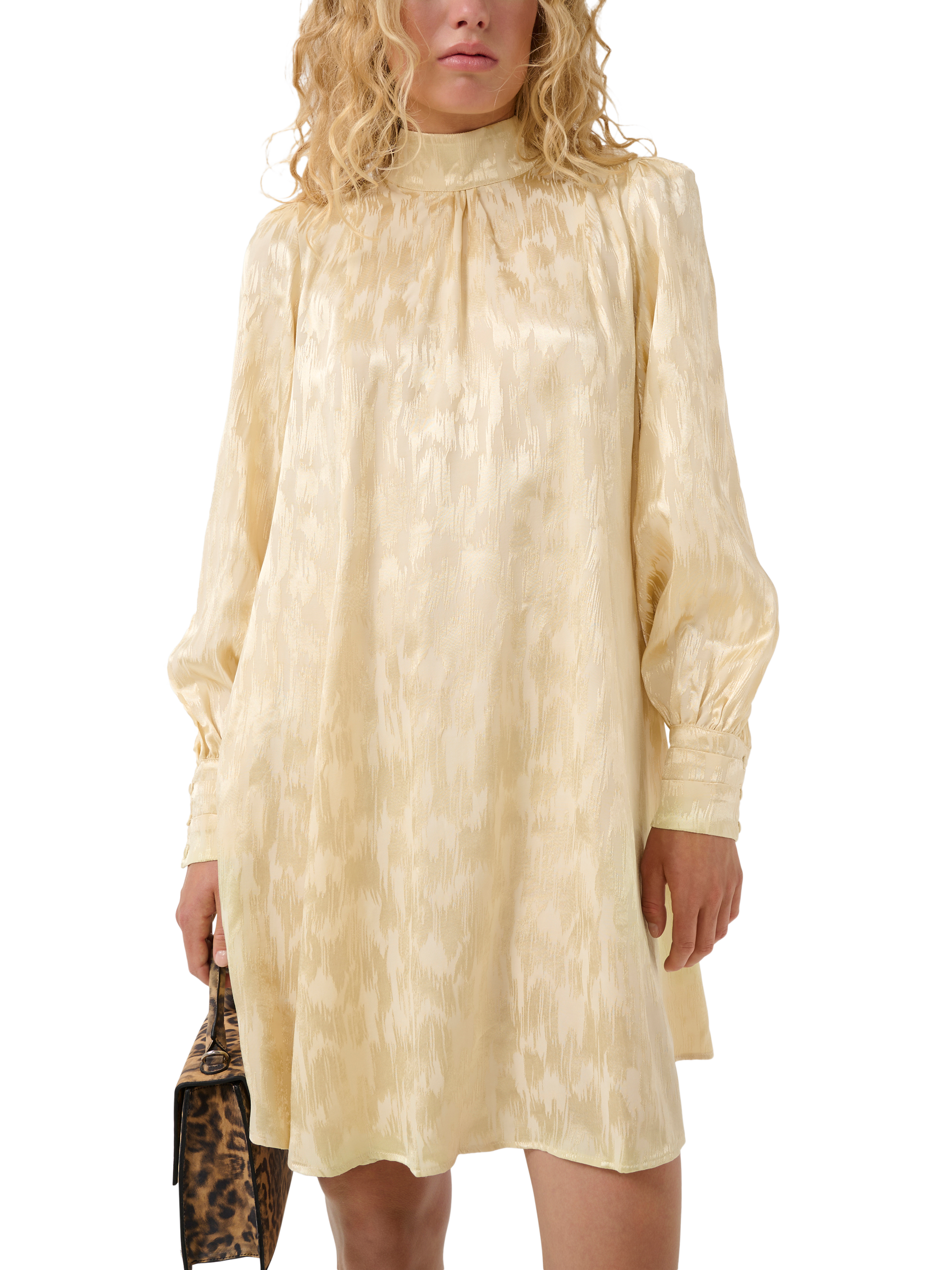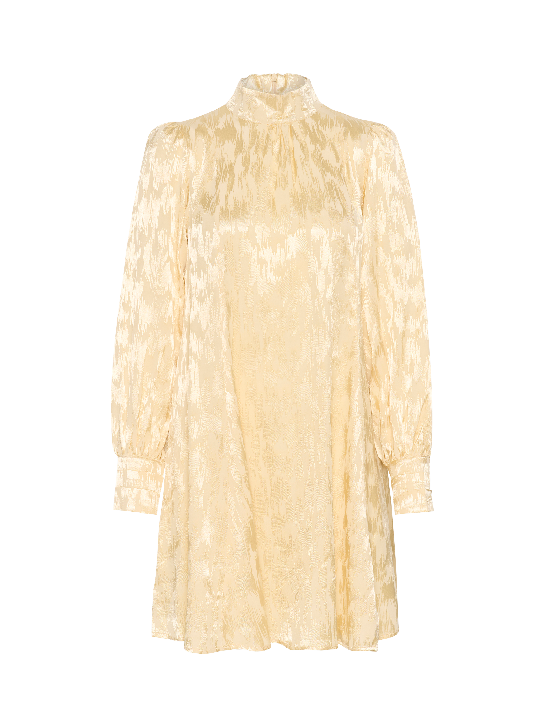 With a high collar, long sleeves and fitted cuffs, this chic dress is perfect for parties. It falls above the knee and also has pleated detail on the shoulders that adds structure.