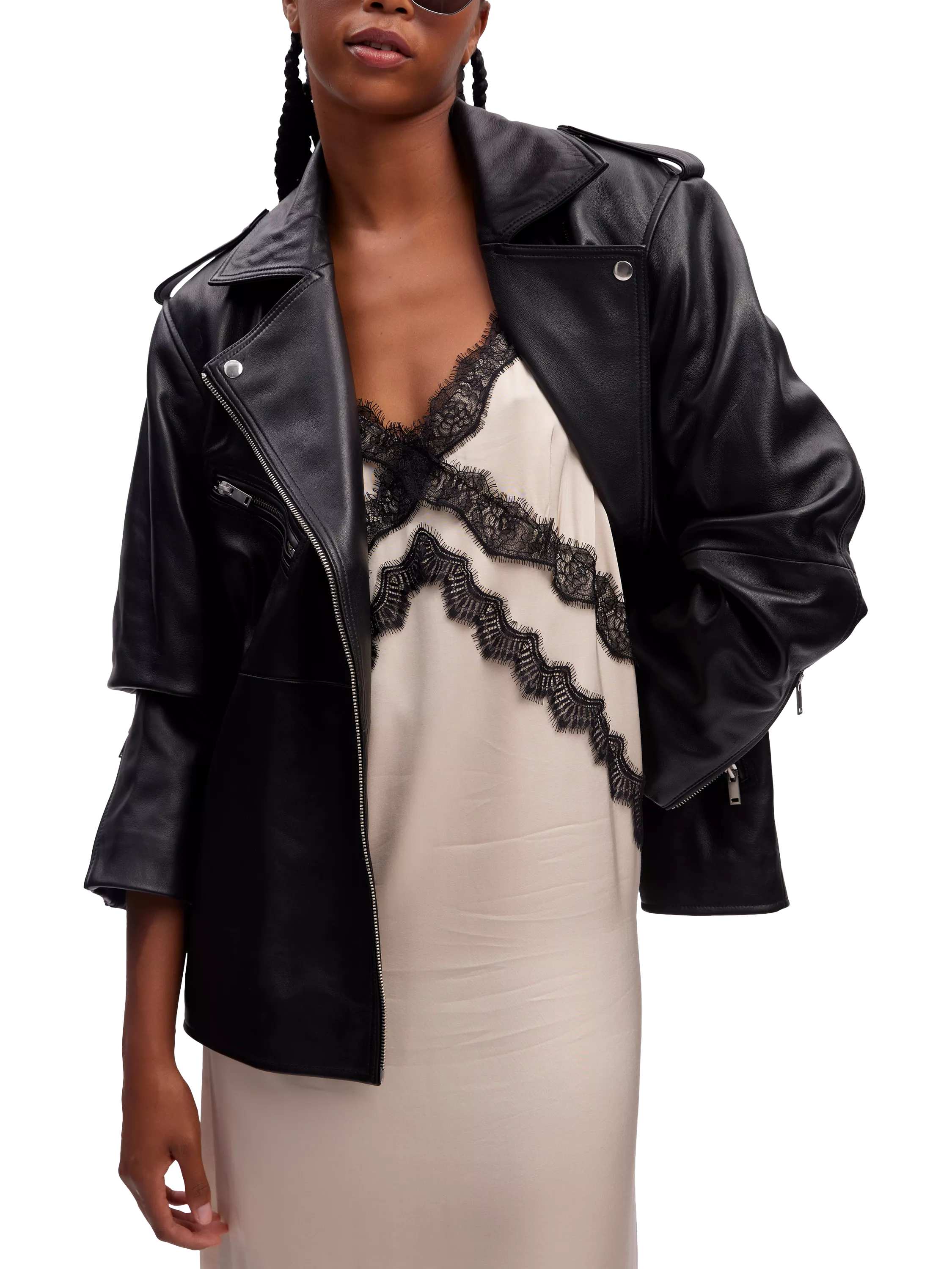The Naomi biker jacket is a cool leather style that will add an edge to any outfit. It has an off-centre zipper fastening and a button-down notch lapel. The jacket has an oversized fit, and the sleeves are long with buttoned shoulder tabs and zippers. It is cut below the hips, and it has slanted front pockets and a chest pocket, all with zipper fastenings.
