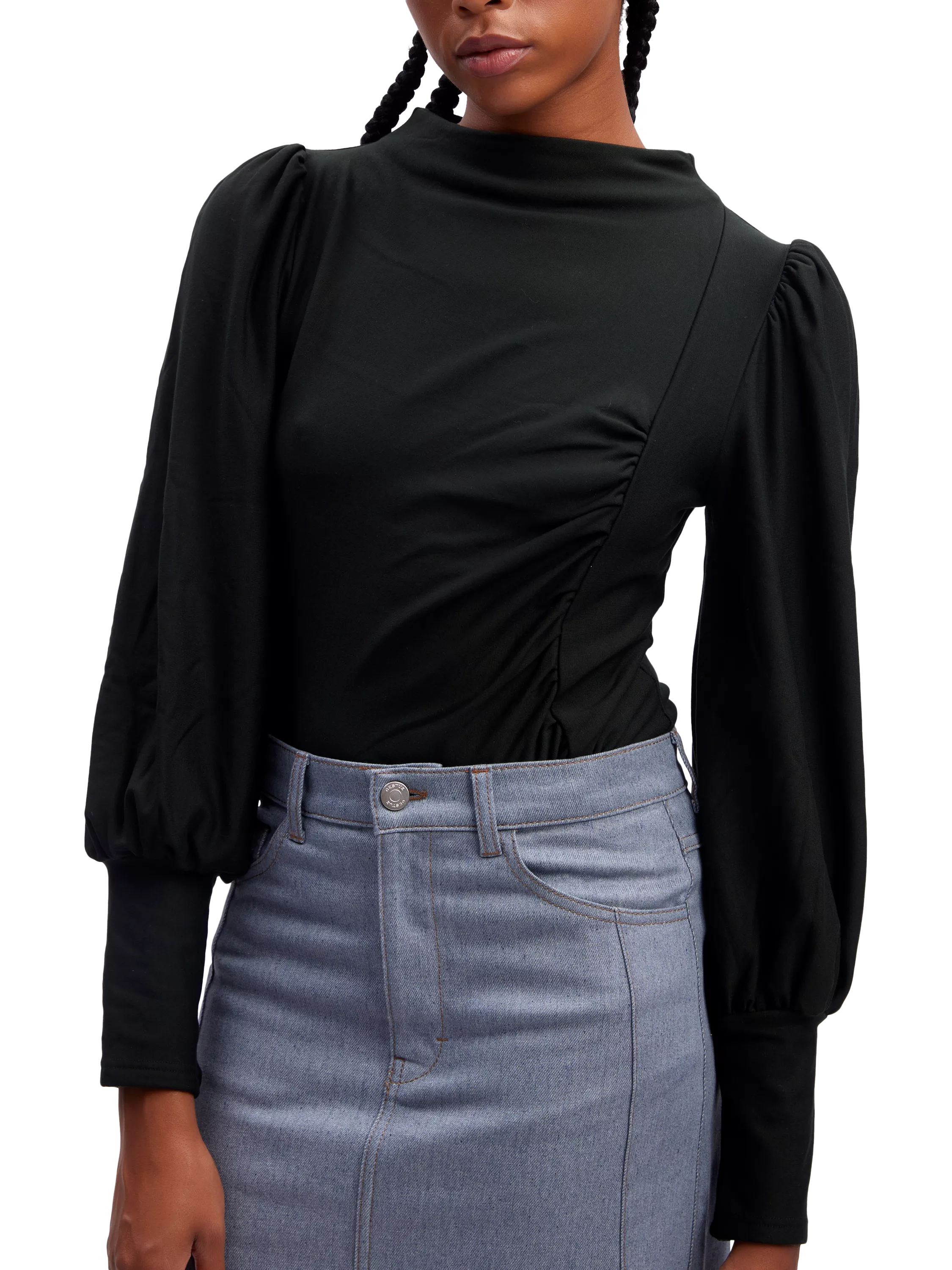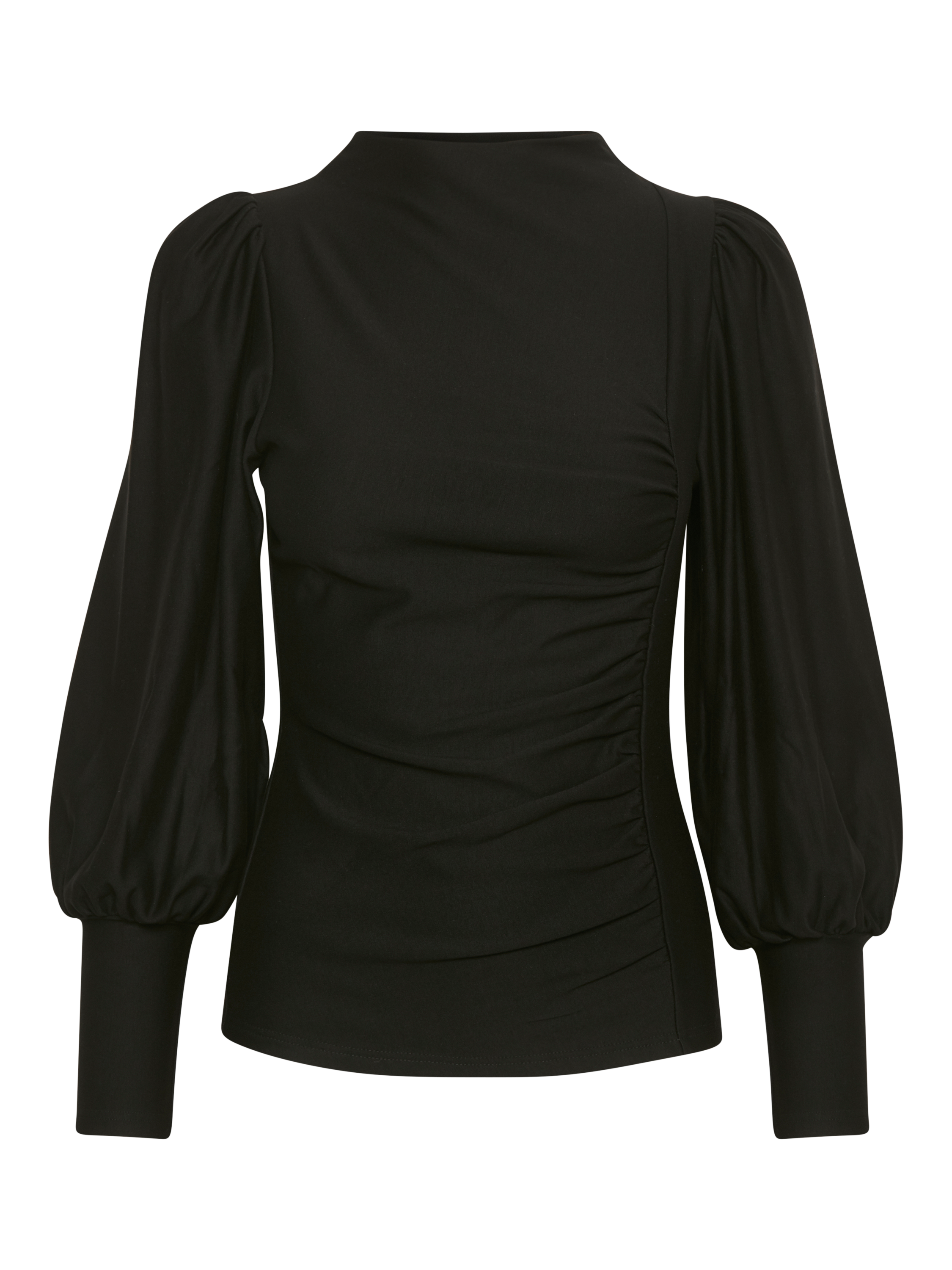 The Rifa blouse is a feminine and flattering top with lots of great details. It has a slash neck and a slim fit with pleats down the left side of the front. The sleeves are long and voluminous puff sleeves, and they are gathered in a wide cuff. The blouse is cut at the hips, and it is made in a soft and stretchy fabric.
