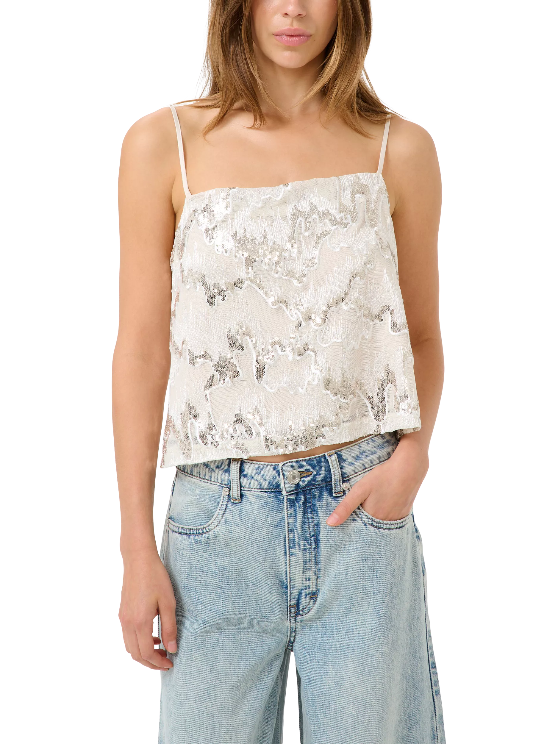 With a wavy metallic sequin design, this cami from Gestuz is framed with a modern square neckline and adjustable straps. The perfect party piece.