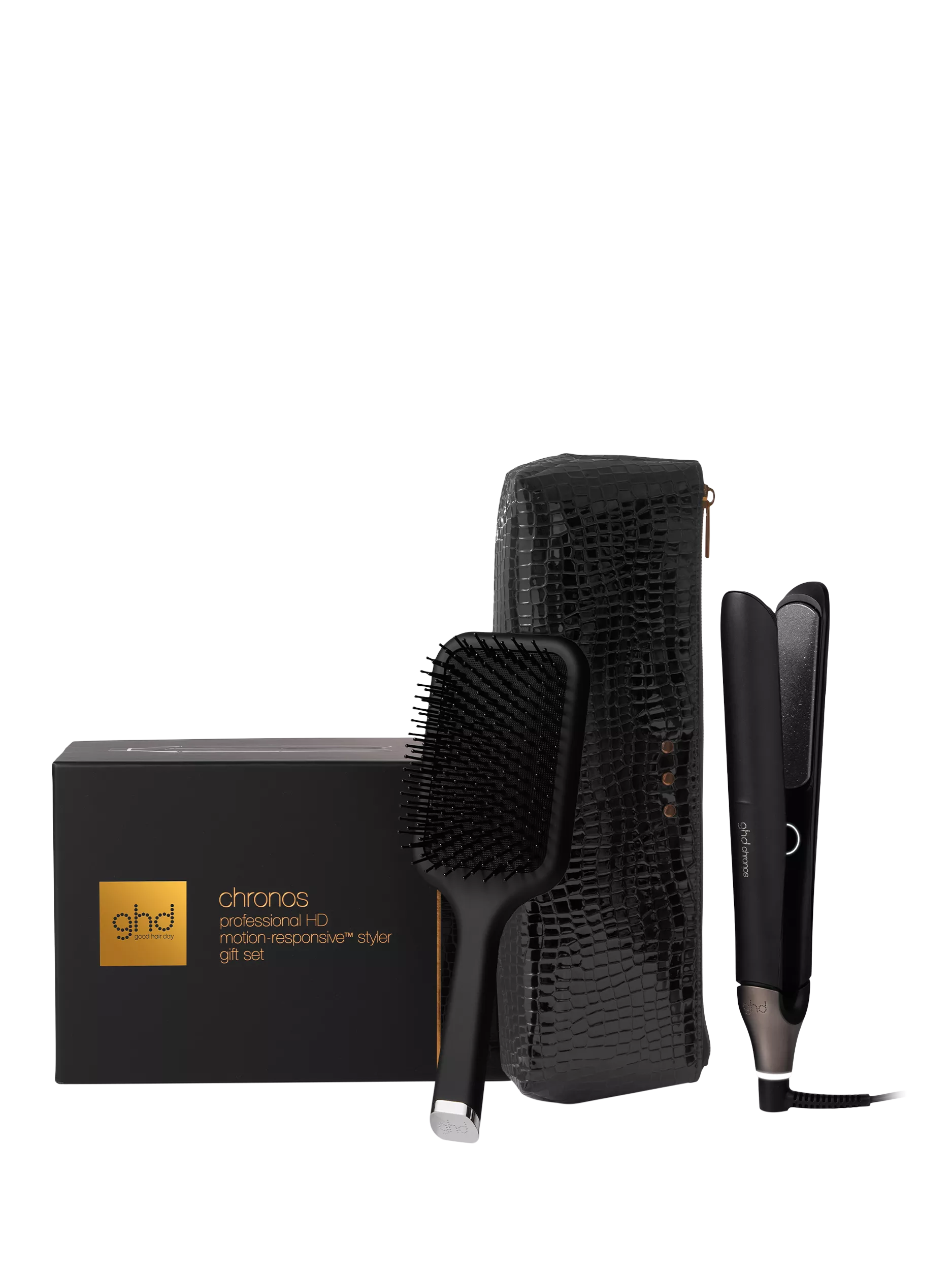 Featuring our #1 styler – ghd Chronos,TM professional HD motion-responsive styler – this luxurious gift set is completed with the All-Rounder Paddle Brush and a heat-resistant bag.¹