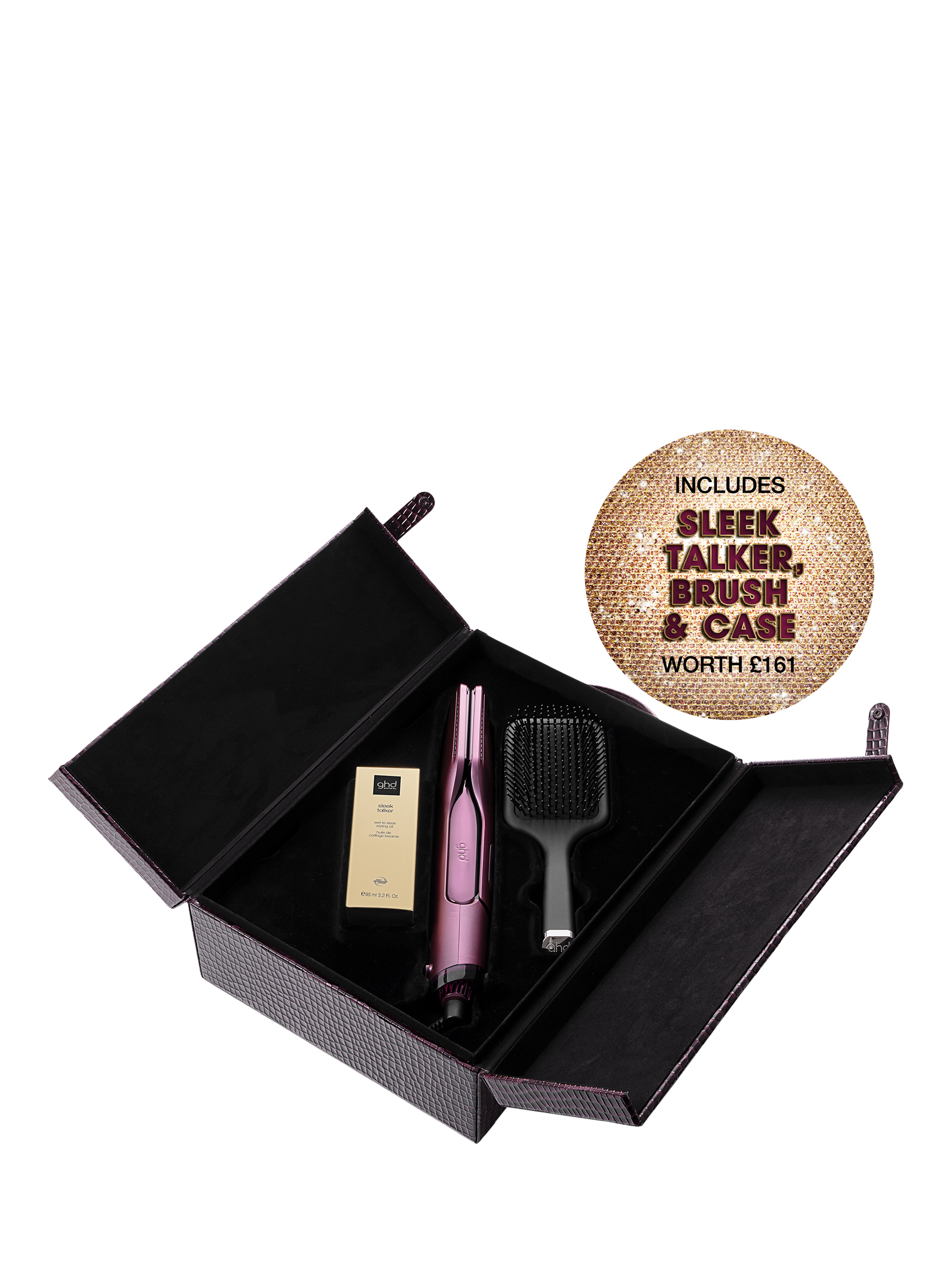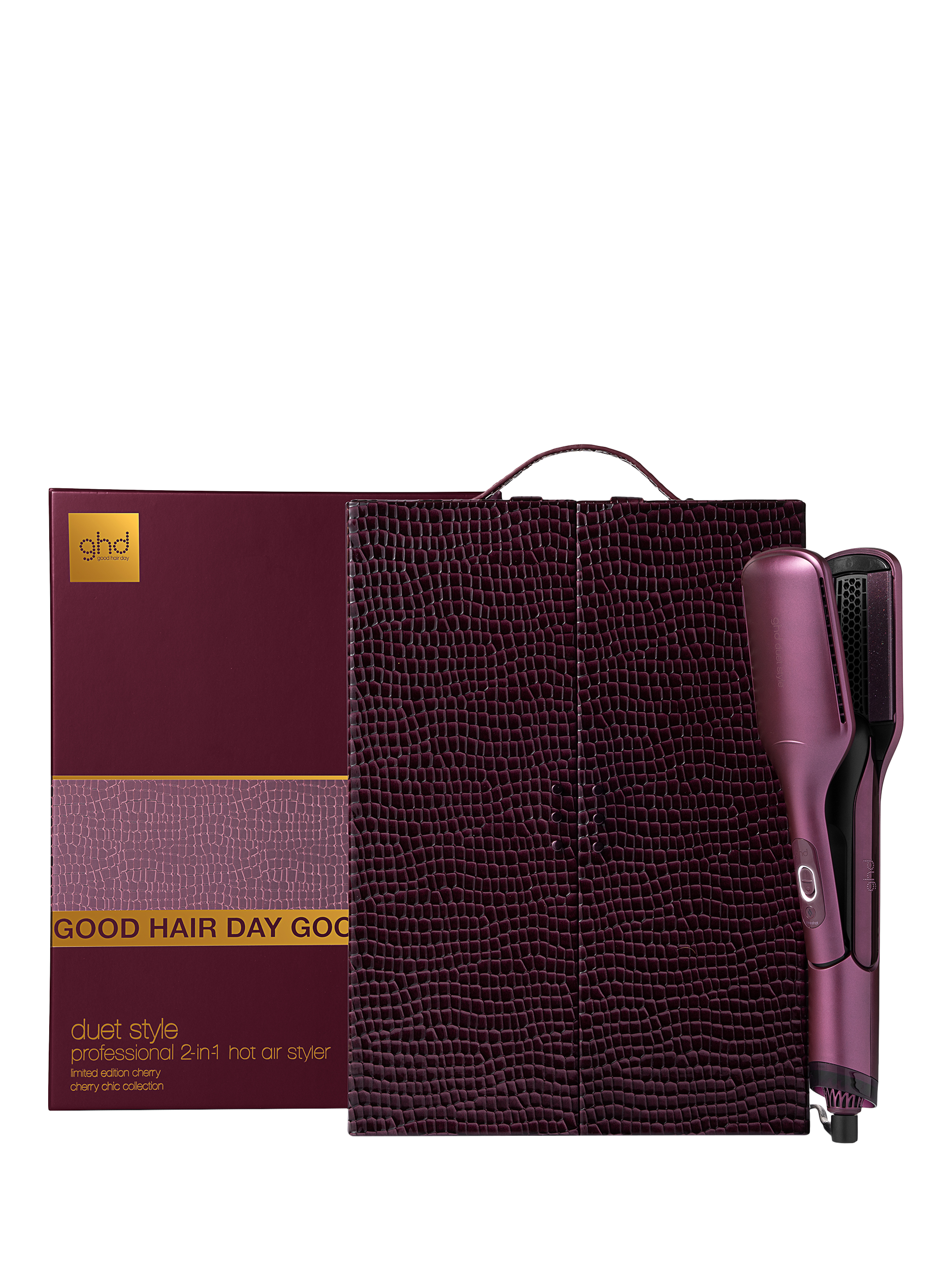 Check-in to glamour this festive season with the ghd cherry chic collection. Inspired by the allure of old-school luxury , this limited edition collection is dressed in a luxurious cherry hue - colour that evokes both decadence and desire. Whether gifting or indulging, elevate every hair moment with ghd Duet Style professional 2-in-1 hot air styler, ghd Sleek Talker™ wet to sleek styling oil, ghd The All-Rounder Paddle Brush, and a travel-inspired vanity case¹ that turns your routine into a ritual.