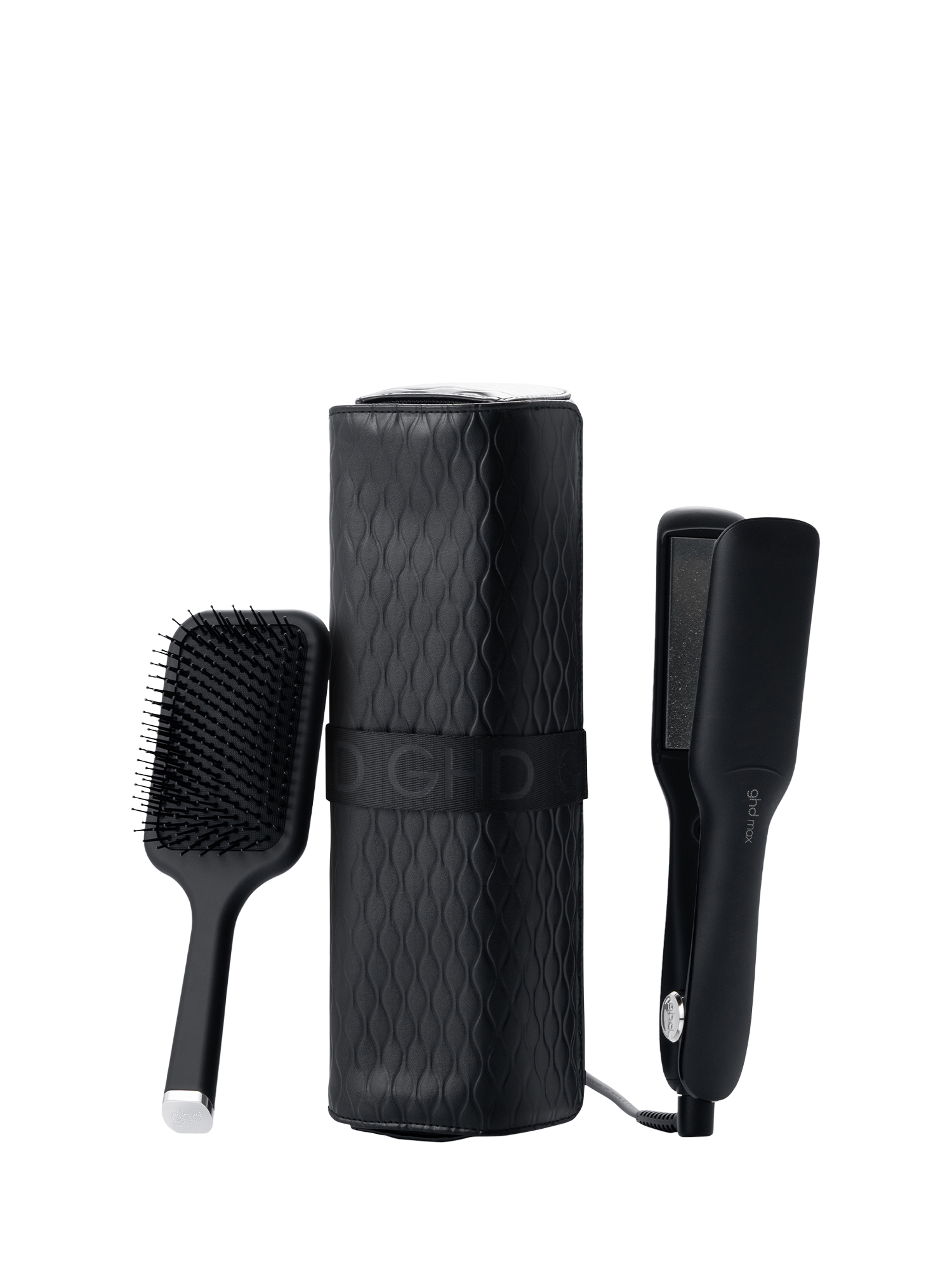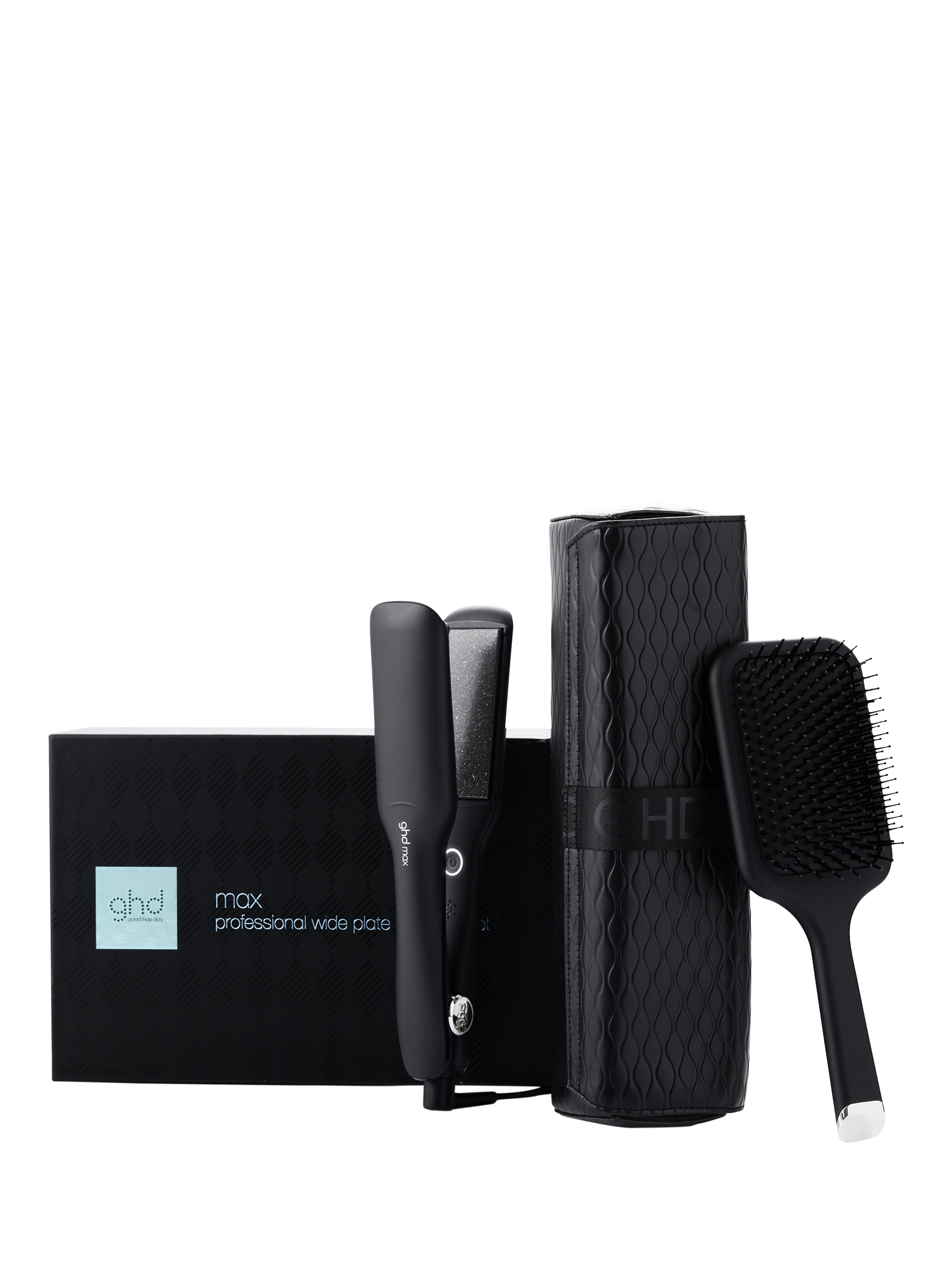 ghd Max Wide Plate Hair Straightener now available in a Luxury Gift Set complete with Paddle Hair Brush and Heat-Resistant Styler Bag.