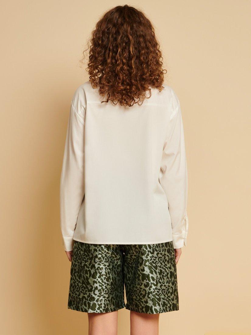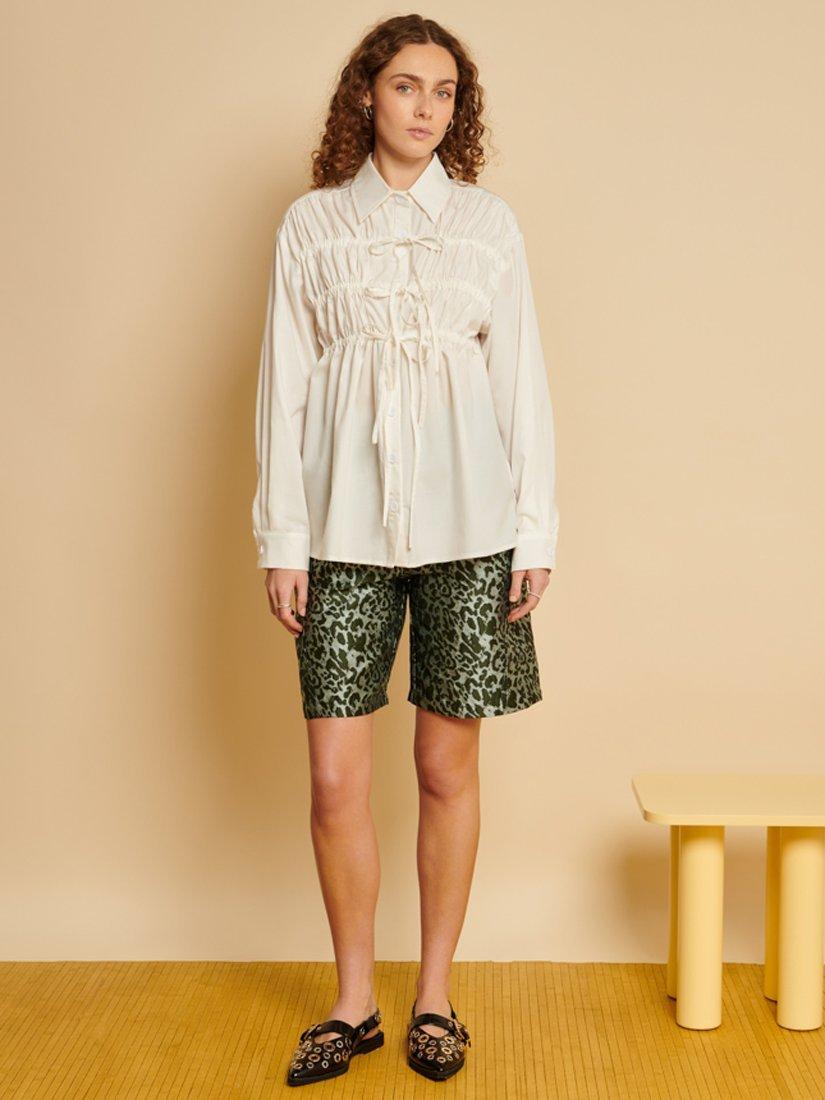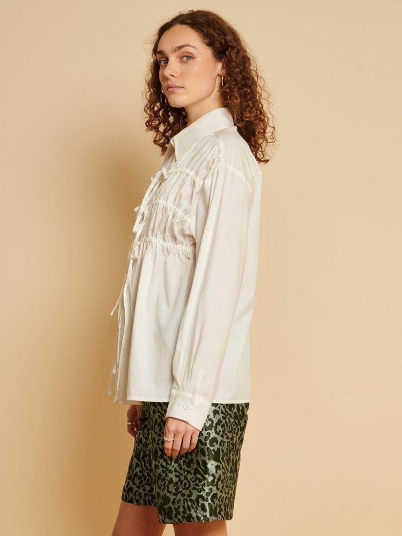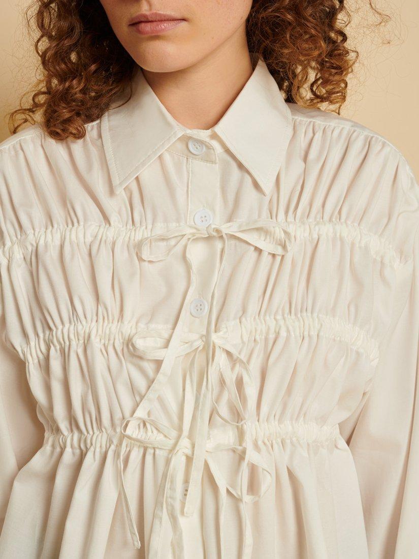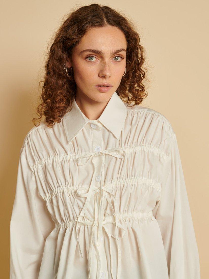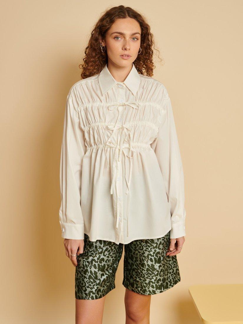 Oversized shirt in a soft cotton feel fabric. Featuring statement adjustable drawcords and ties at the chest. Detailed with a button fastening.