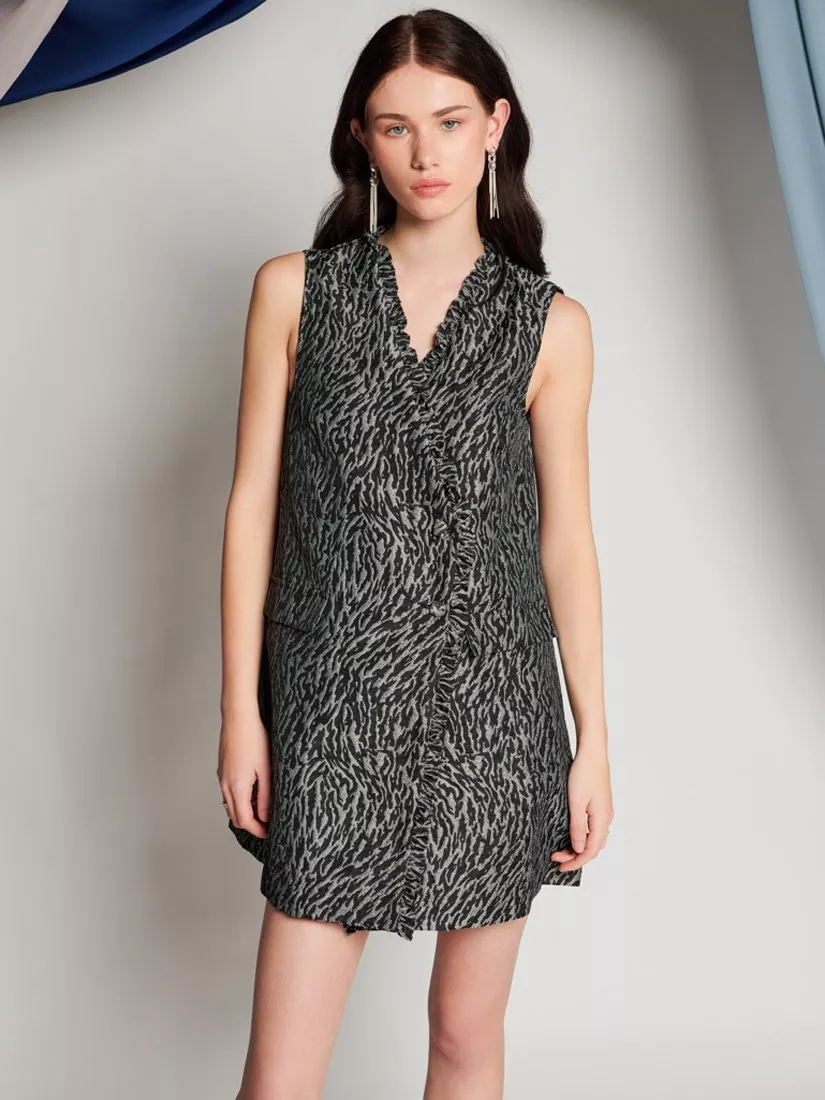 A mini wrap dress in an abstract jacquard fabric. This sleeveless style features a gathered ruffle around the neckline and front opening. Detailed with pocket flaps and fastened with cover buttons.