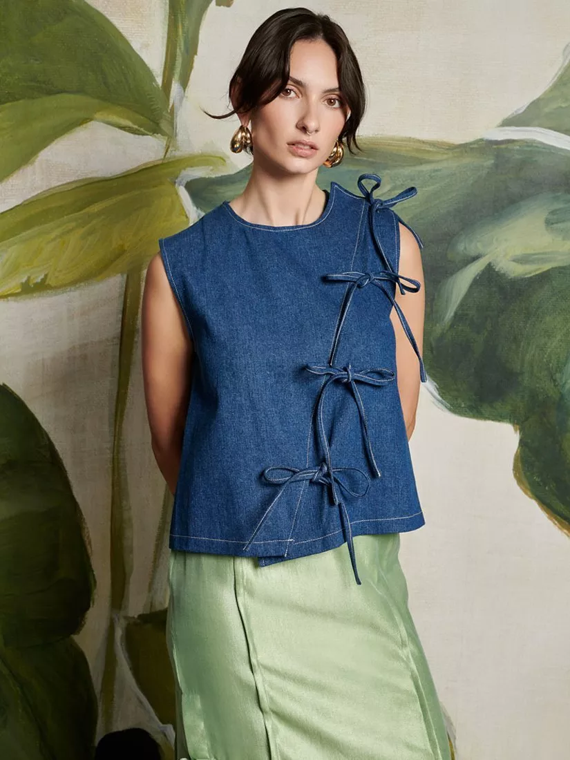 Loose fit wrap top in a denim fabric. Featuring a tie front and detailed with contrast topstitching.
