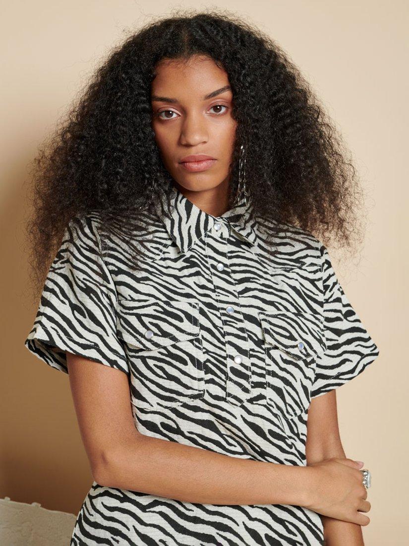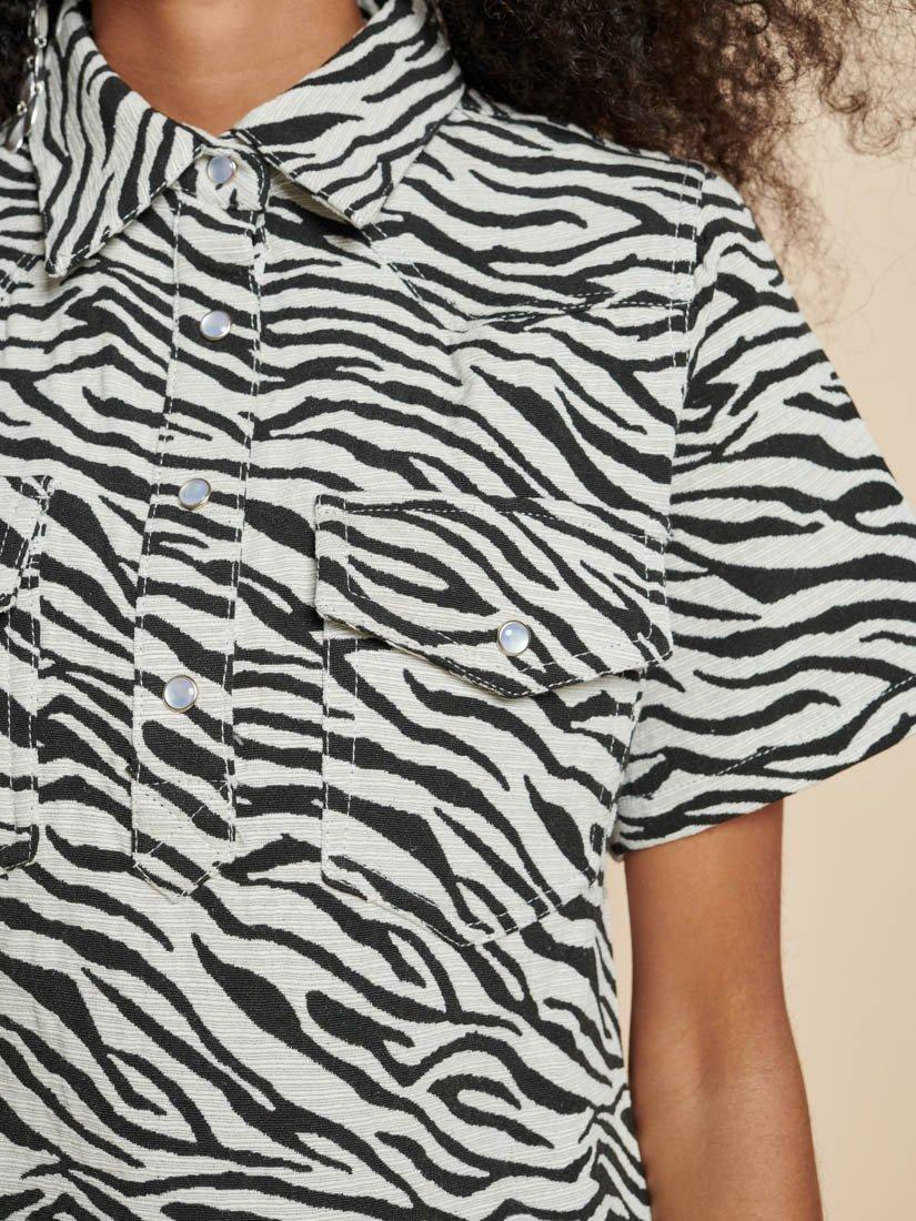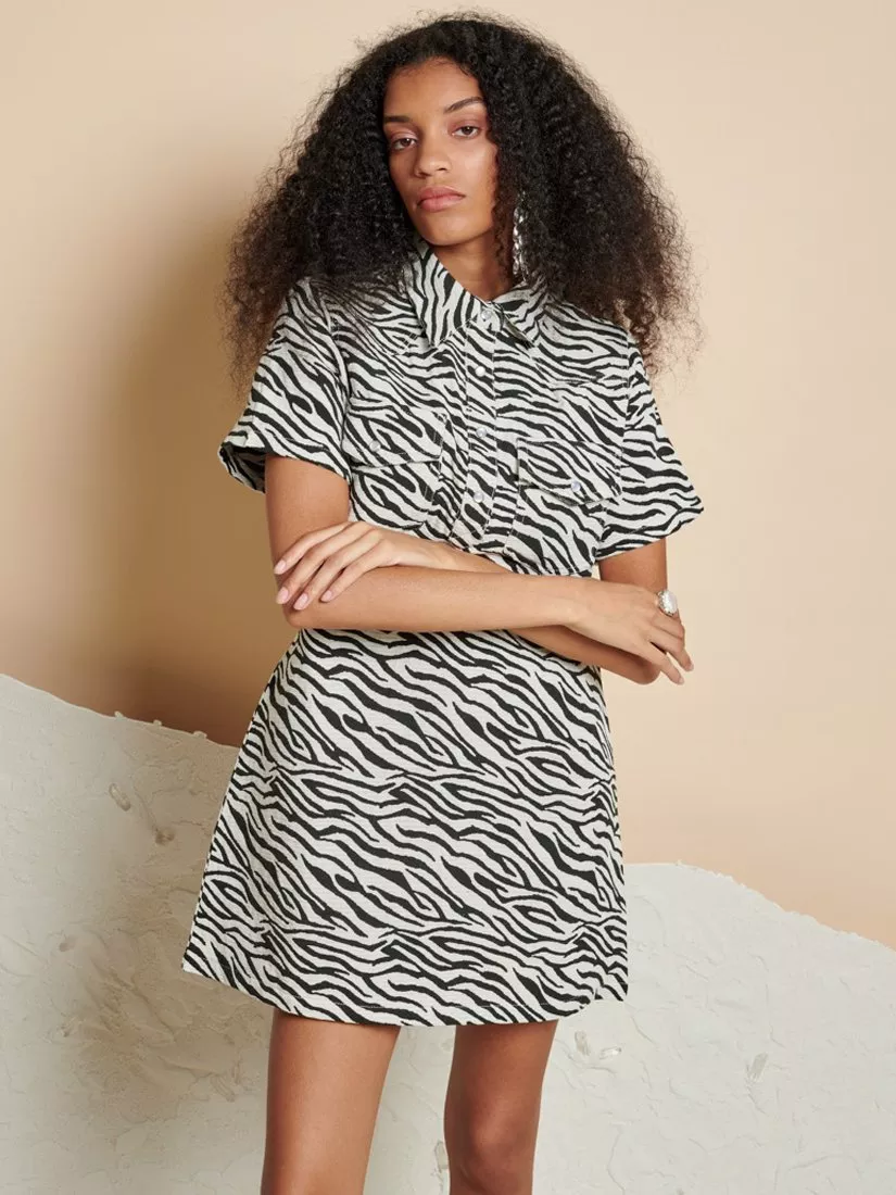 Mini dress in a zebra jacquard fabric. Featuring shaped western yoke seams and a 1/4 placket. Detailed with pearlescent poppers to fasten.