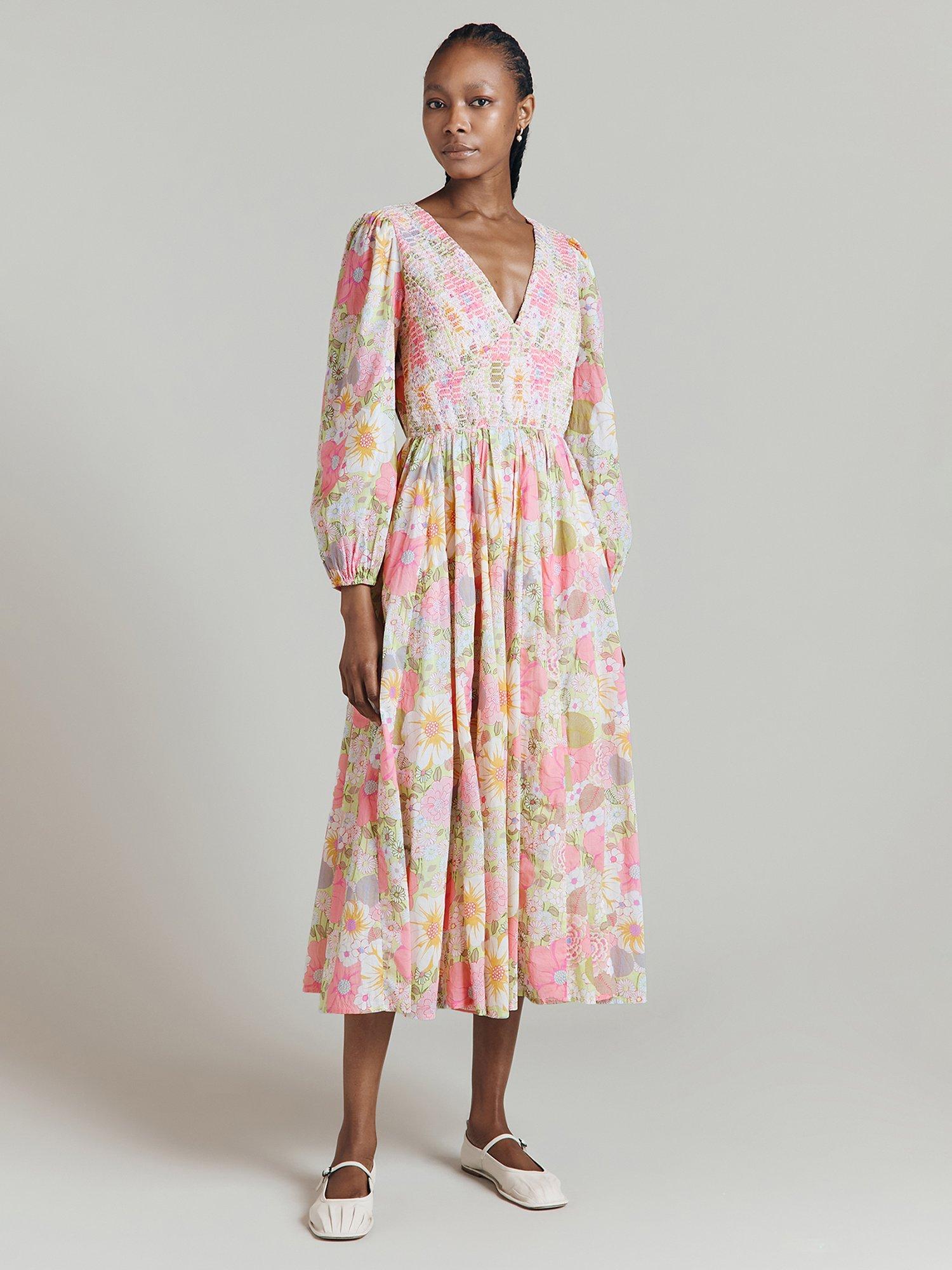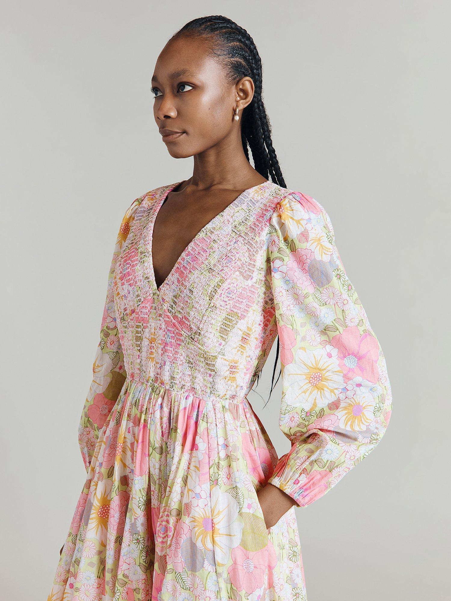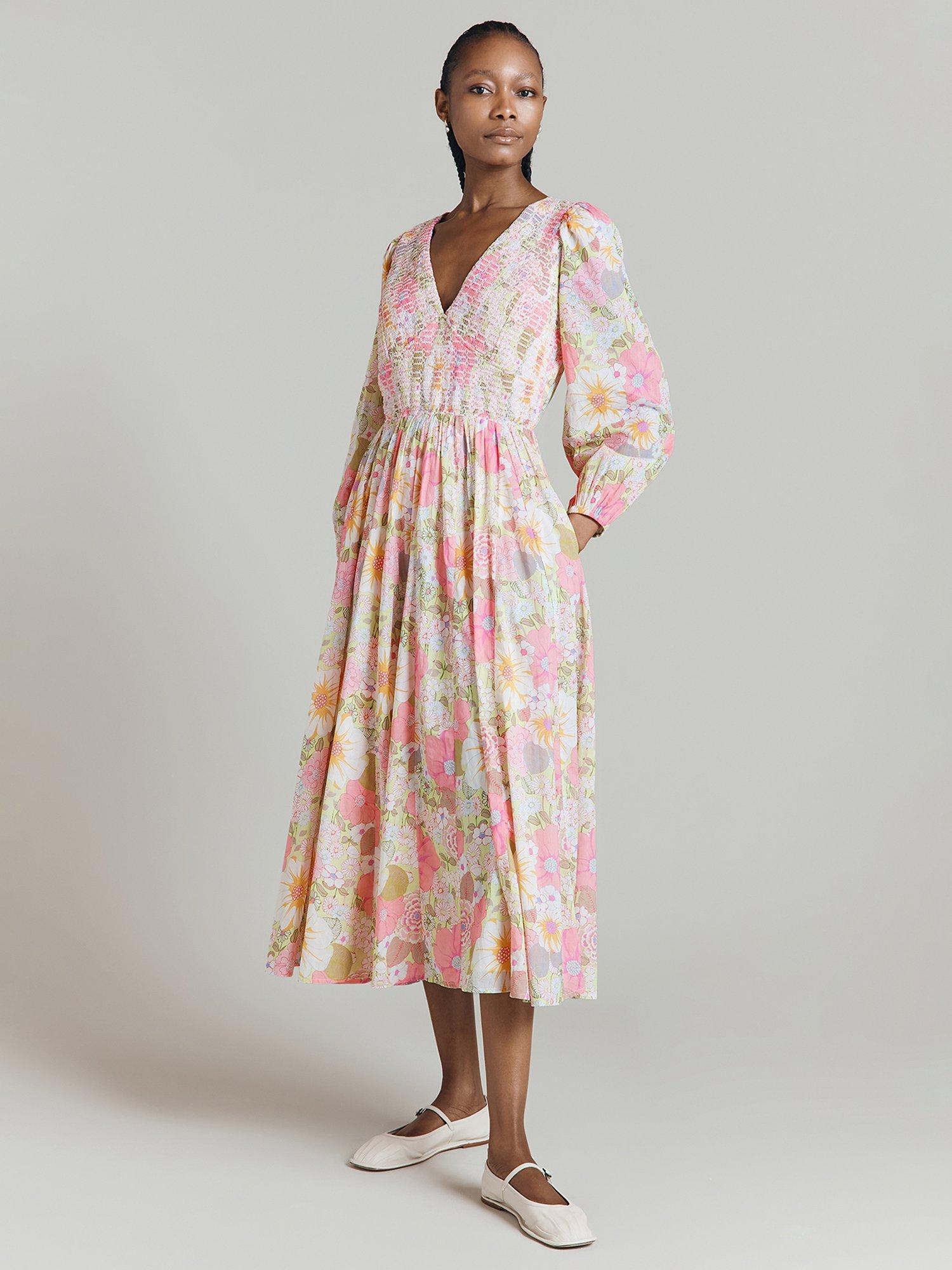 We love all florals, but especially a vintage floral and Adeline's 60s-inspired print is a joyful addition to any wardrobe. Featuring a deep V-neck with shirring detail across the bodice, long blouson sleeves and gathers at the waist for volume, this lightweight cotton dress will see you through countless summer days with ease. Concealed side-zip fastening.