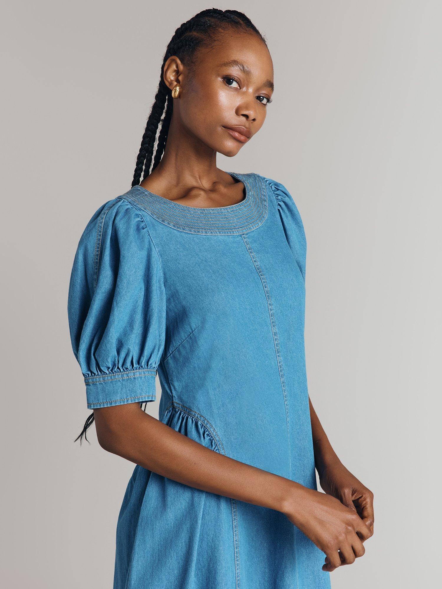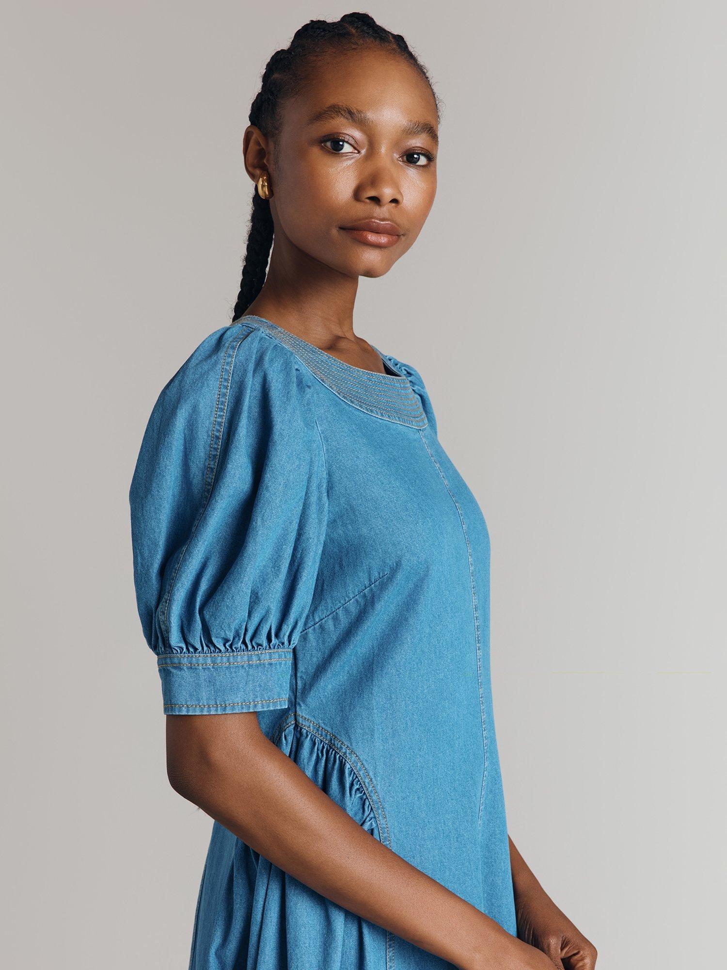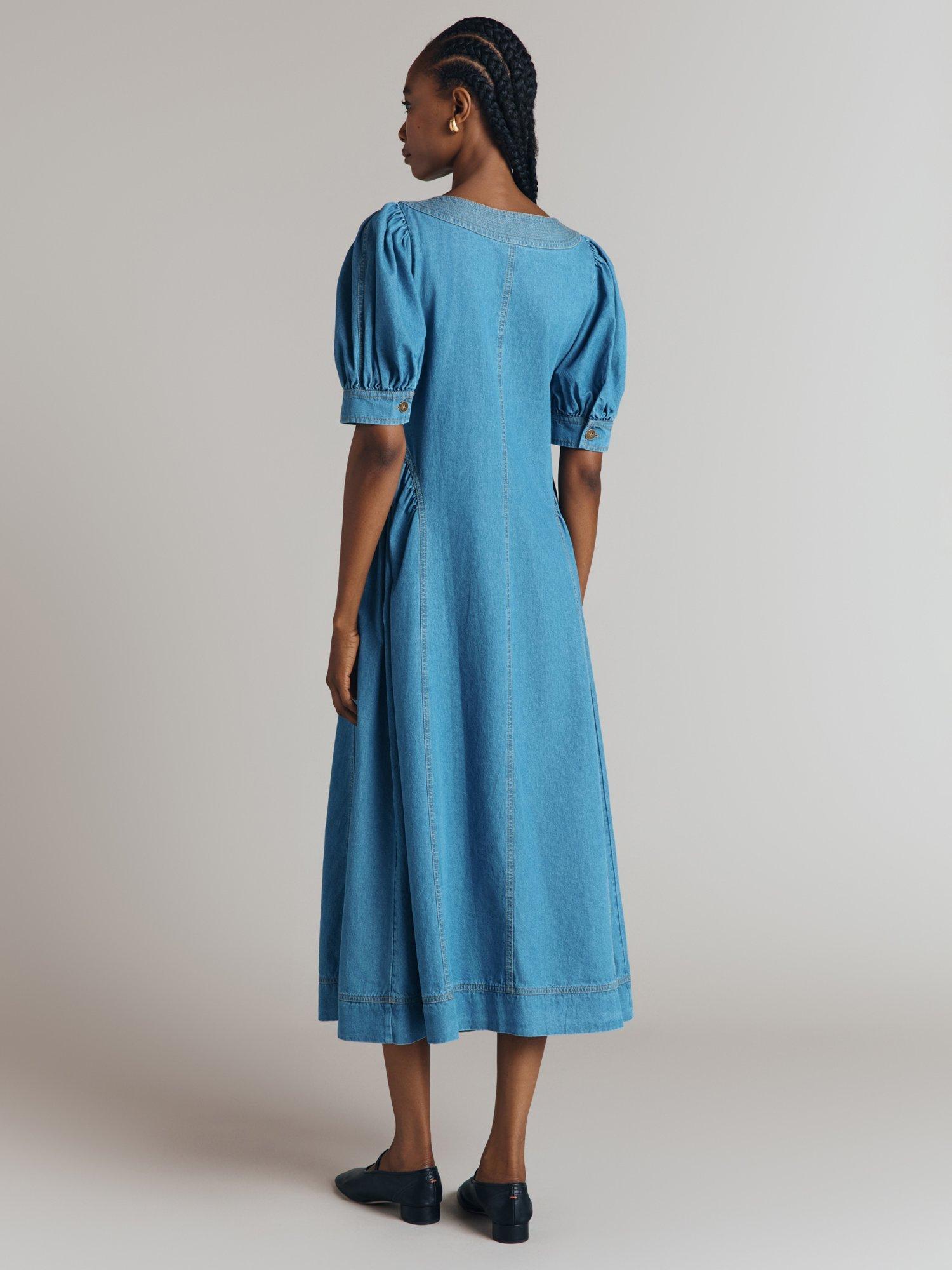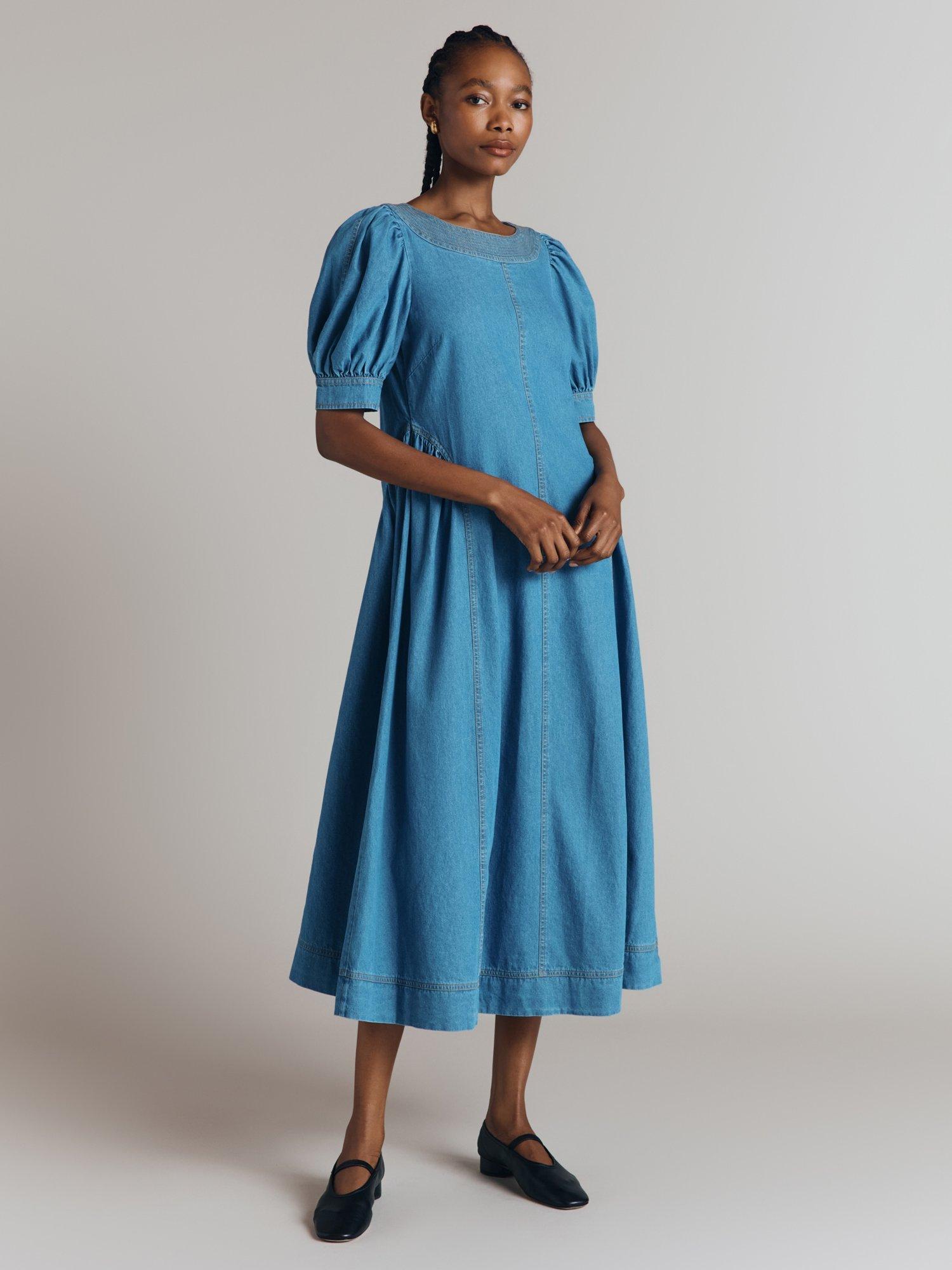 The versatility and timelessness of denim can't be overstated, so a denim dress is always a wise investment. We've created Agnes, a long midi dress that will see you through all seasons. Gathered princess seams on the skirt create a feminine shape, while a simple round neck and short puffed sleeves ensure easy wearability. Contrast stitching and statement seams throughout nod to style signatures traditionally found on jeans.