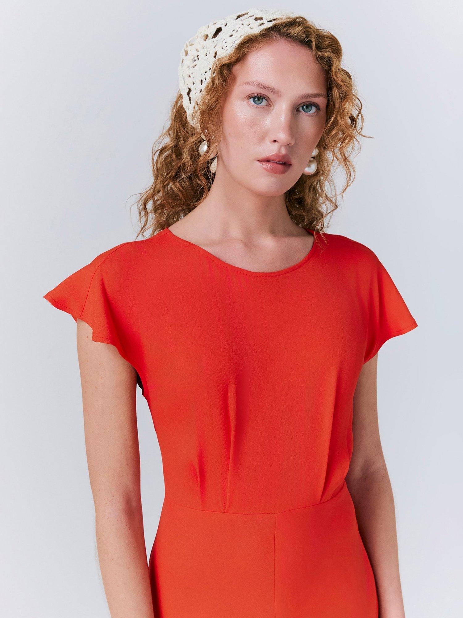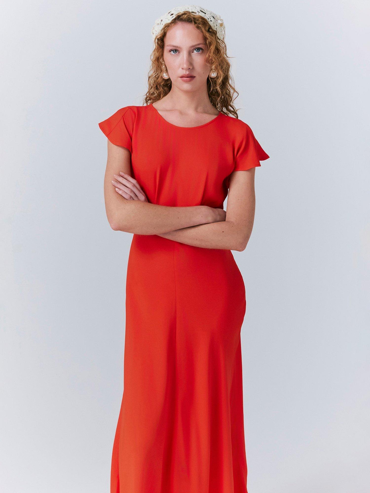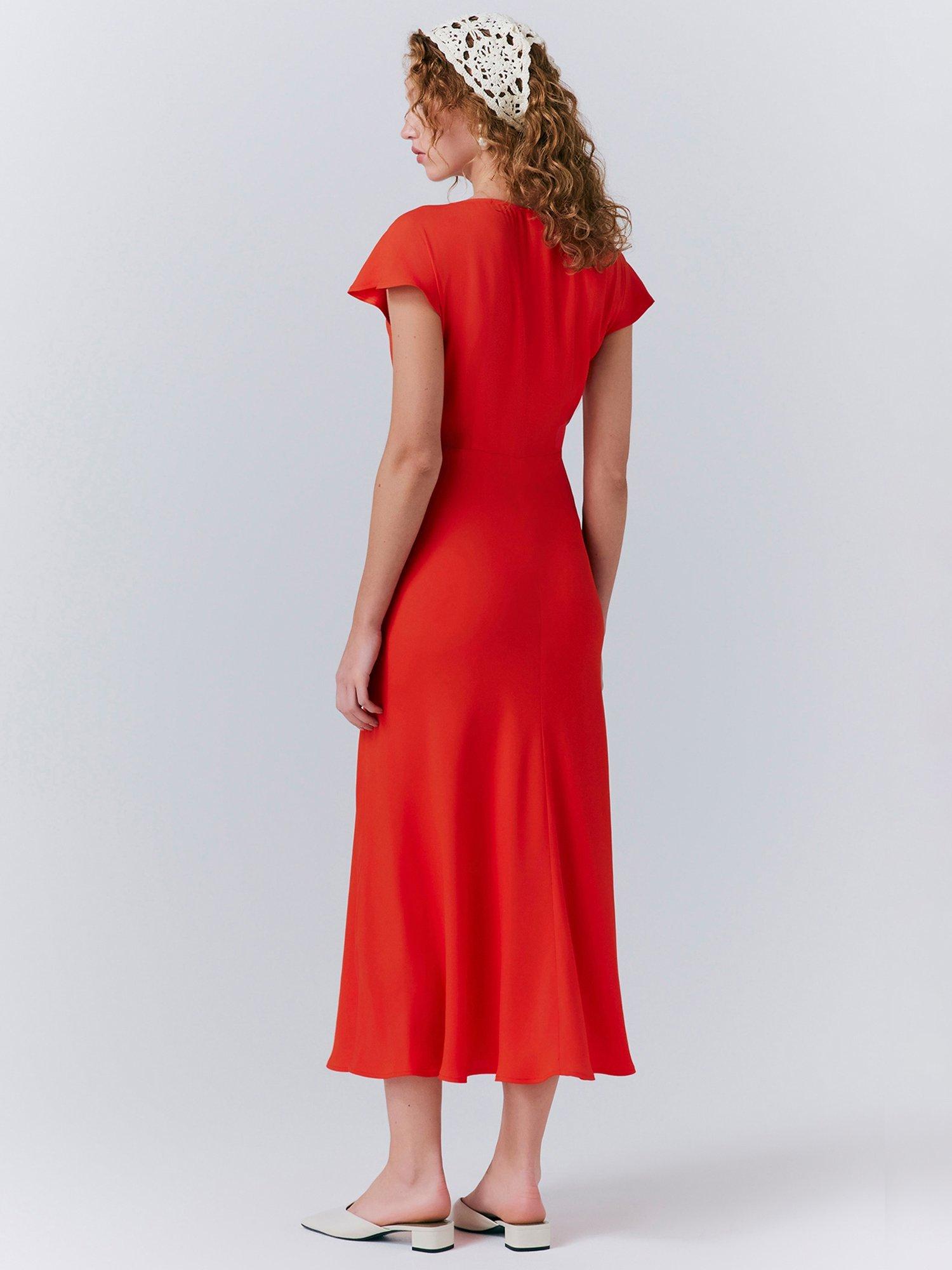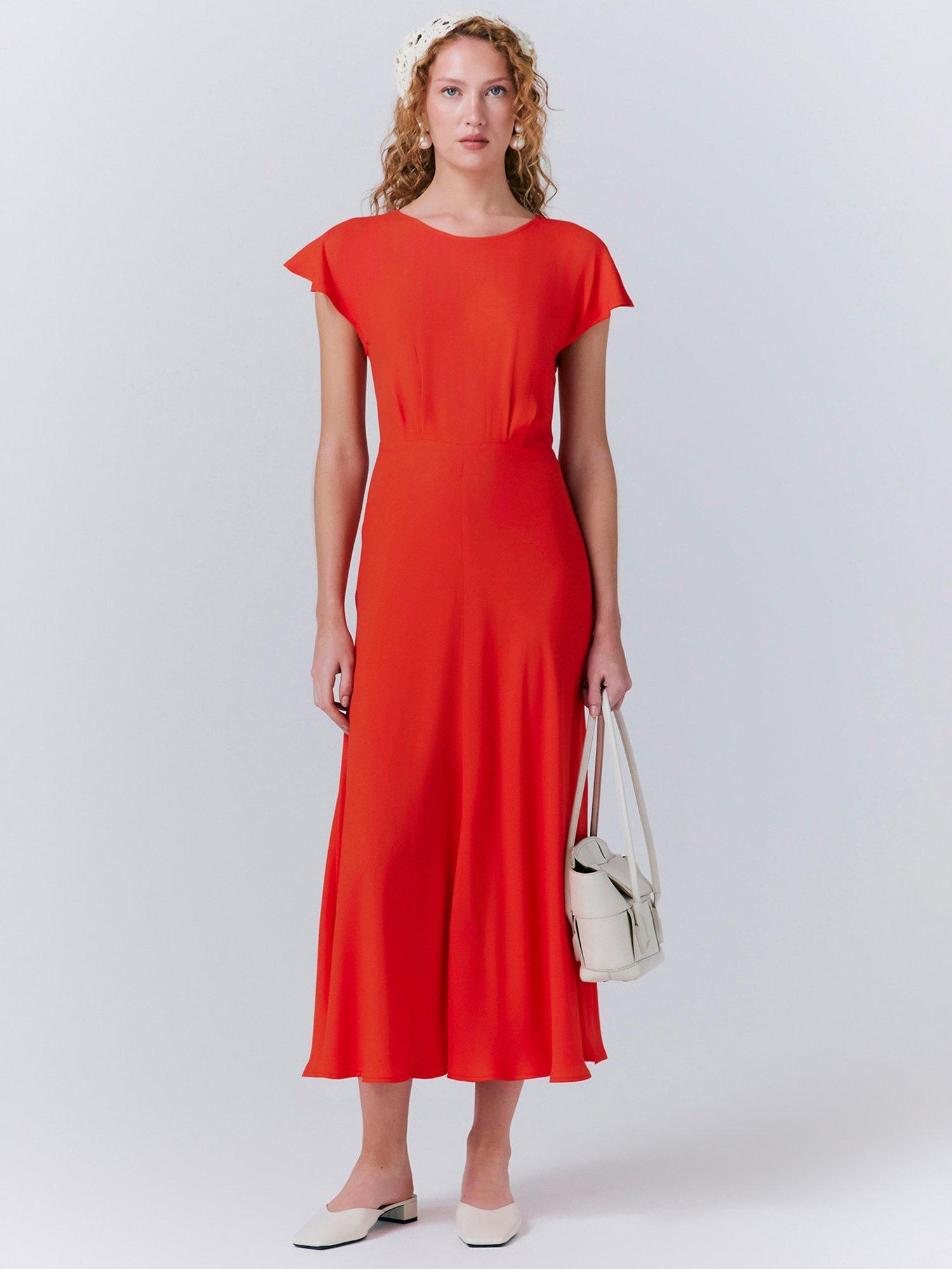 The Alora from Ghost is a chic, versatile midi dress, featuring a flowing A-line skirt, gently fitted bodice, round crew neck and delicate grown-on short sleeves.