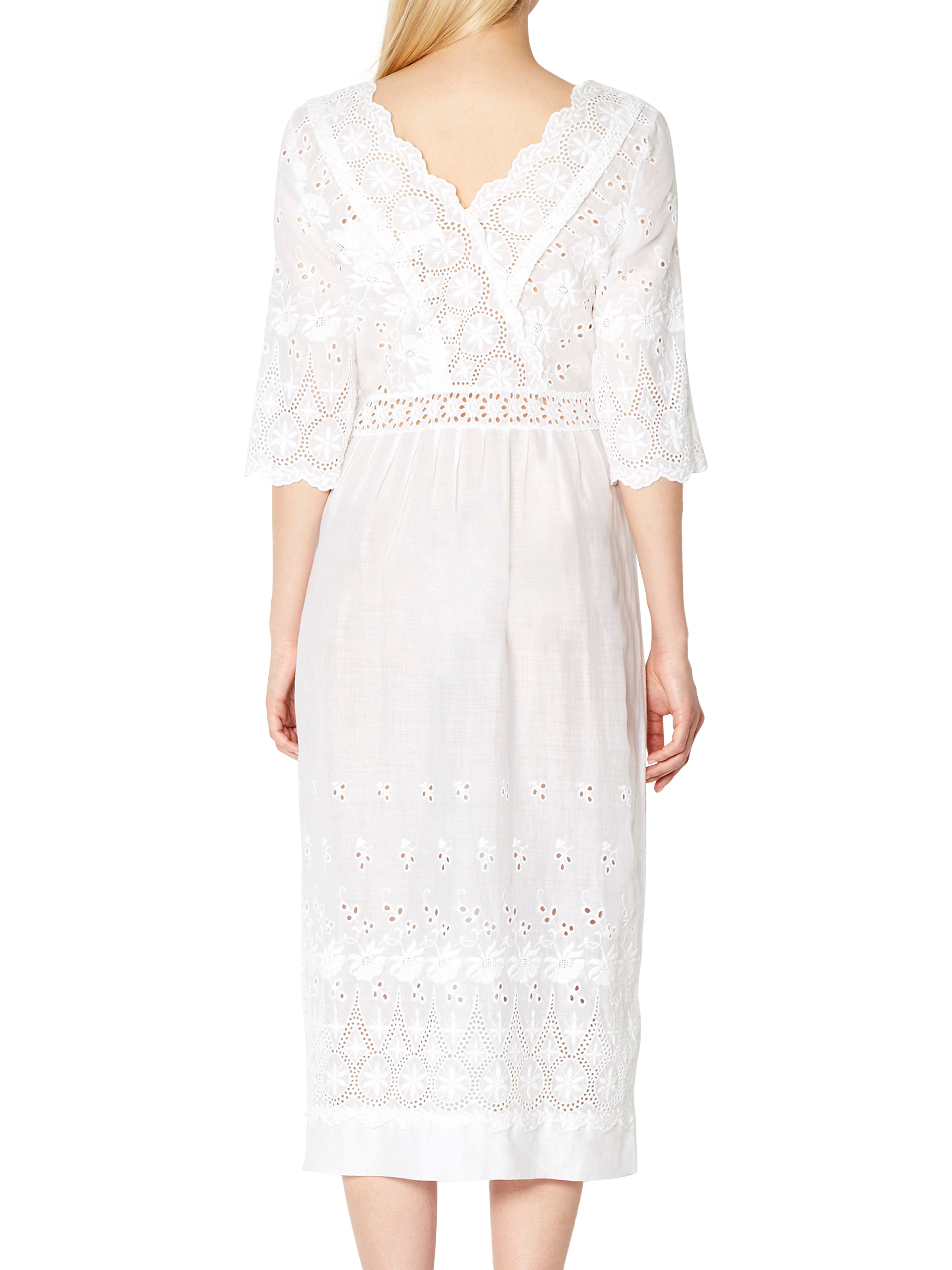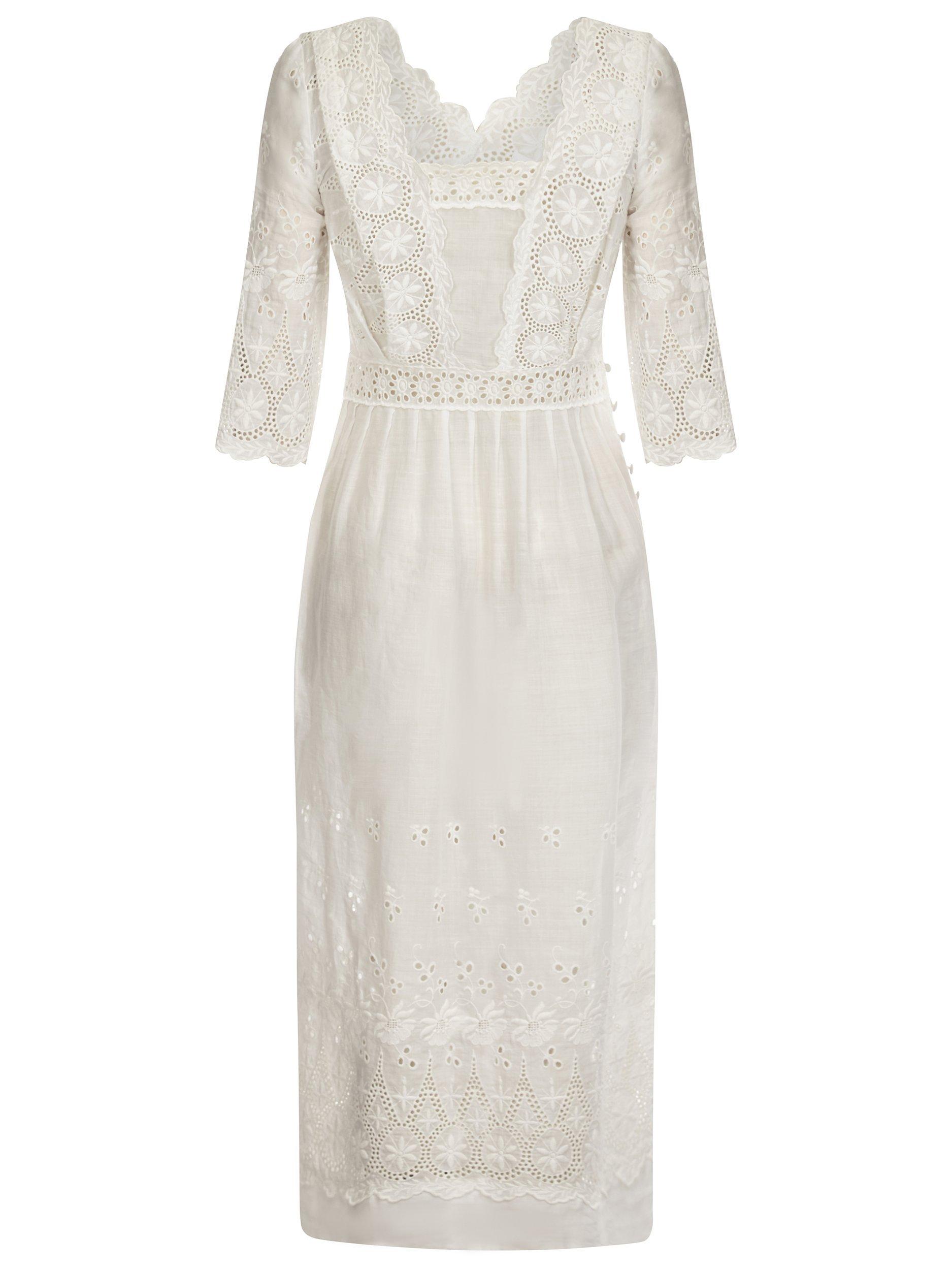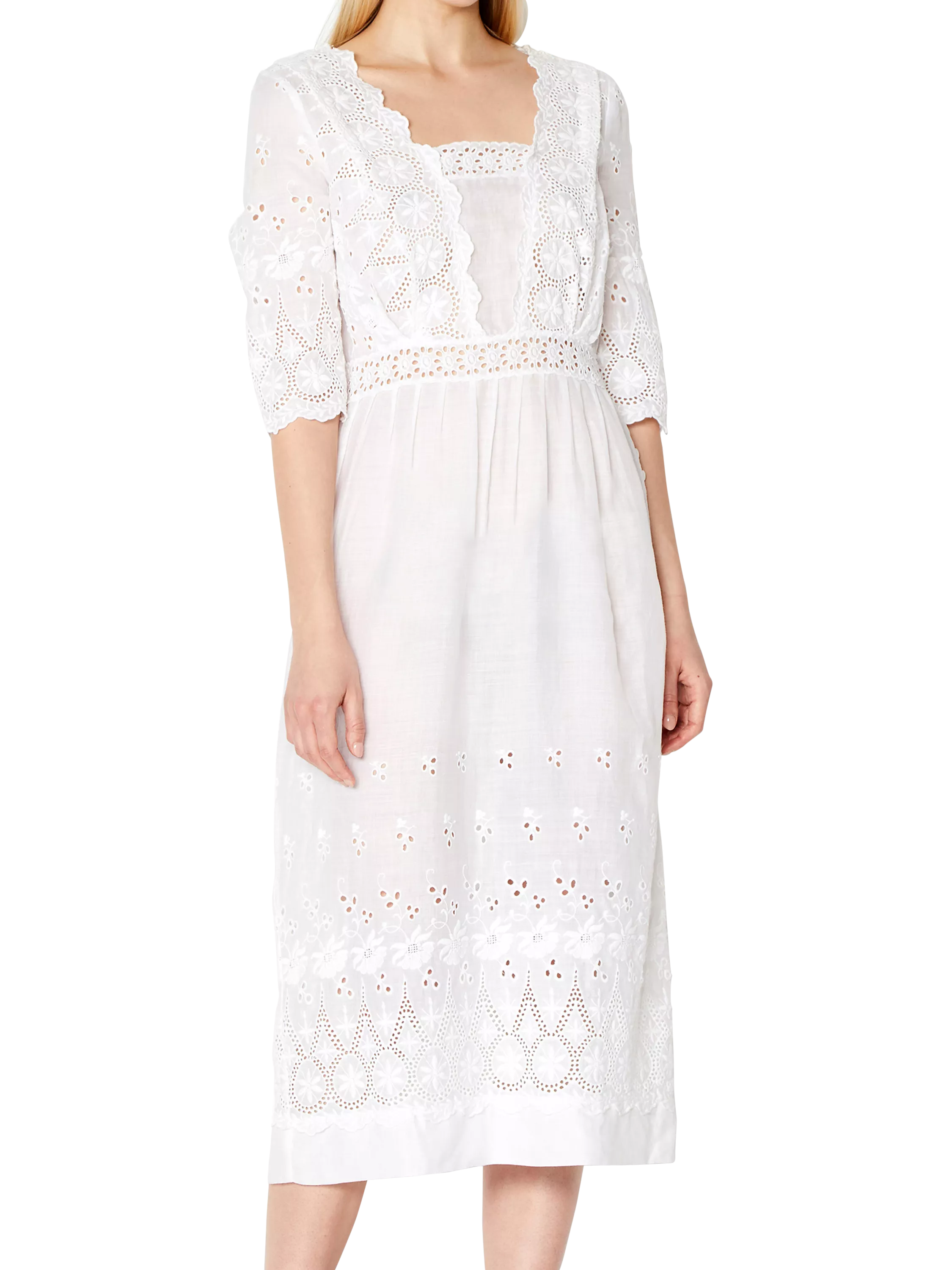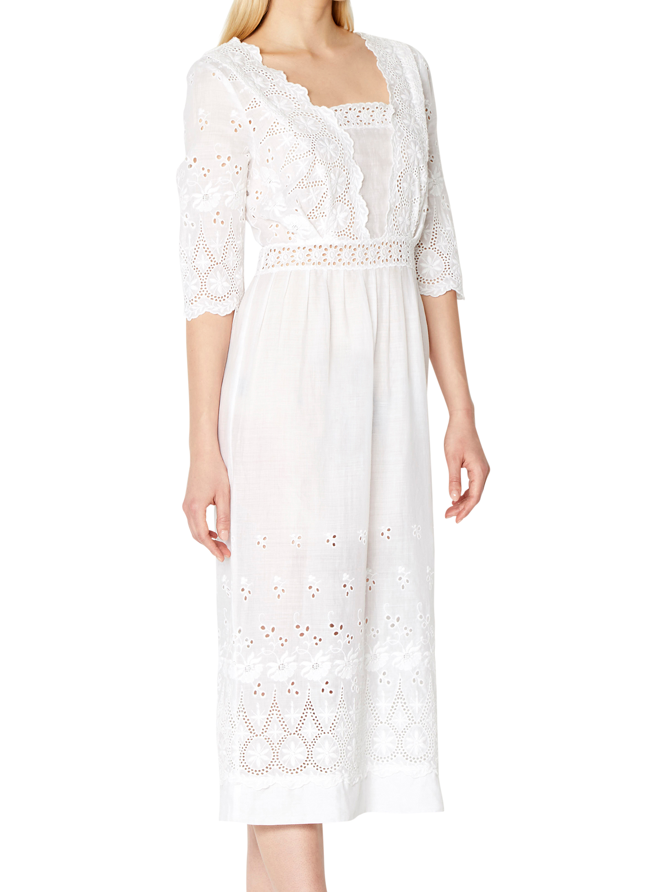 Crafted from a lightweight linen, it's adorned with intricate broderie detailing throughout. Gathering at the waistline lends a subtle drape to the midi-length skirt.