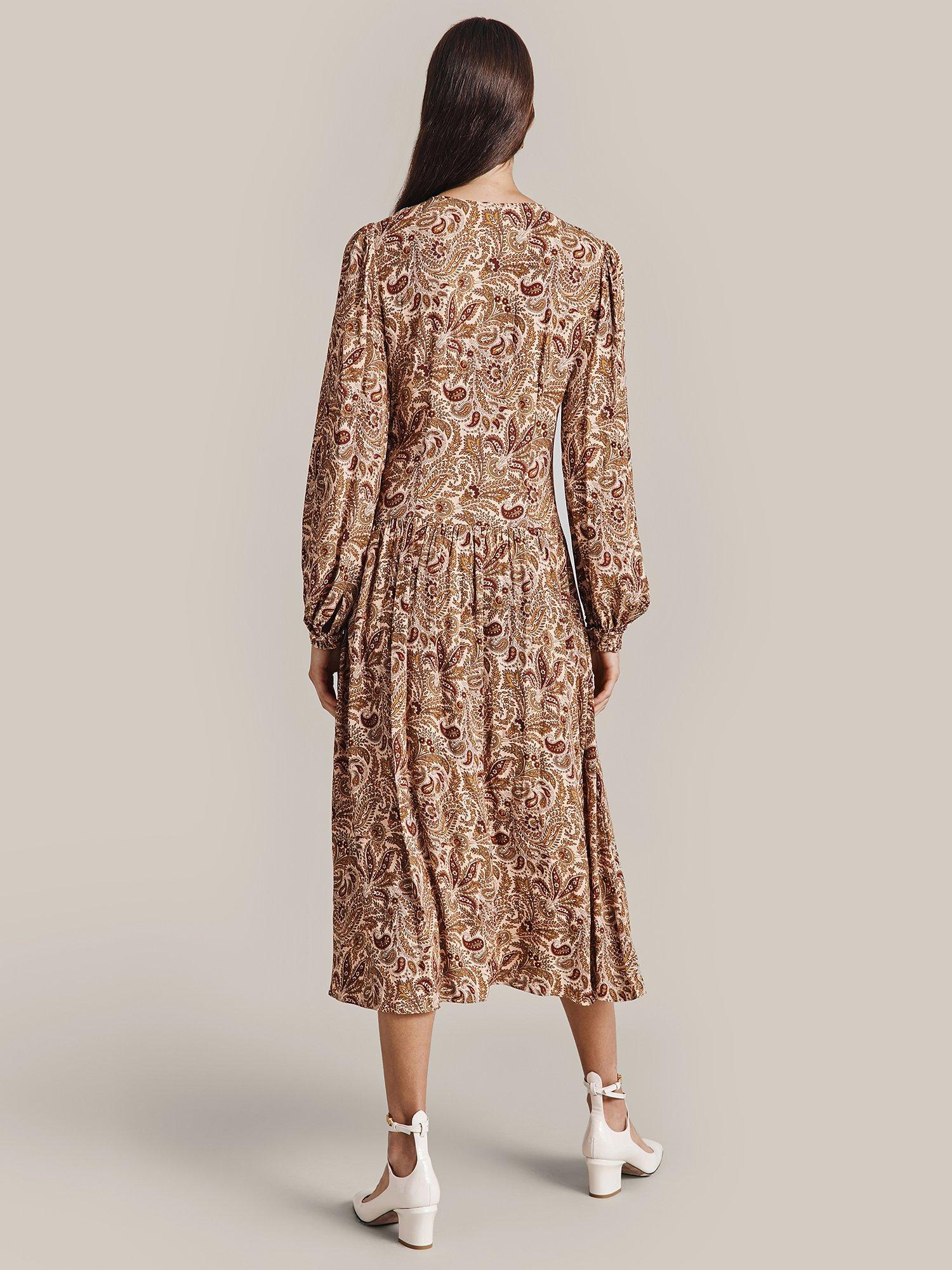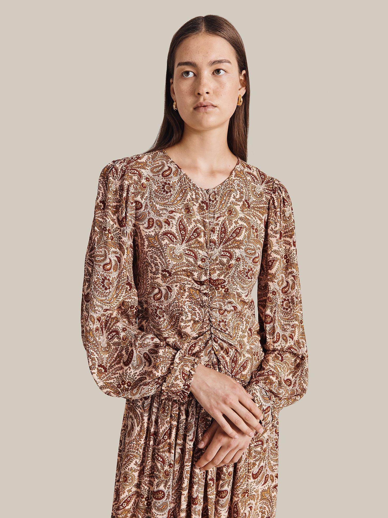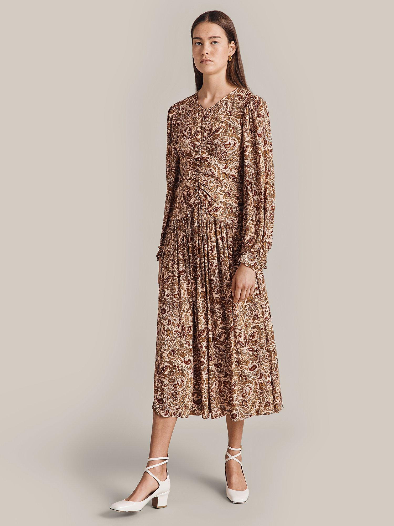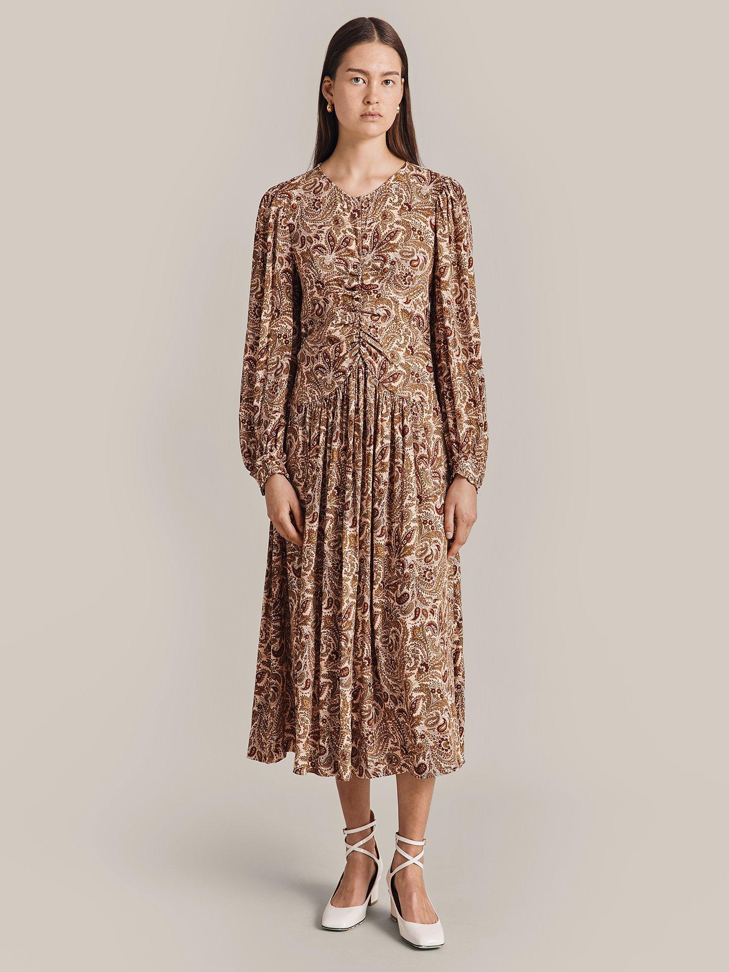 In a gorgeous paisley print, Ava by Ghost is midi in length and crafted from signature winter crepe. Fit and flare in style, she features a flattering empire line bust and a ruched mid seam. Long sleeves with shirred cuffs add yet more volume to this flattering style. Layer over a jacket and wear with your favourite ankle boots.
