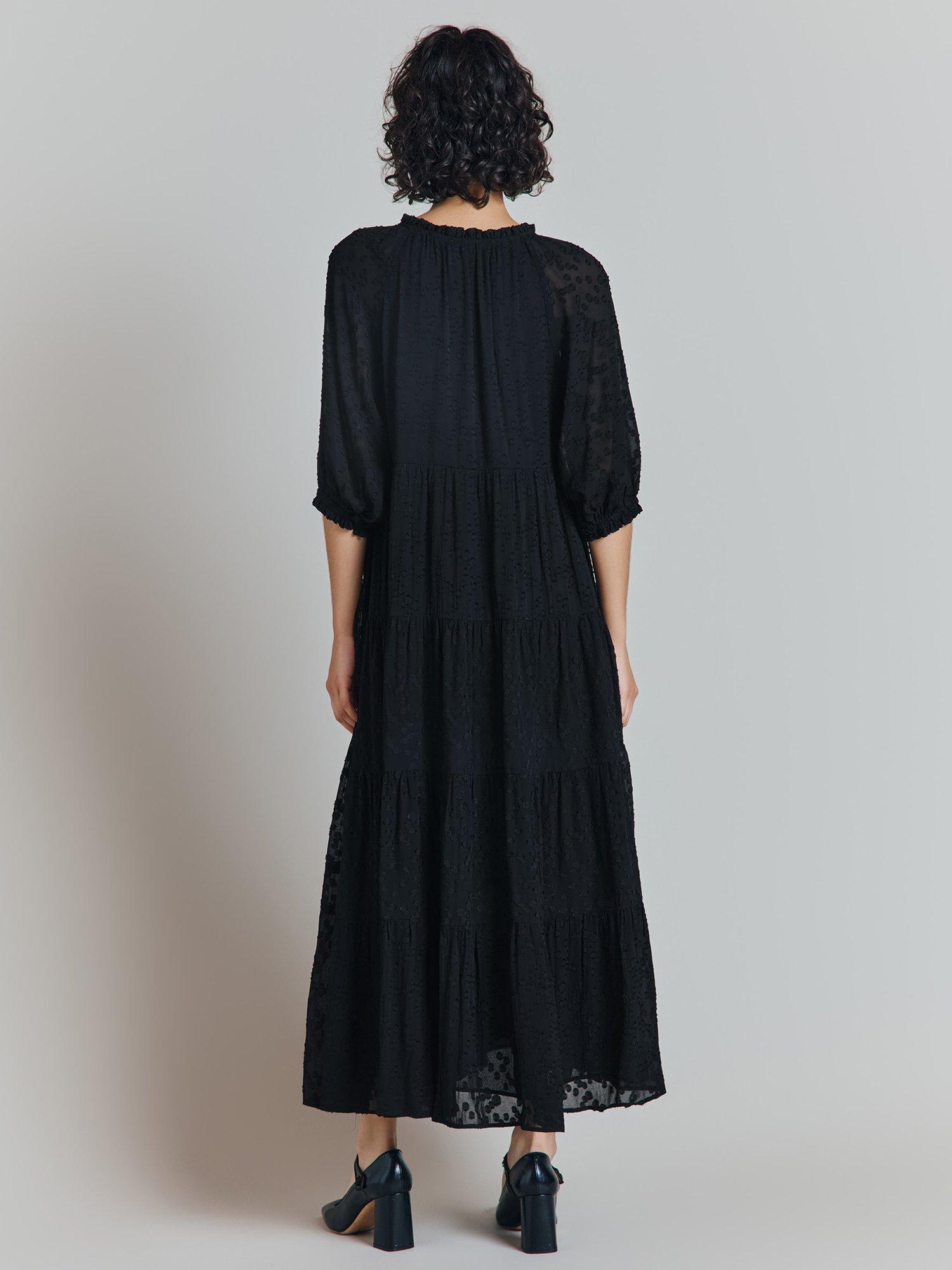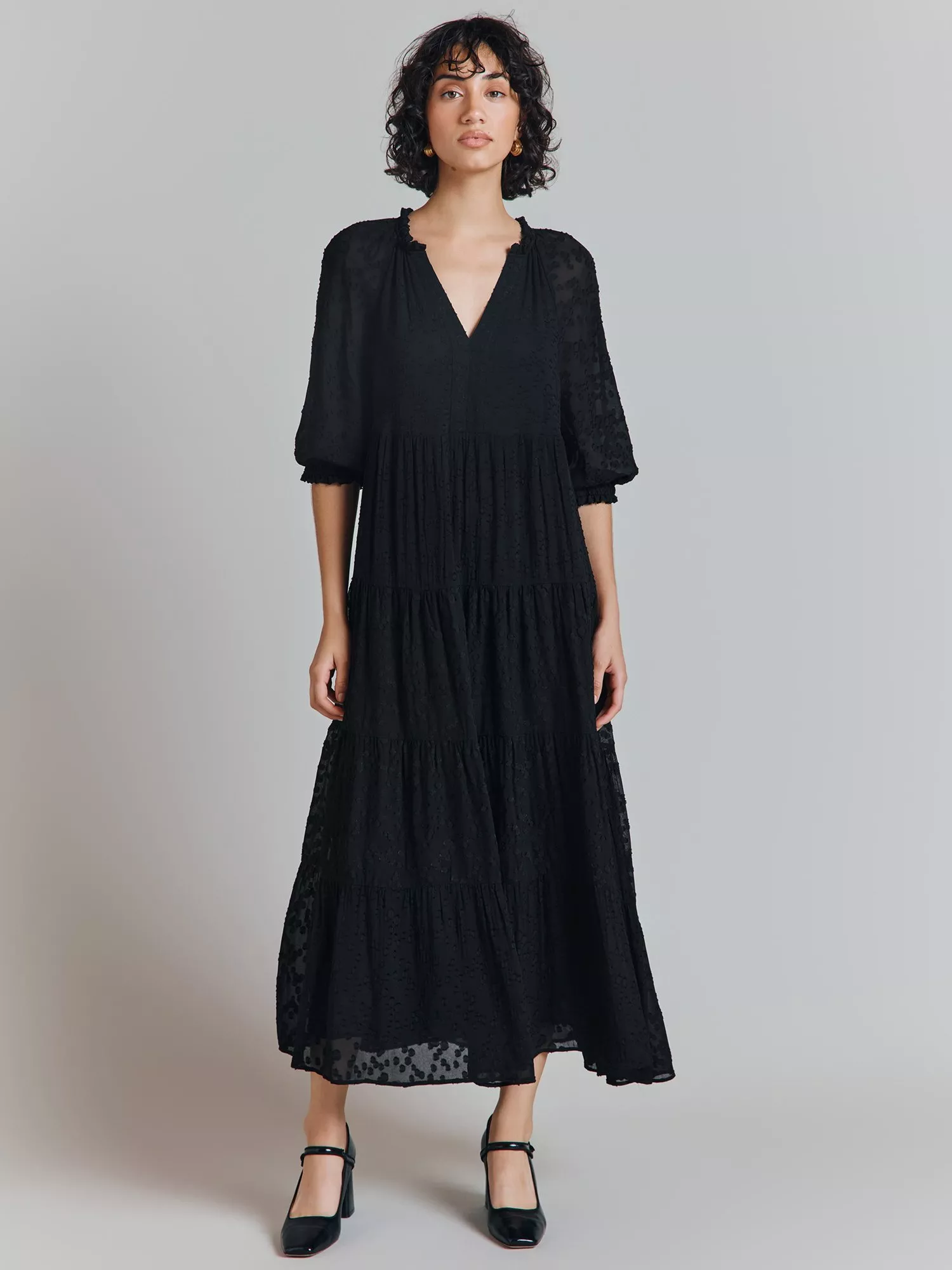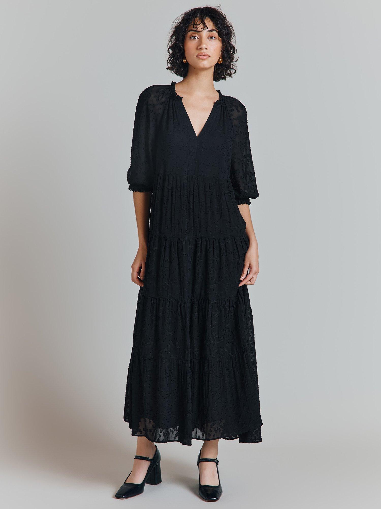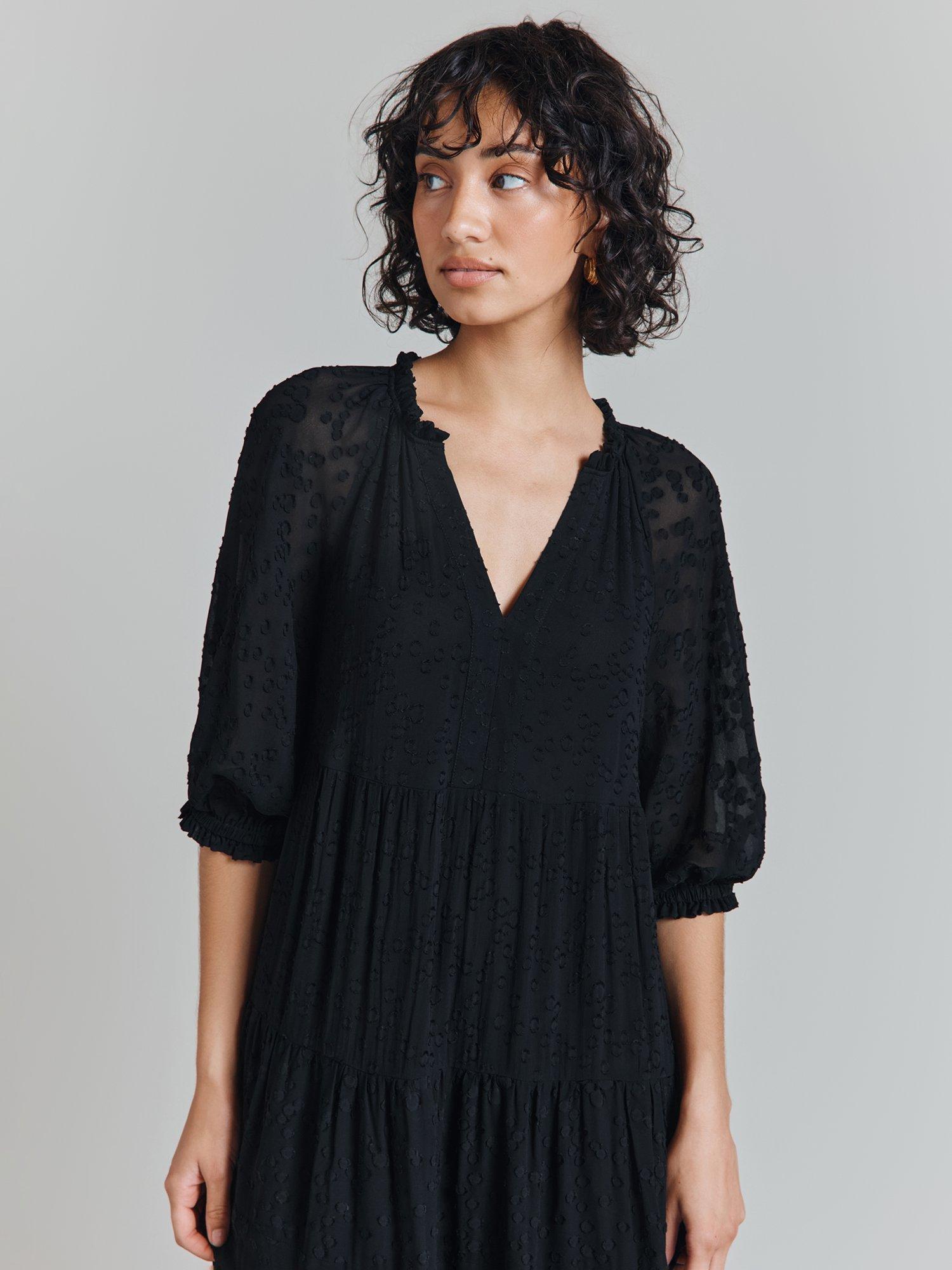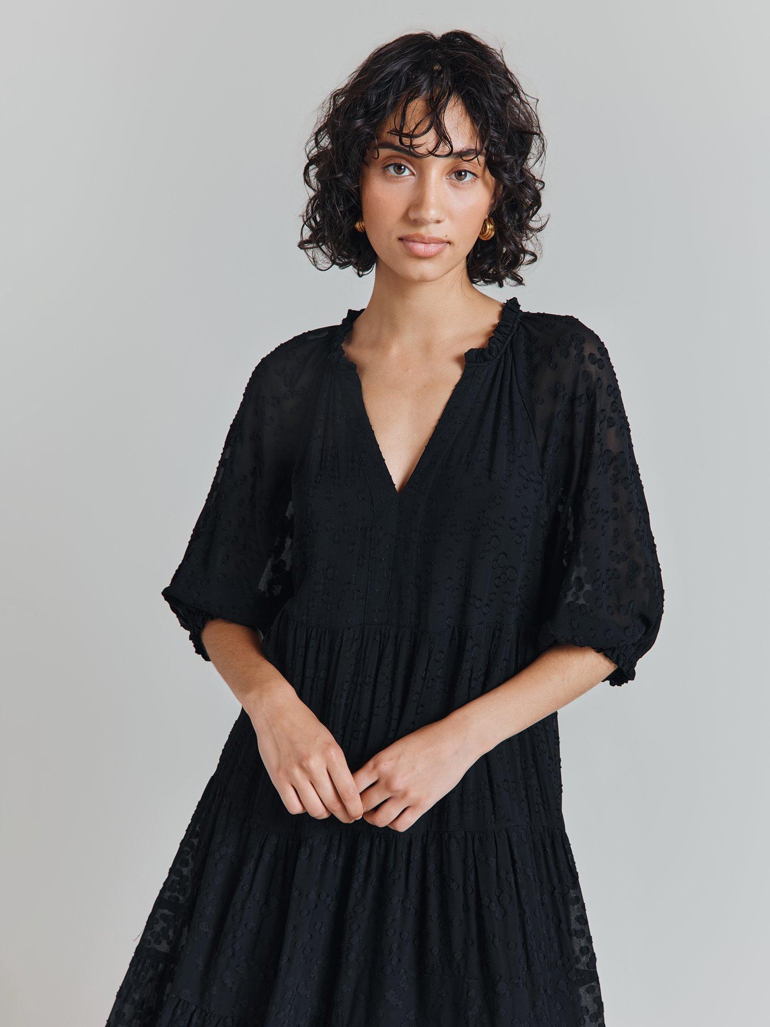 A poppy georgette tiered smock dress, with V neck, puffed and gathered short sleeves.