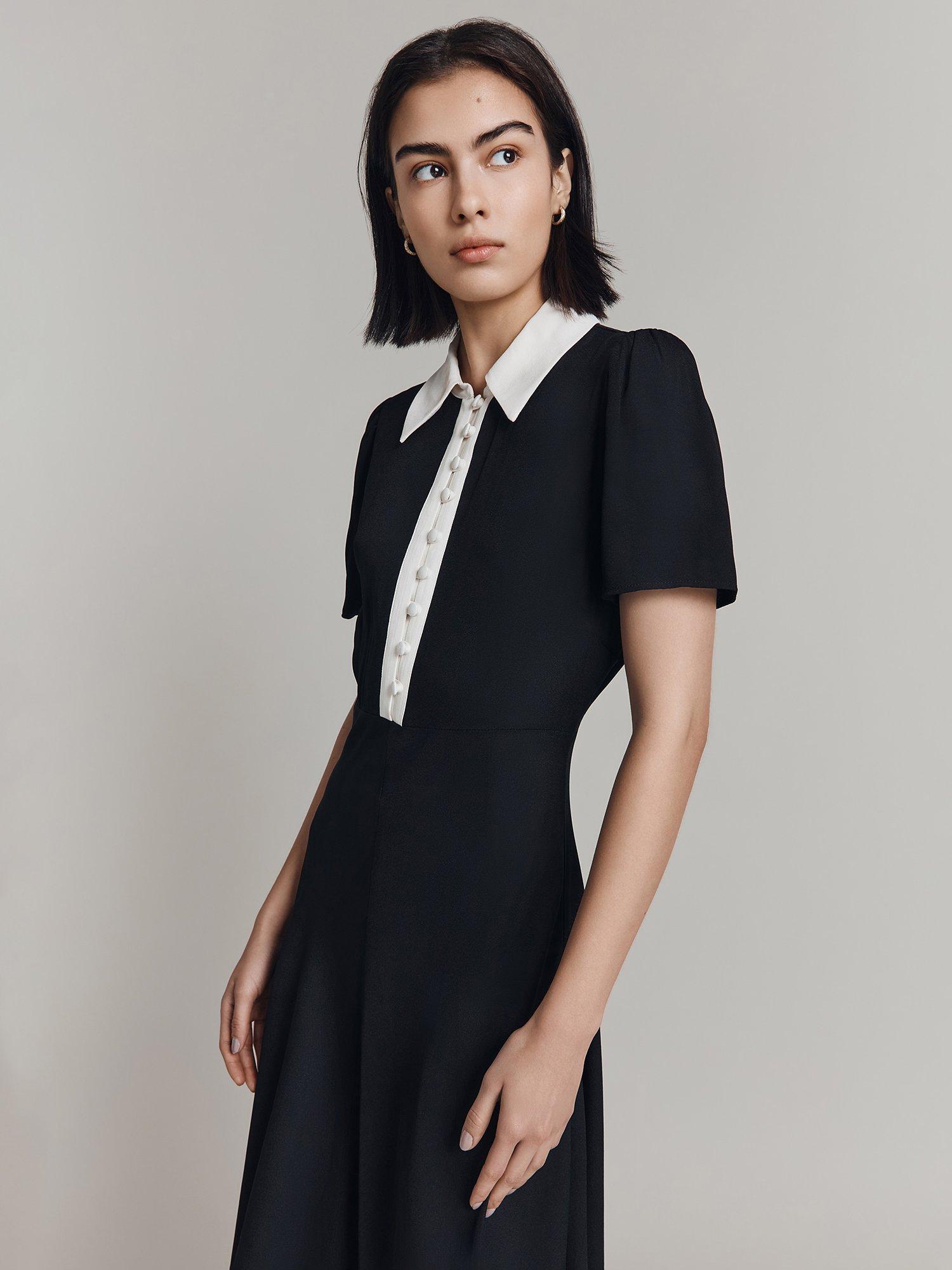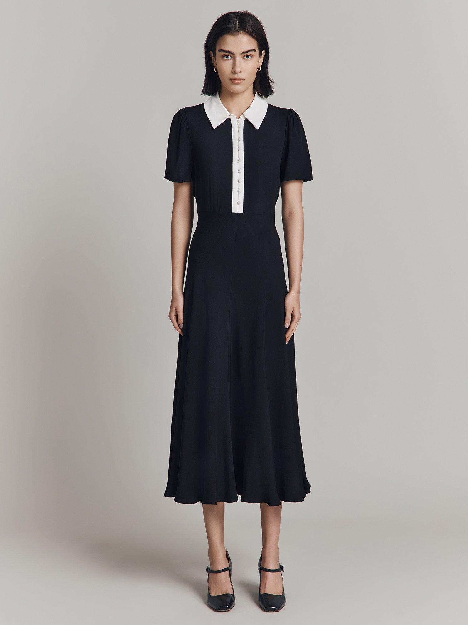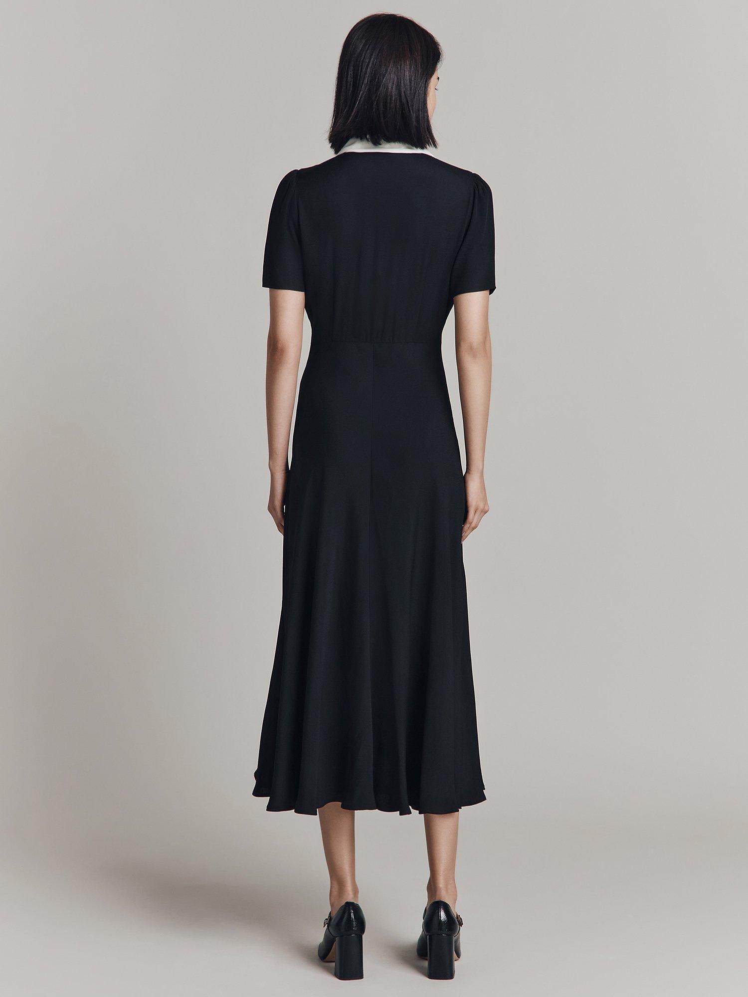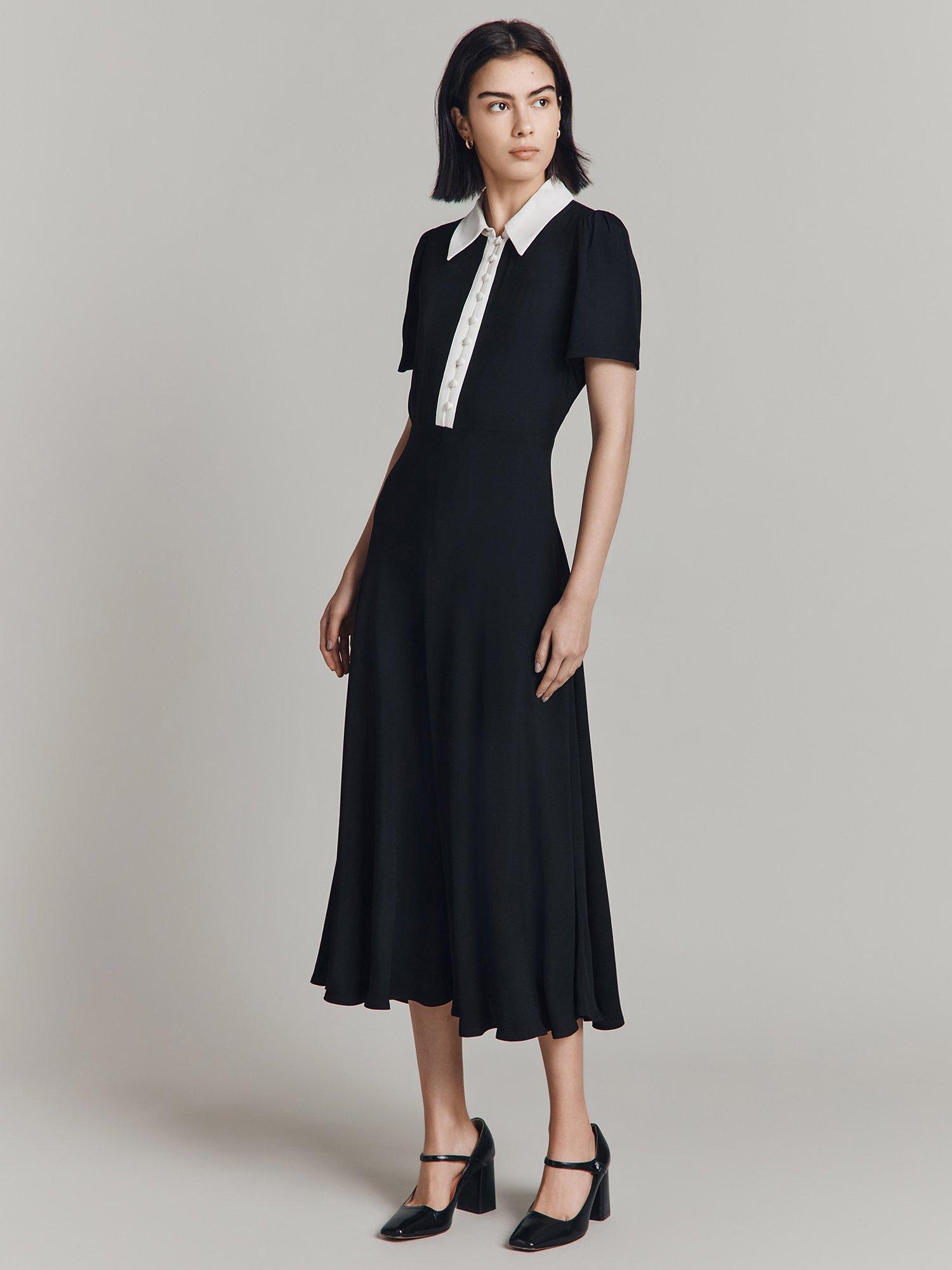 For the perfect combination of formal and fashionable, meet Bethan. Crafted from satin back crepe, this chic midi dress is all about the statement contrast colour collar and front placket, which adds a unique twist to a classic style. Featuring short sleeves with gentle gathering at the shoulder for added volume and a bias-cut skirt for fluid movement.