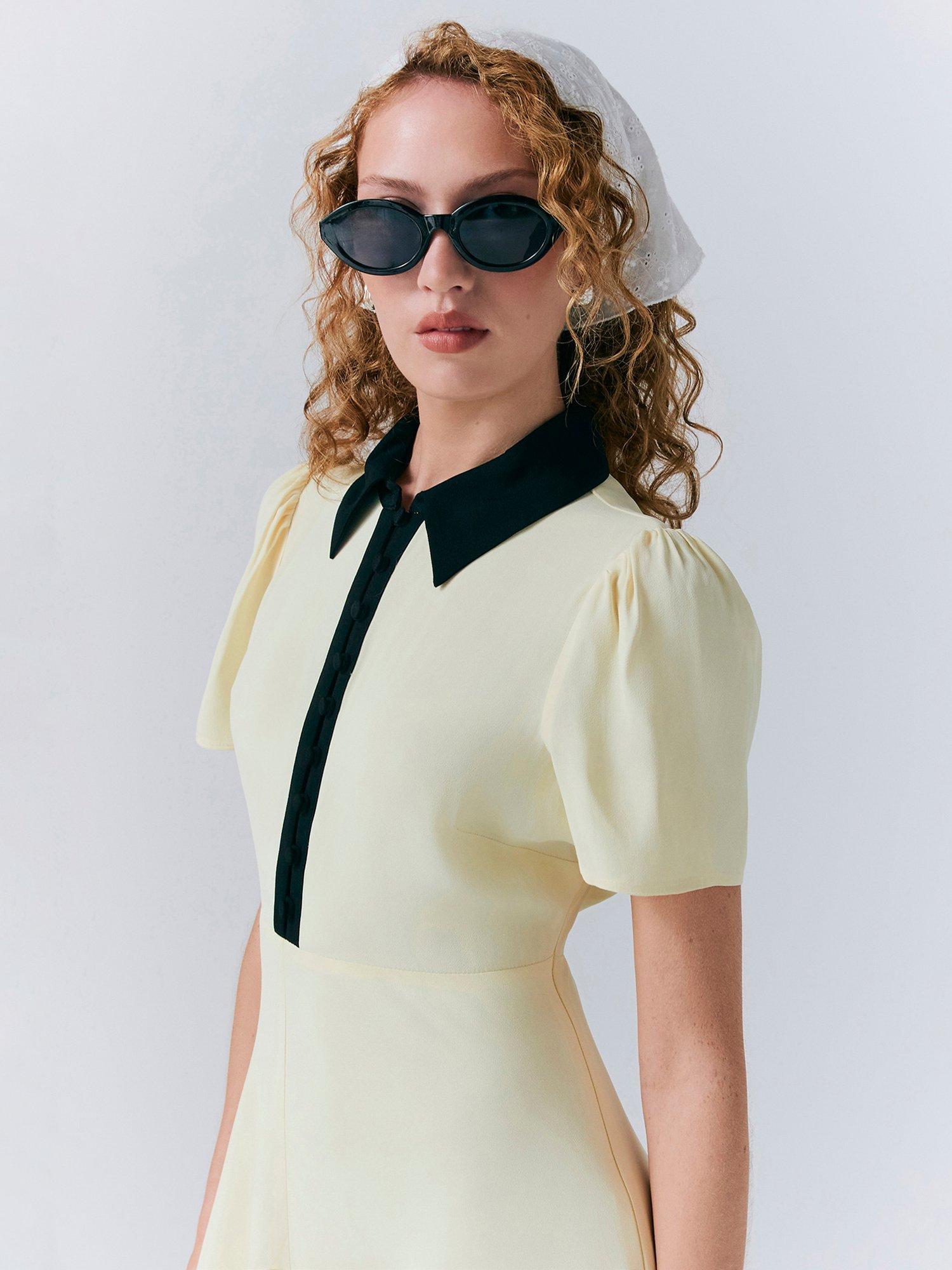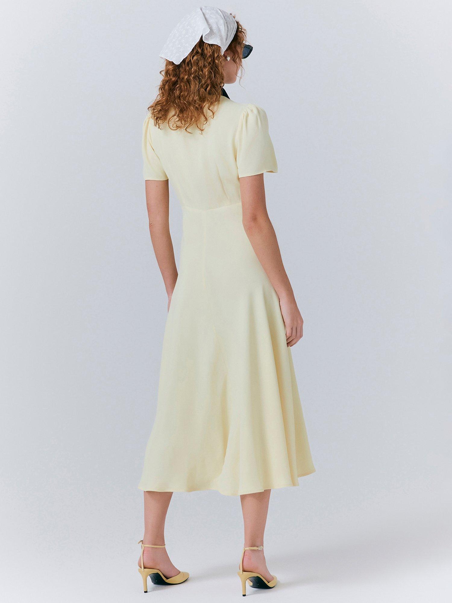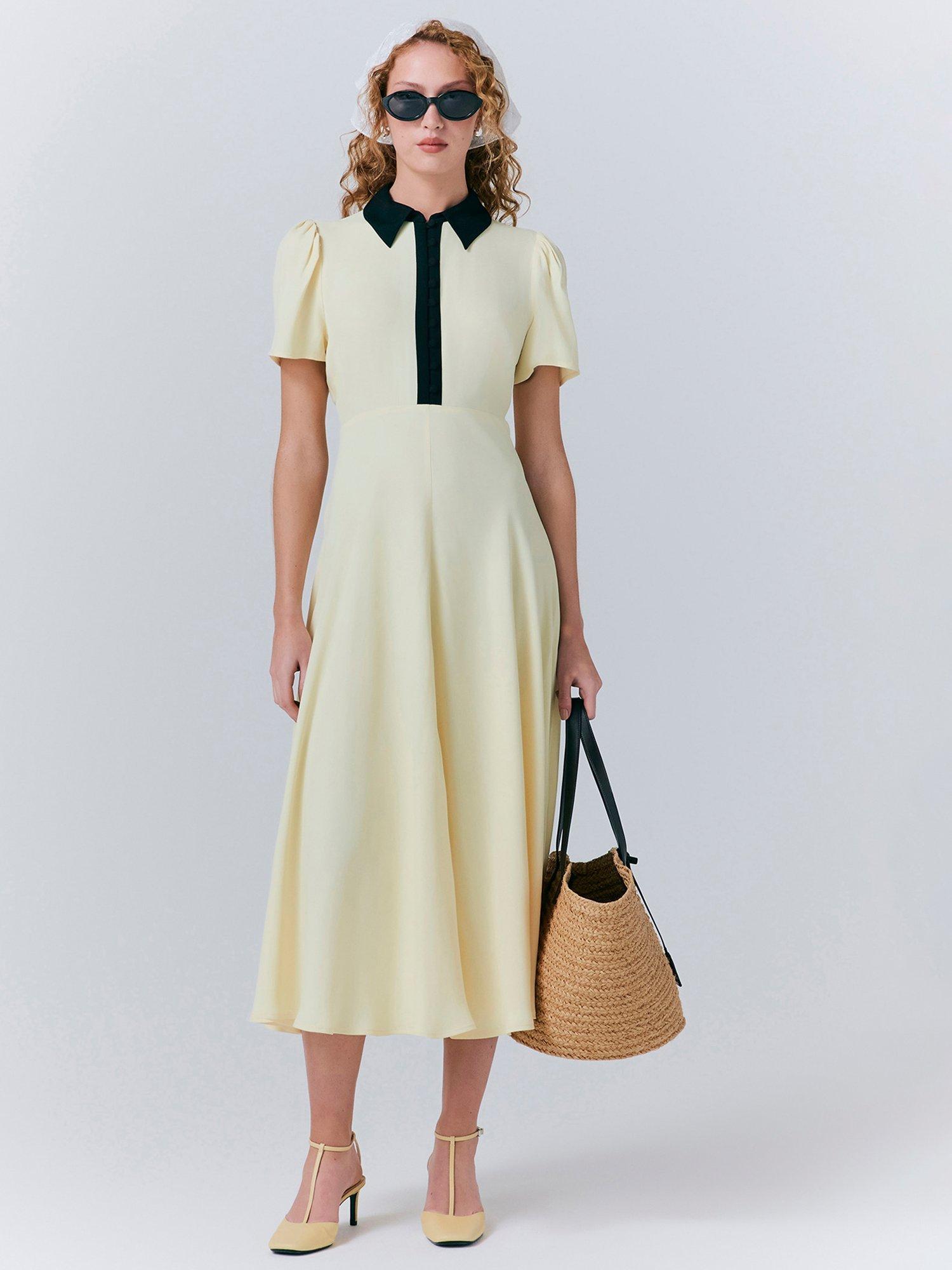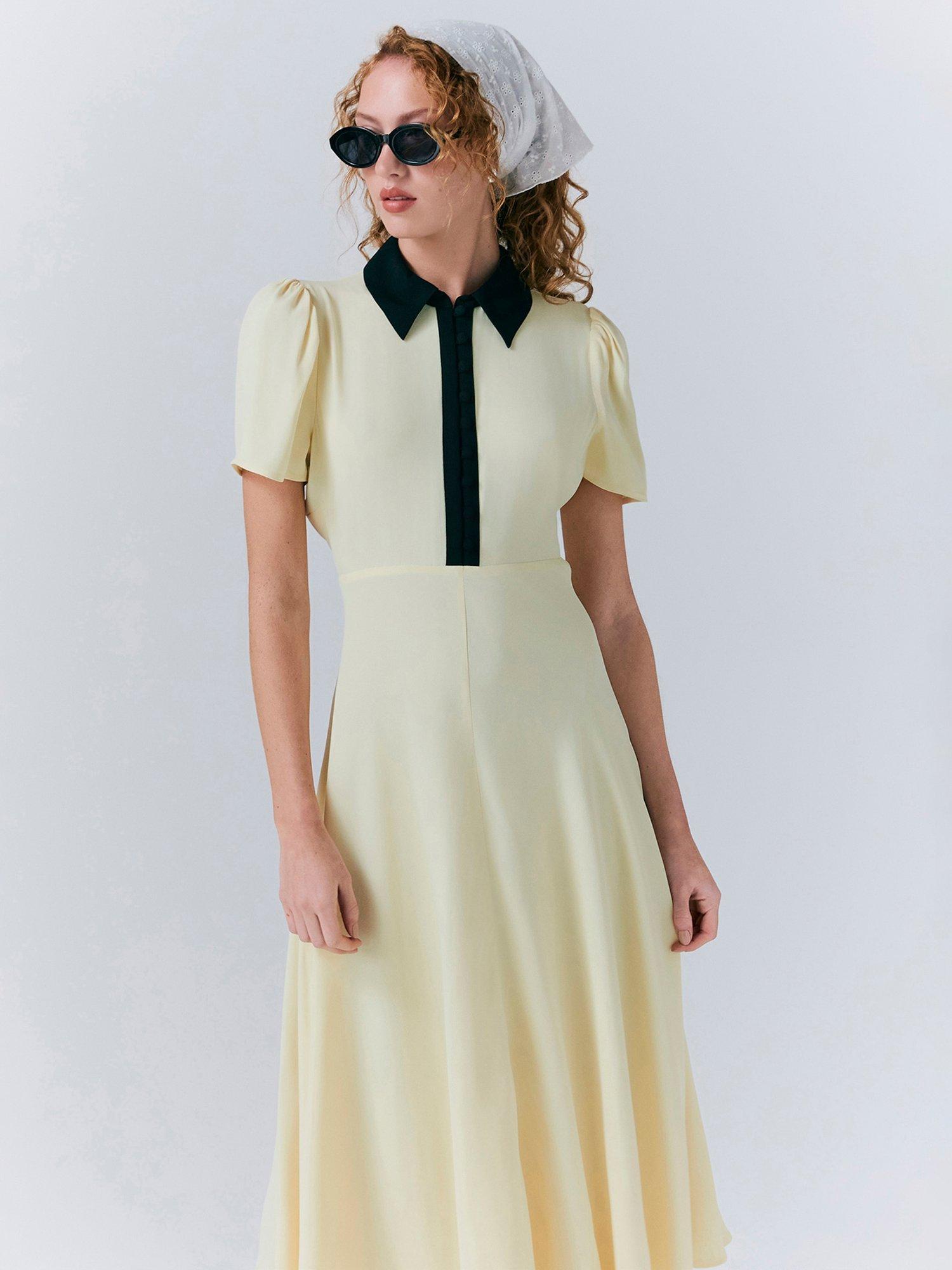 For the perfect combination of formal and fashionable, meet Bethan. Crafted from satin back crepe, this chic midi dress is all about the statement contrast colour collar and front placket, which adds a unique twist to a classic style. Featuring short sleeves with gentle gathering at the shoulder for added volume and a bias-cut skirt for fluid movement.