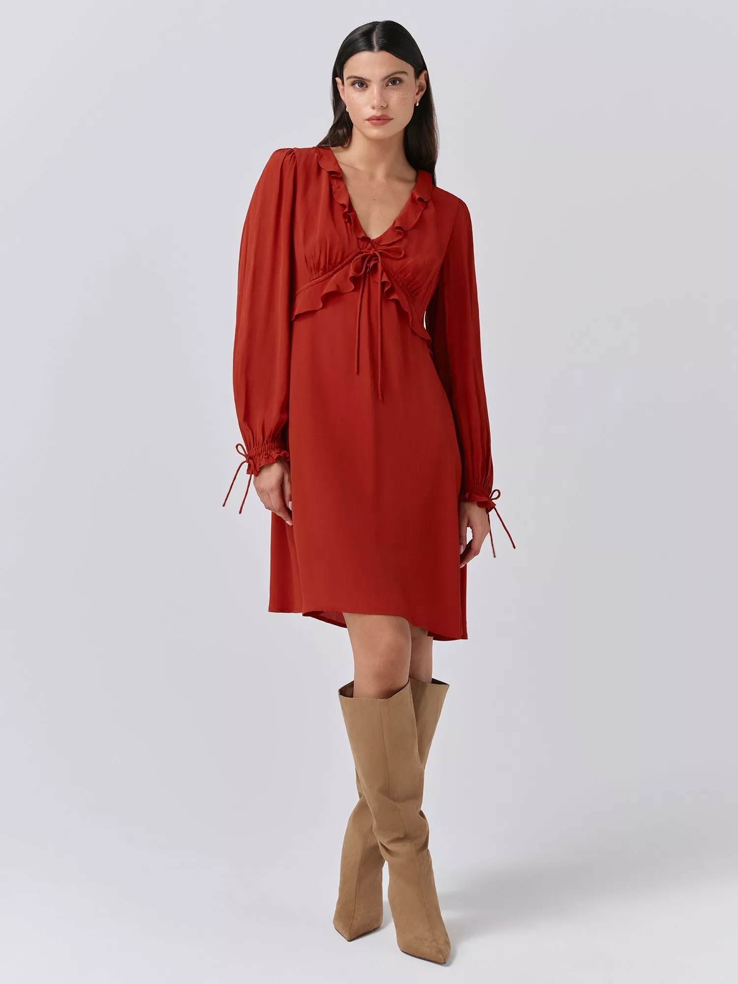 Meet Billie, a relaxed mini dress. Designed with ease of wear in mind, it features long sleeves with delicate frills on the cuffs and neckline. Crafted from signature lightweight crepe, it’s the perfect piece to layer up as the season turns.