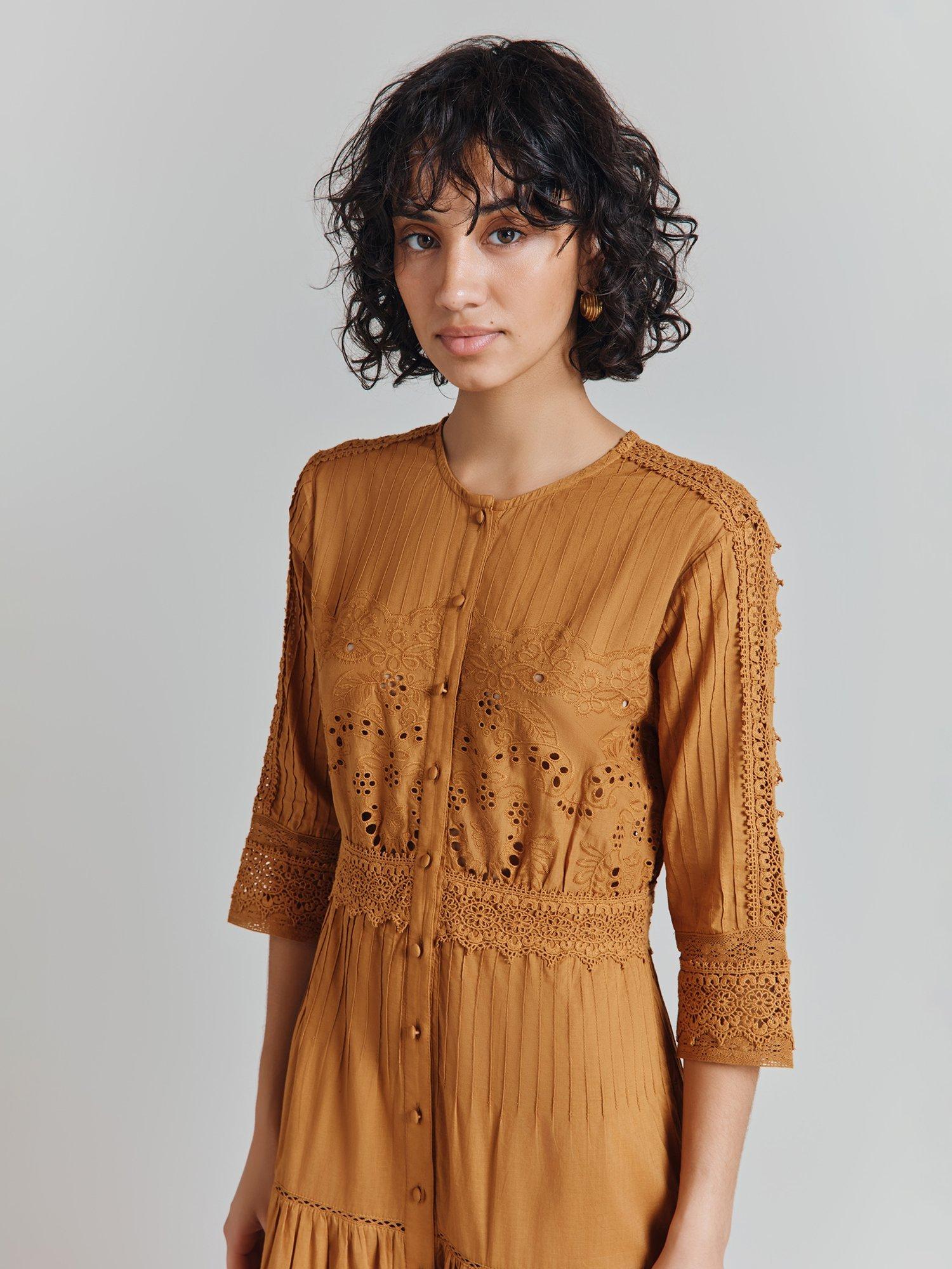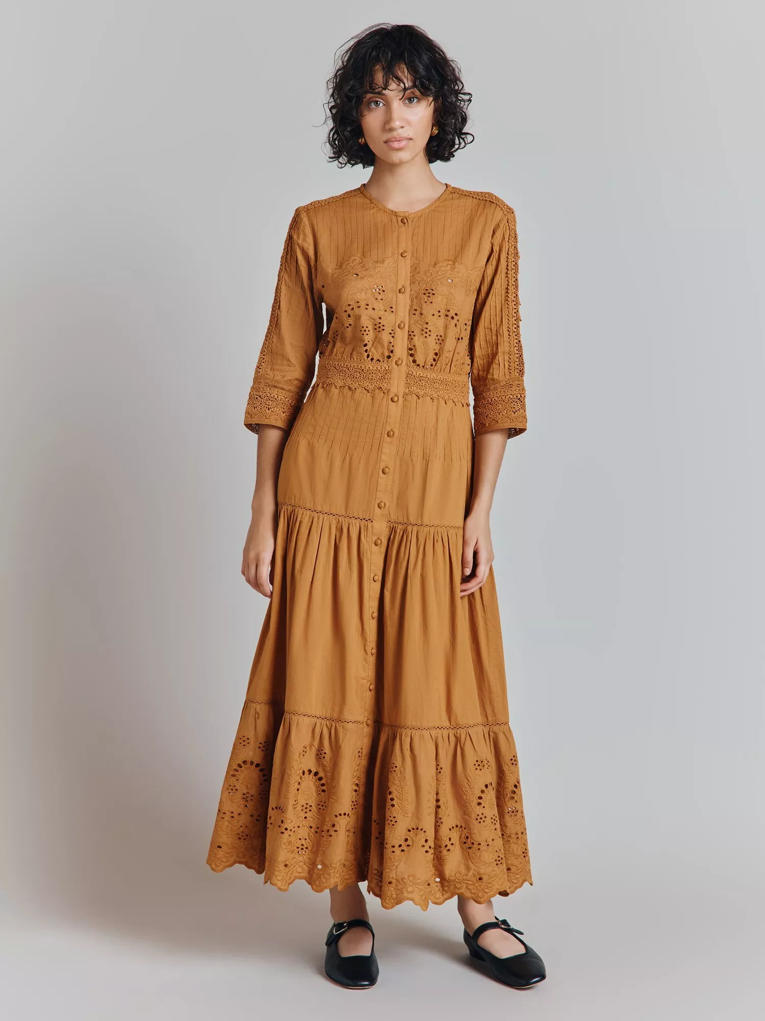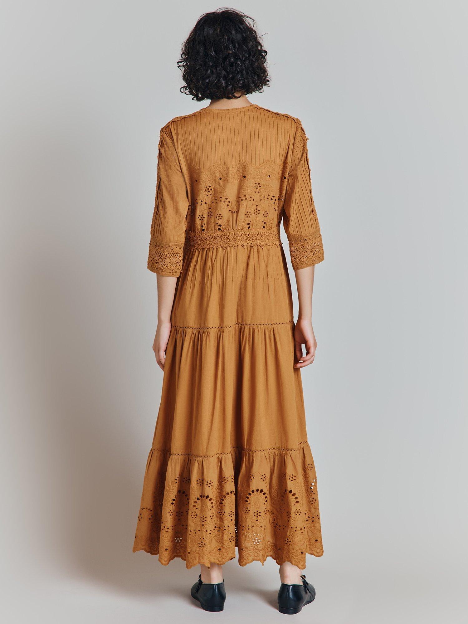 A 3 quarter sleeve embriodered cotton tiered midi dress, pleated detailing over yoke and sleeves, button-through, round neck.