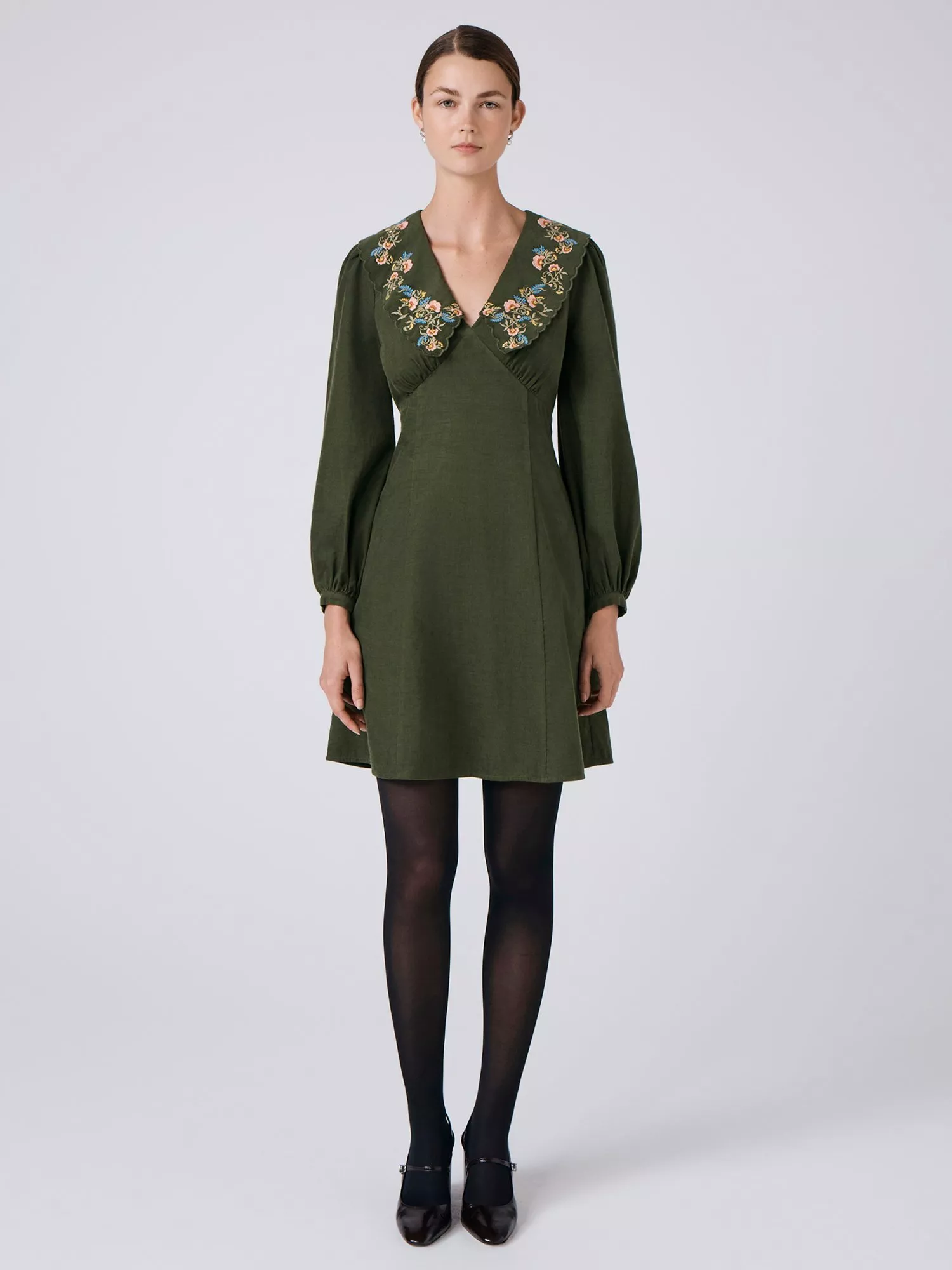 A statement collar has become a timeless design element that we return to season after season - and it’s the star of the show on the Blakely dress thanks to beautiful embroidery and a delicately scalloped edge. Cut from corduroy fabric for warmth and structure, this mini-length style features long sleeves with buttoned cuffs, an A-line skirt and gentle gathering at the bust. Concealed side zip fastening.