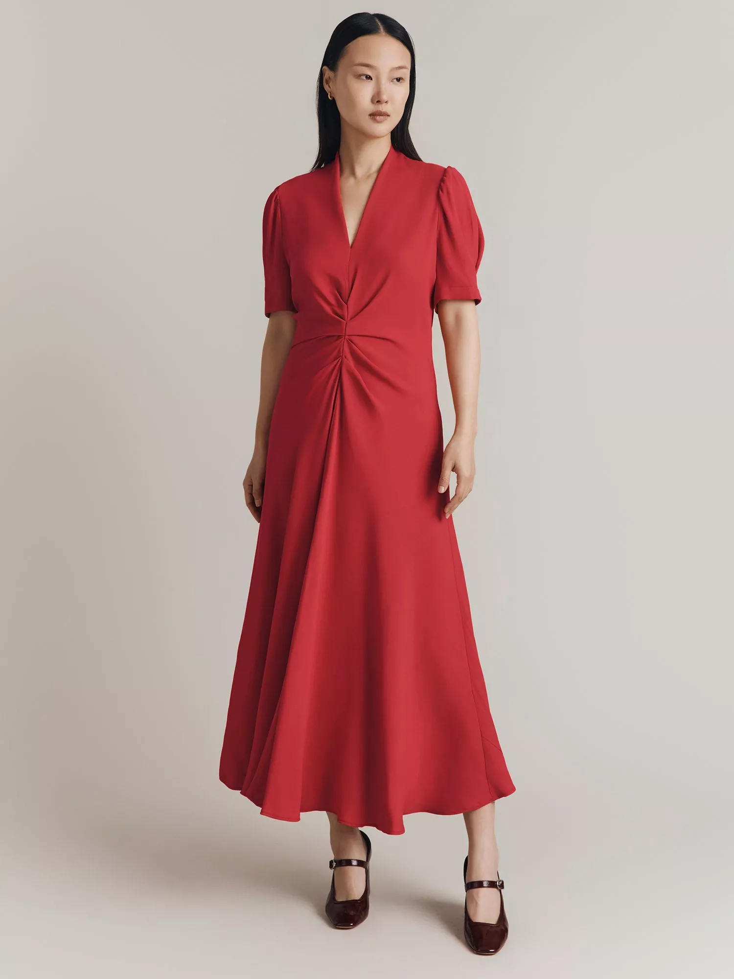 Offered in a universally flattering fit and flare shape, this mid-length dress from Ghost is dreamt up from whisper-weight viscose. Effortlessly flattering thanks to a fuss-free v-neckline and short puff sleeves, transform this simple design into a stand out with coordinating accessories.