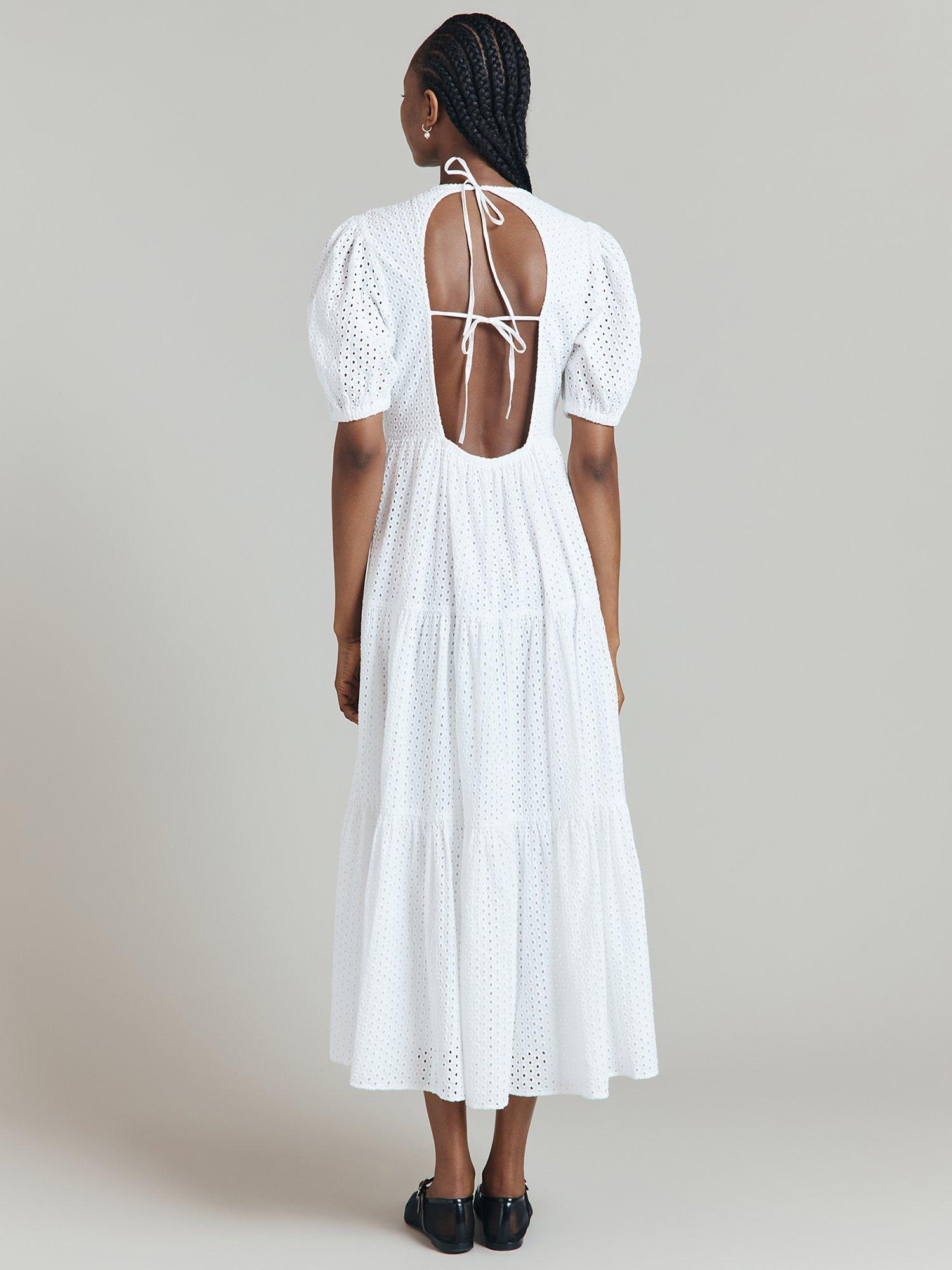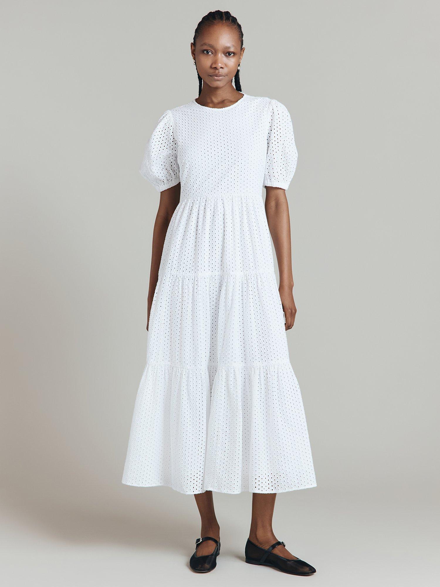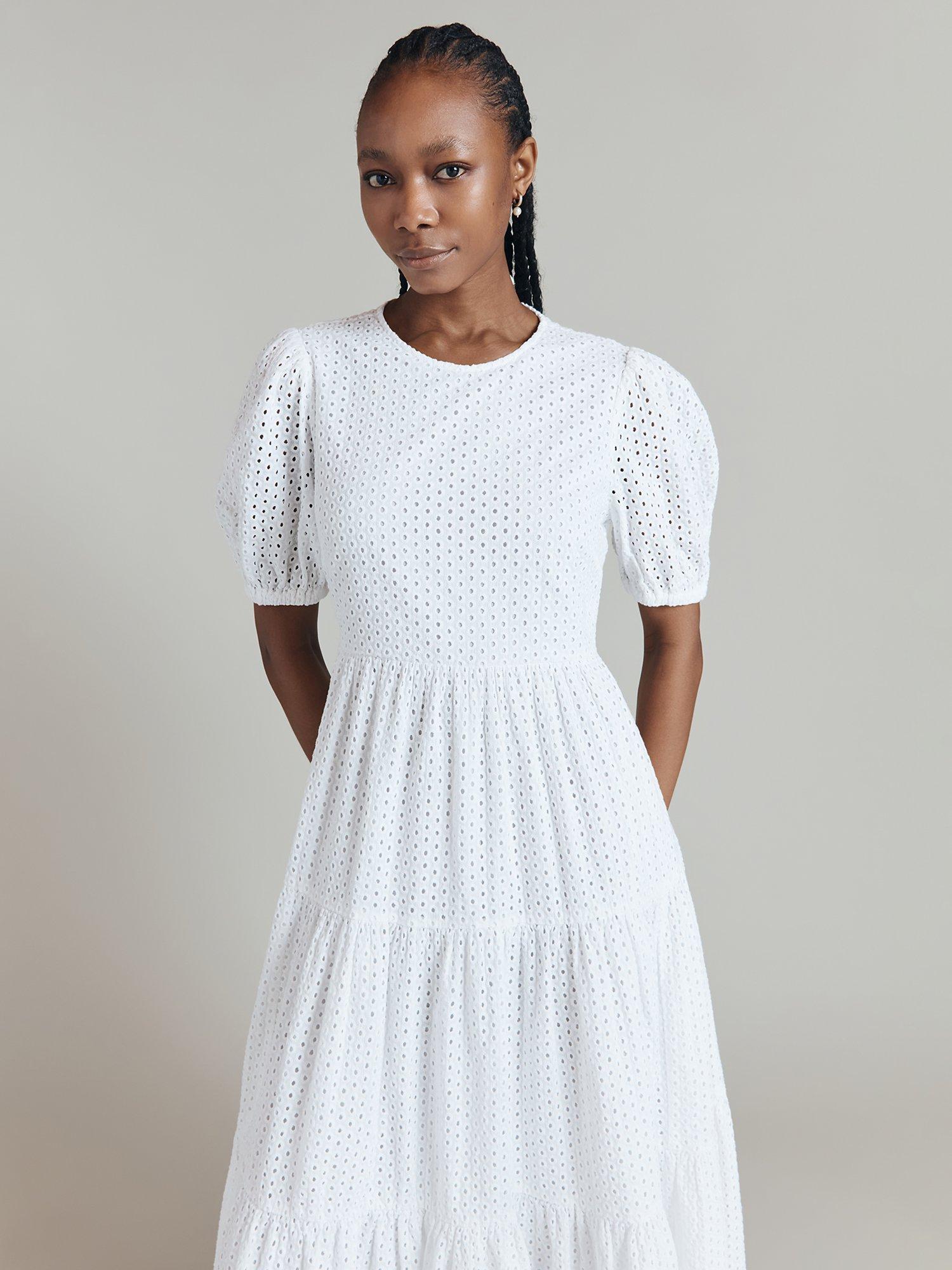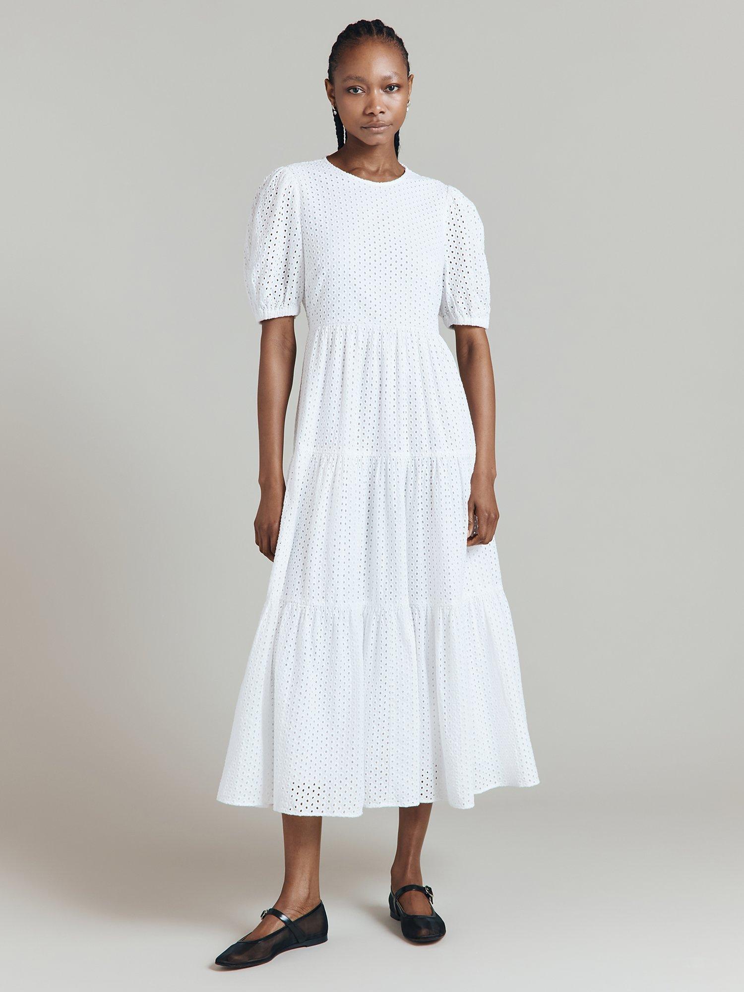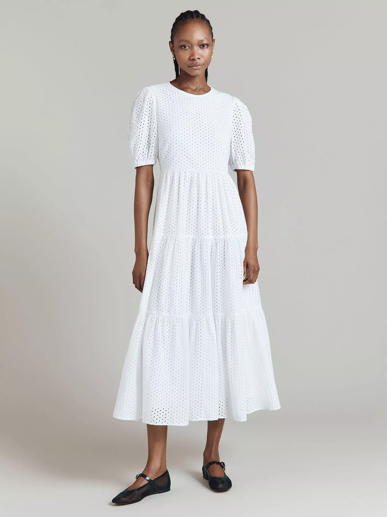 Offset with plenty of tiered layers, this mid-length dress from Ghost comes with a lightweight cotton composition. Carved with a round neck and puff sleeves, it is elevated with intricate embroidery.