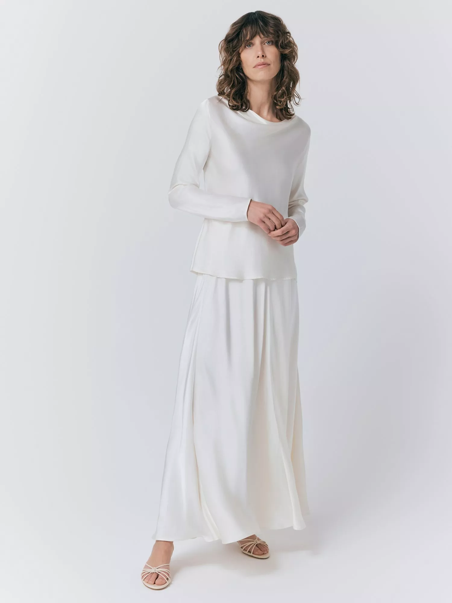 Meet Colette, a classic bias-cut maxi skirt in flowing lightweight satin. Her secret weapon? A discreet pull-on elasticated waist for ultimate comfort. Central seam detailing at the front and back creates soft fullness for a romantic, sweeping silhouette that moves beautifully with the body.
