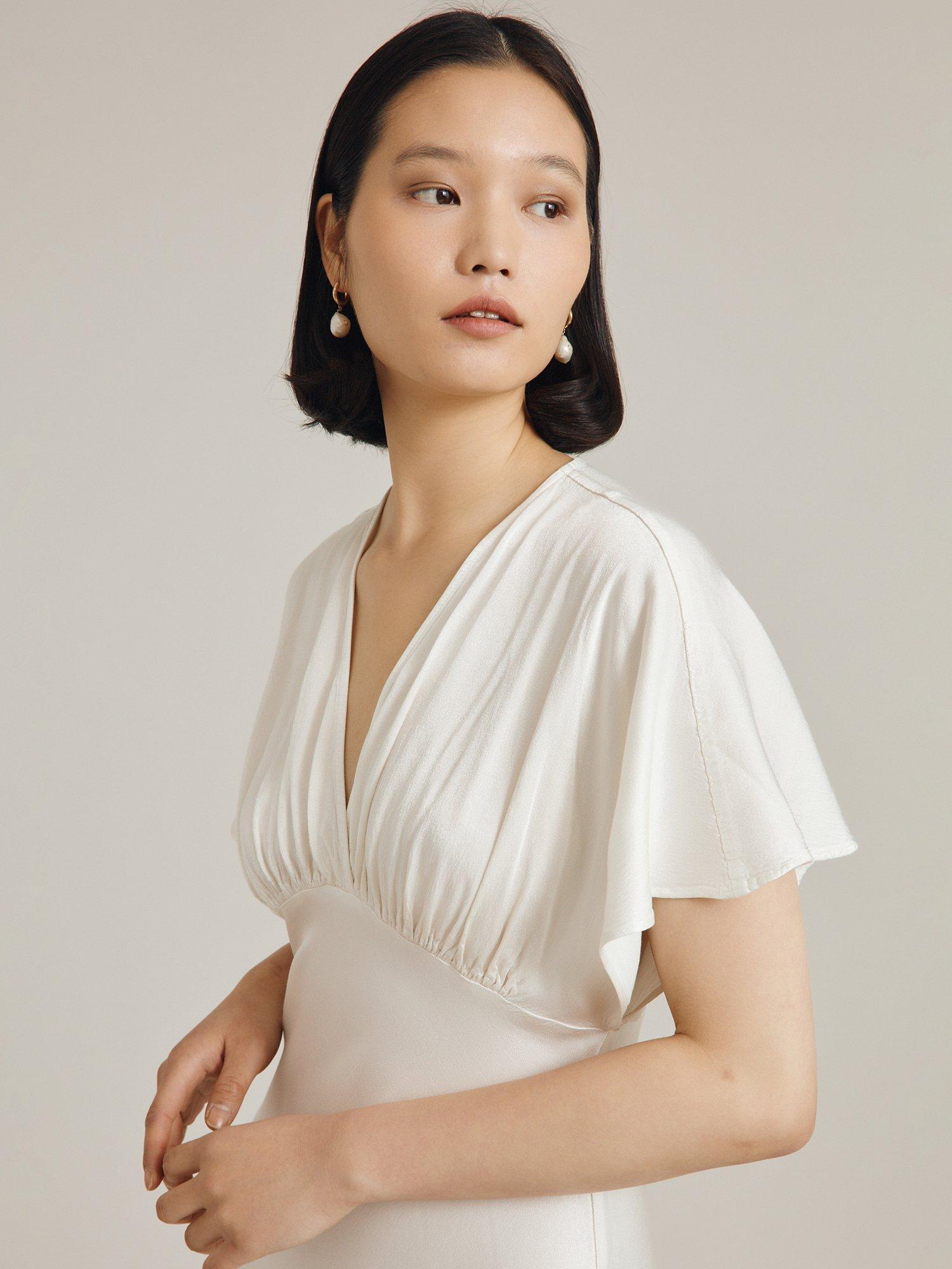 With a gathered wrap neckline and short sleeves, this smooth satin-blend dress gives a sleek finish to your ensemble and is sure to impress at your next social event.