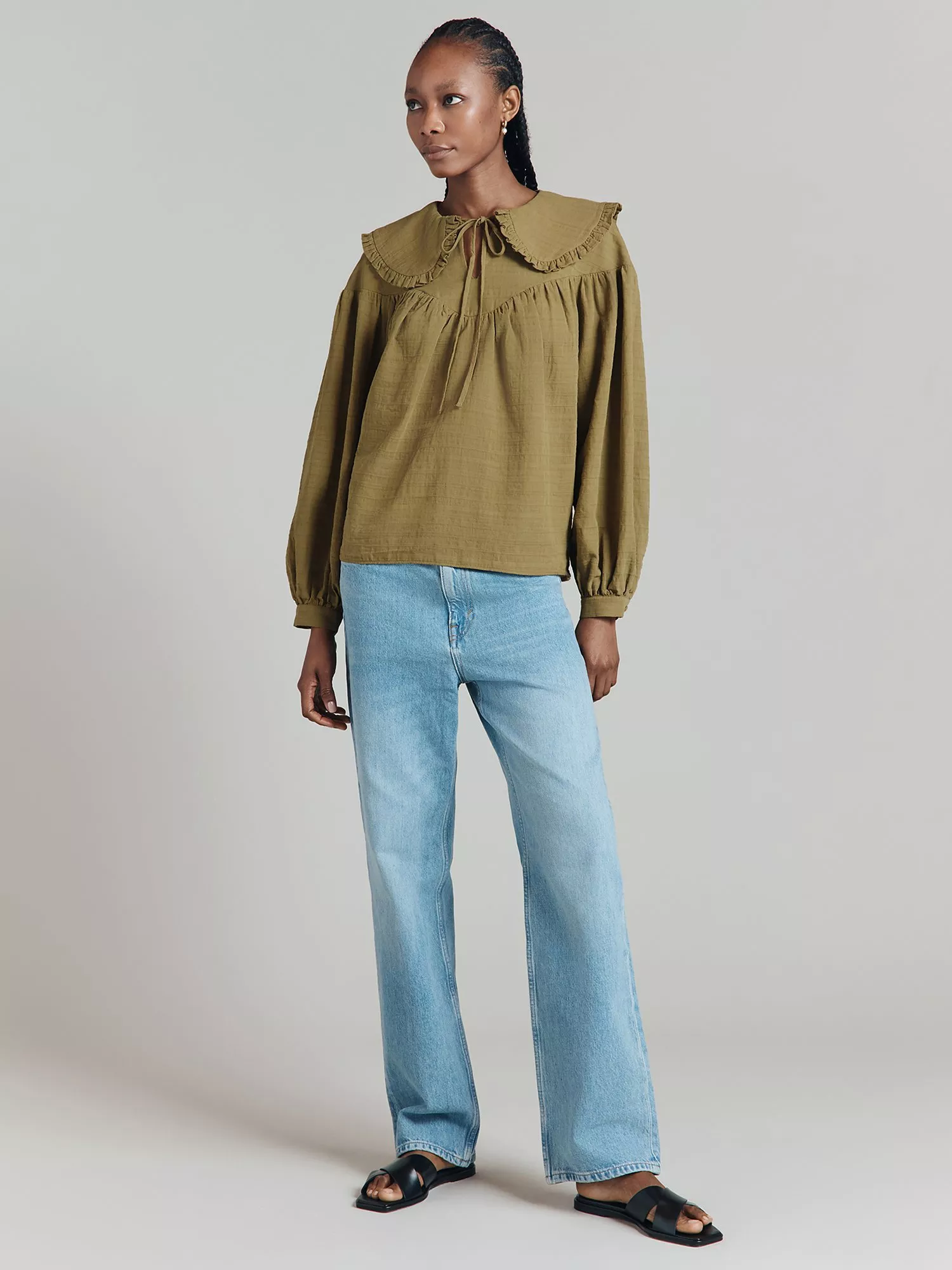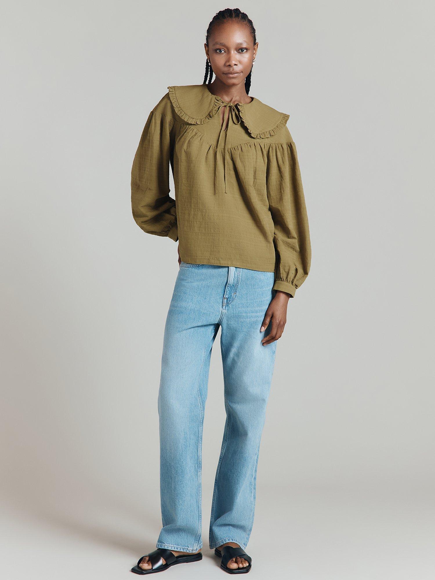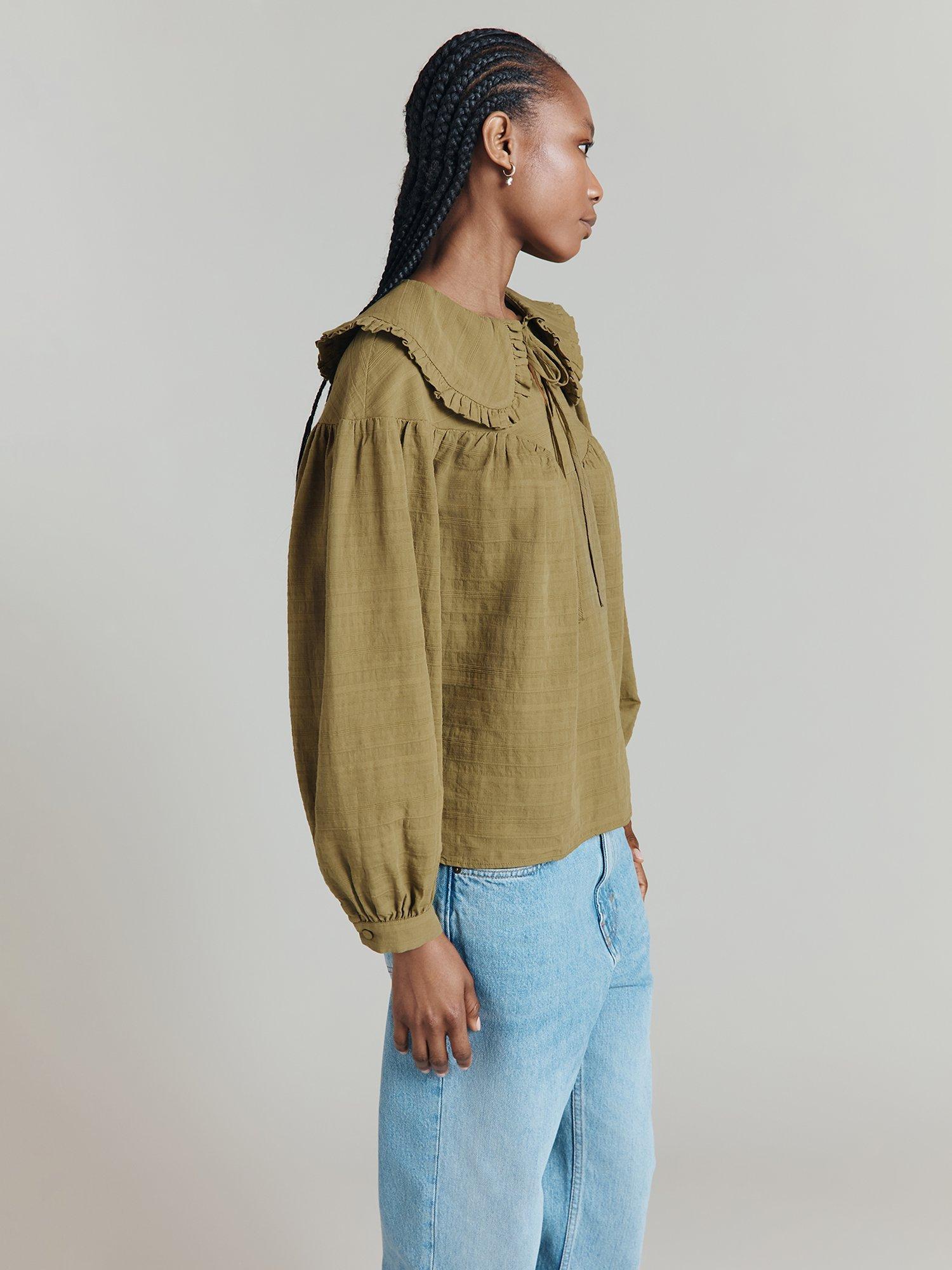 The Daisy shirt is all about the statement Peter Pan collar edged in a graceful ruffle. A loose-fit cotton textured jacquard blouse, it has long sleeves with cuff and button details and drop shoulders that lead into a deep yoke at the chest. Finished with a delicate keyhole and tie at the neck.
