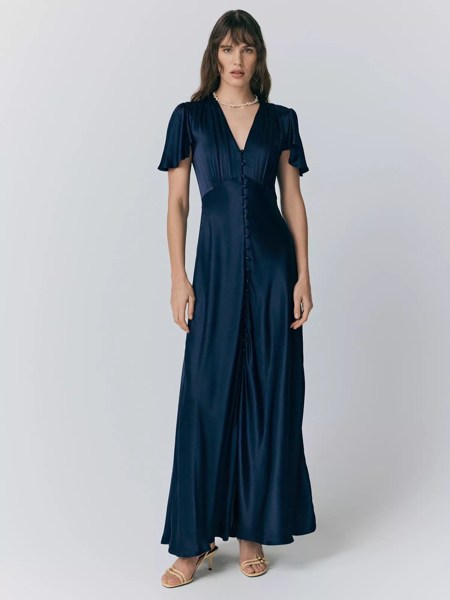 Meet Delphine, one of Ghost's best-selling designs and an ever-popular choice as a bridesmaid dress. With a vintage-inspired silhouette, gentle v-neck and button-through front, this beautiful maxi dress is a timeless option for any special event.