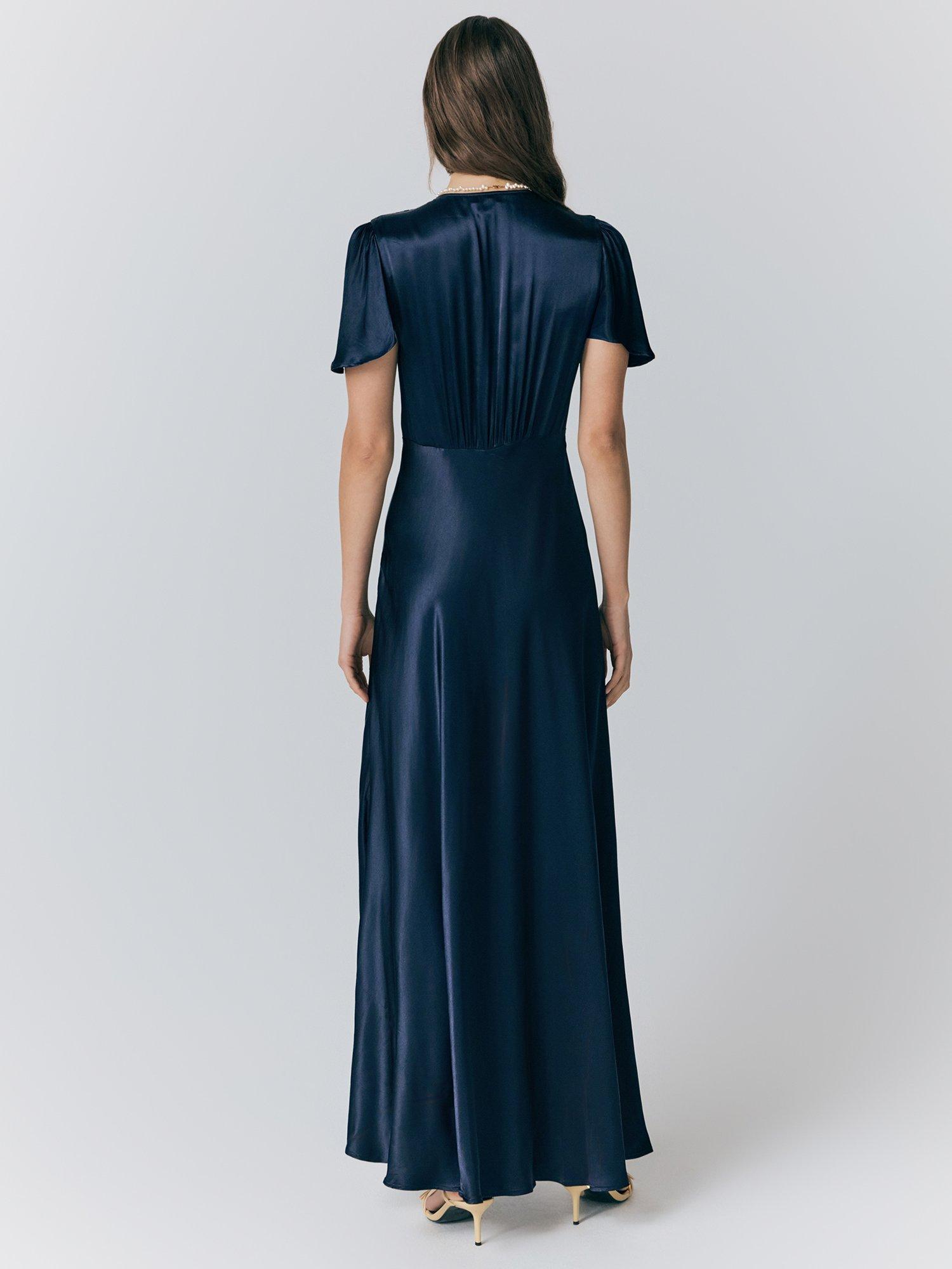 Softly draped sleeves provide coverage at the shoulders, while gentle gathering on the bodice adds to its subtly feminine appeal. Crafted from sustainable satin and cut on the bias for a flattering fit, Delphine is available in a range of colours.