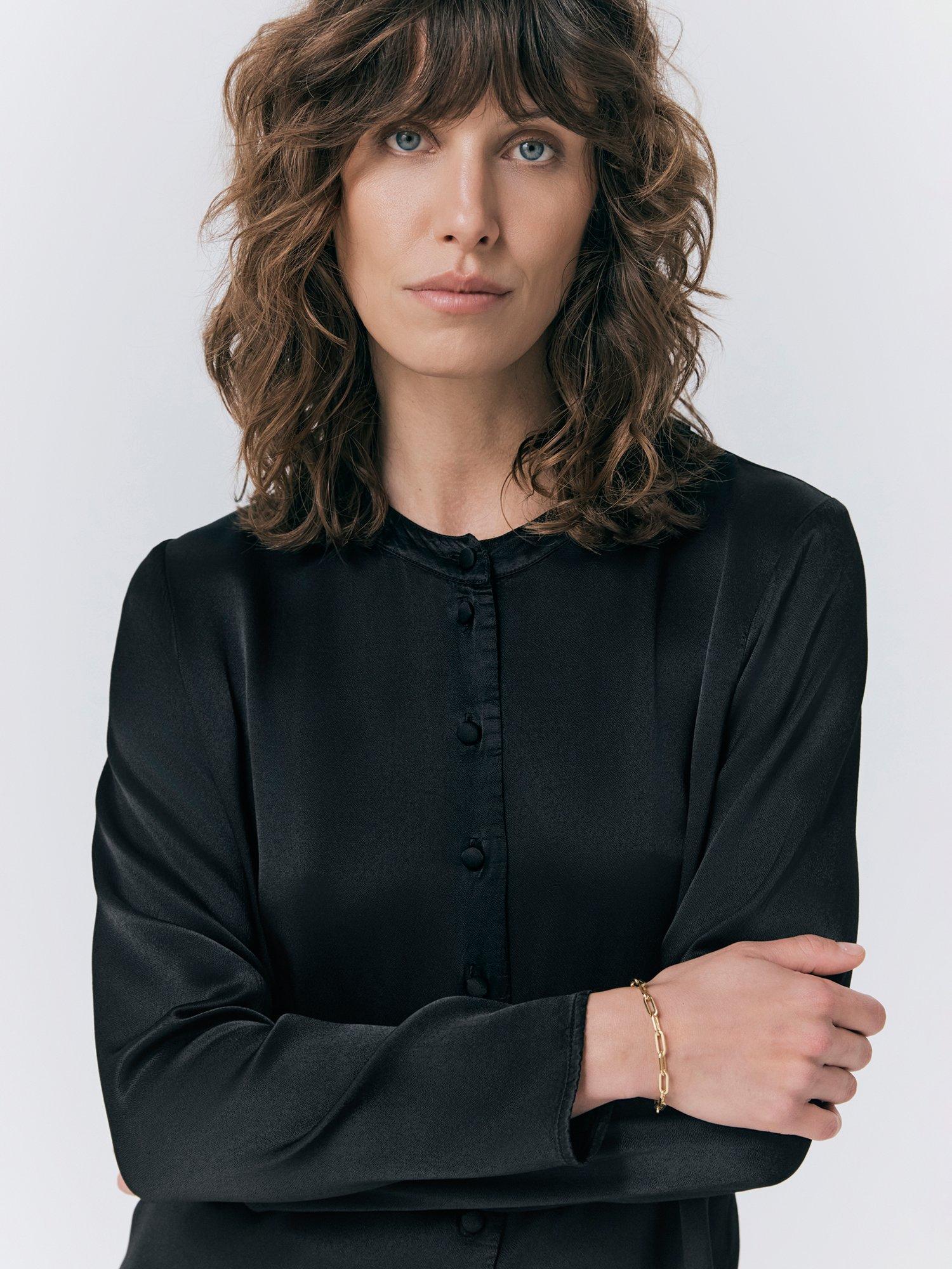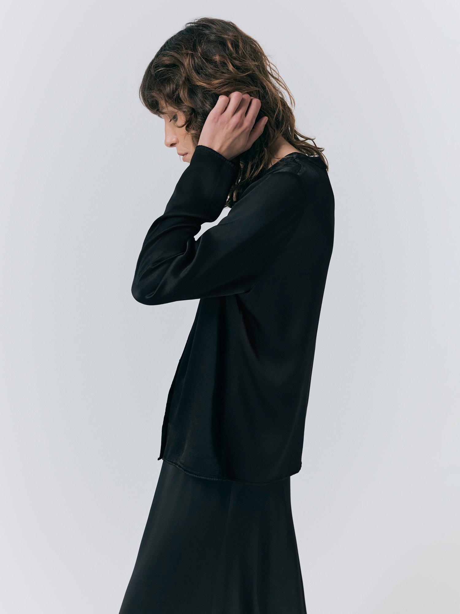 This luxurious satin fabric shirt has a button up front and crew neckline for an elegant finish.