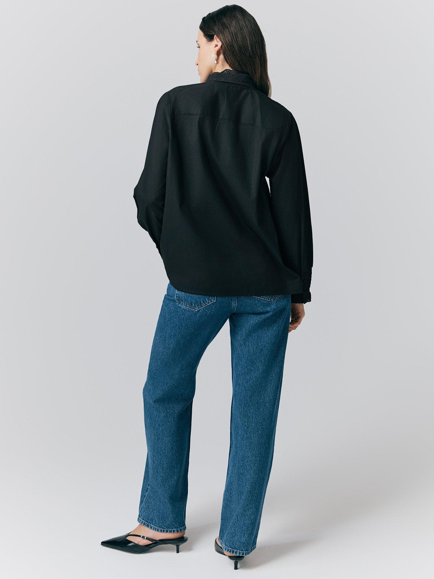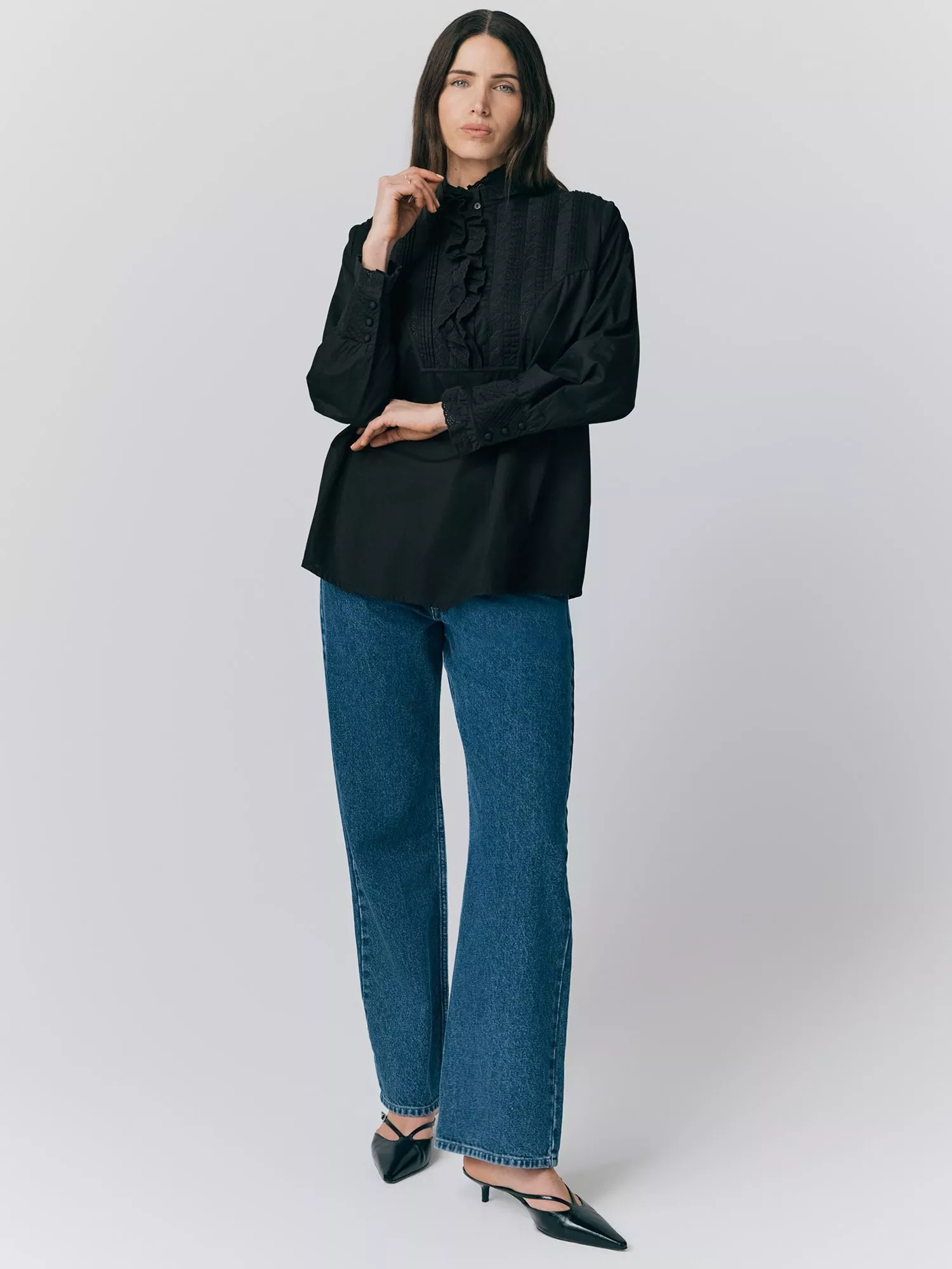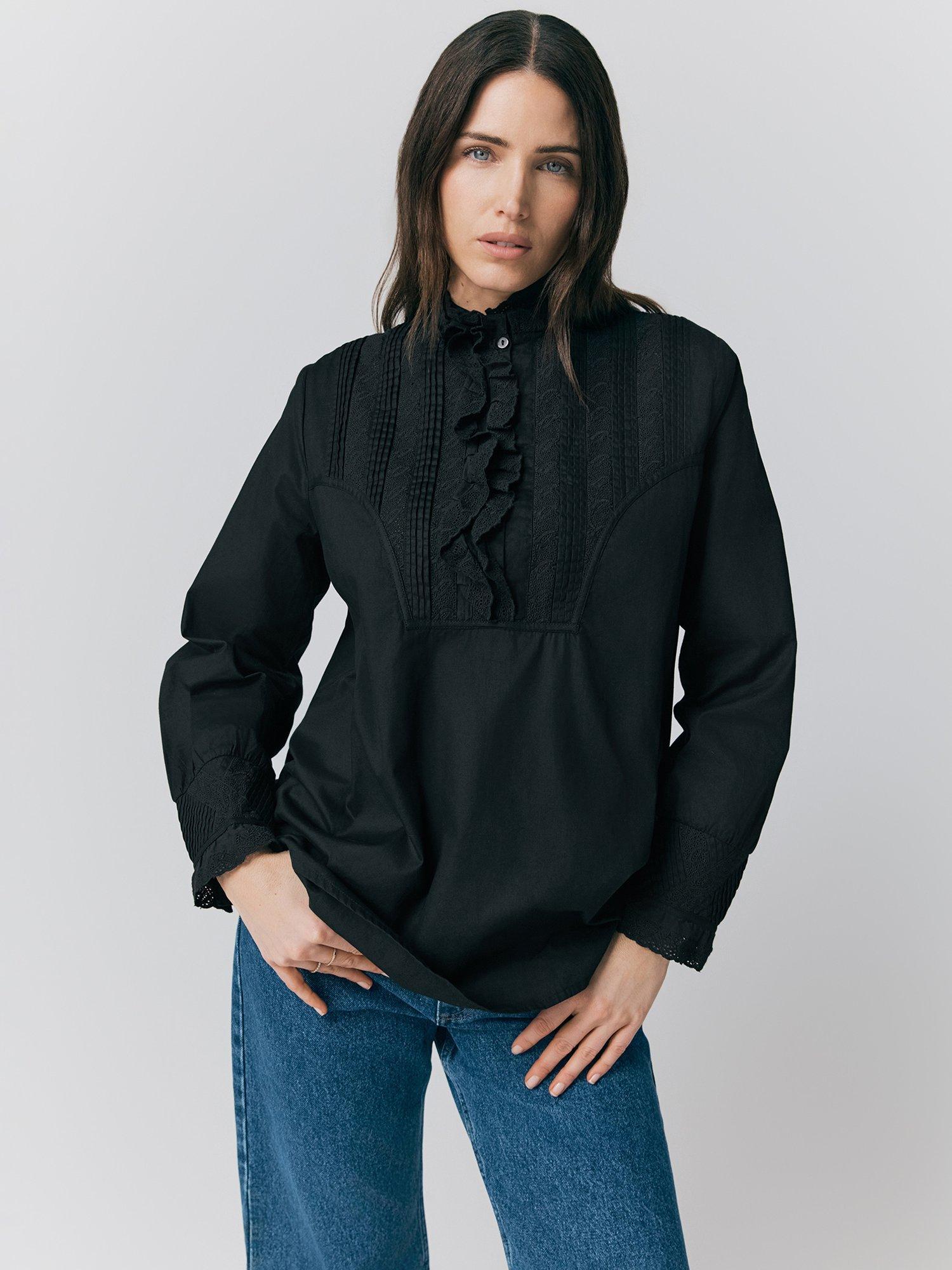 Pure cotton long sleeve shirt, shirring details at cuffs, ruffle detailings at neck and binding.