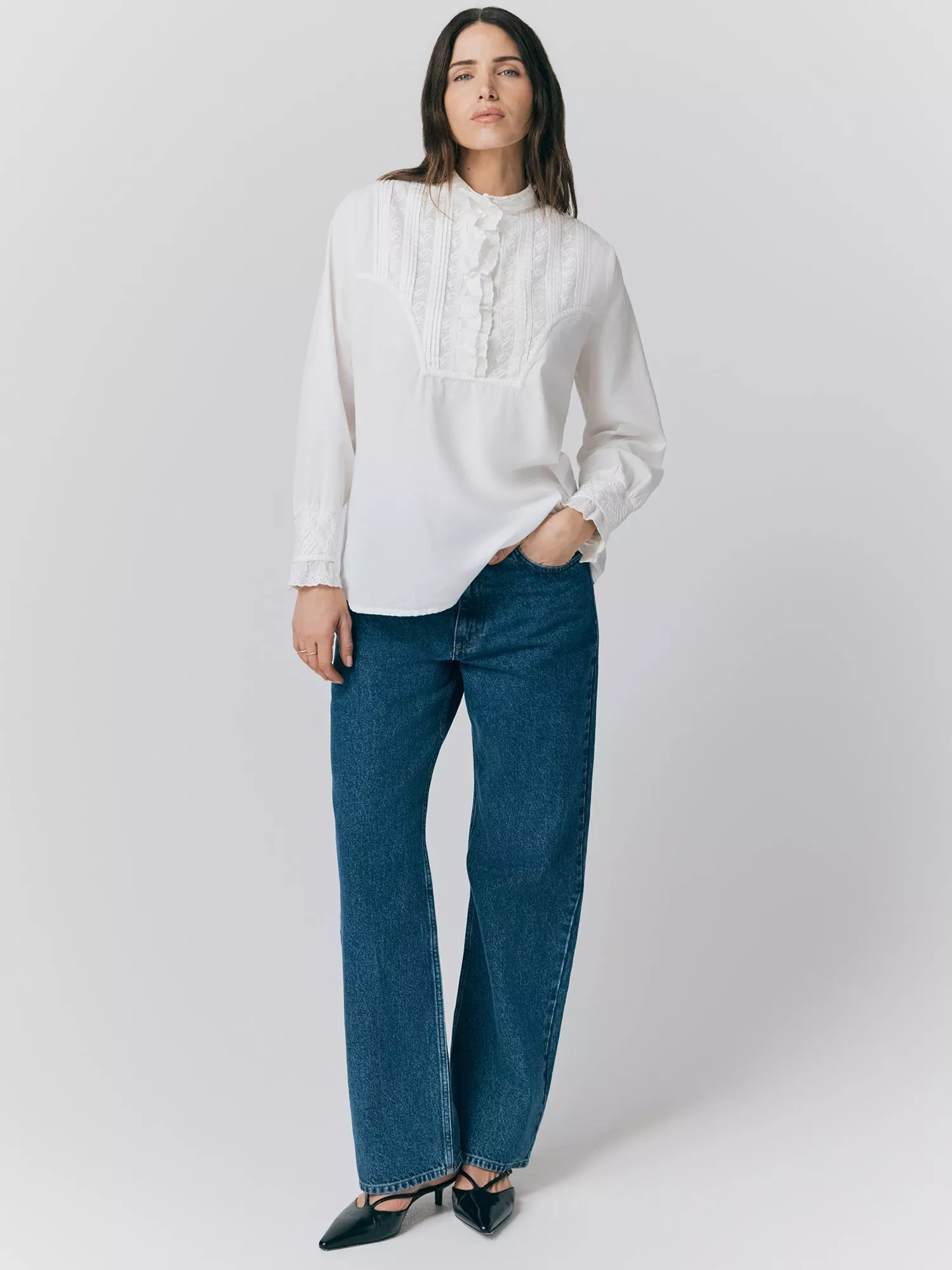Pure cotton long sleeve shirt, shirring details at cuffs, ruffle detailings at neck and binding.