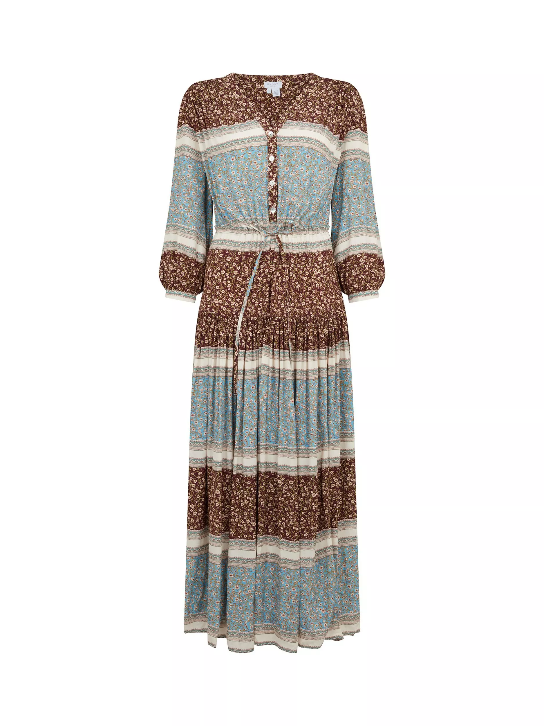 For an autumnal take on florals look no further than Elsa, a long midi dress in a striking border print. This short sleeve style has a button-through bodice with an adaptable drawstring waist and ruffle detailing. The tiered skirt is neatly gathered for extra volume. Pair with ballet flats now, then switch out for boots as the weather cools.
