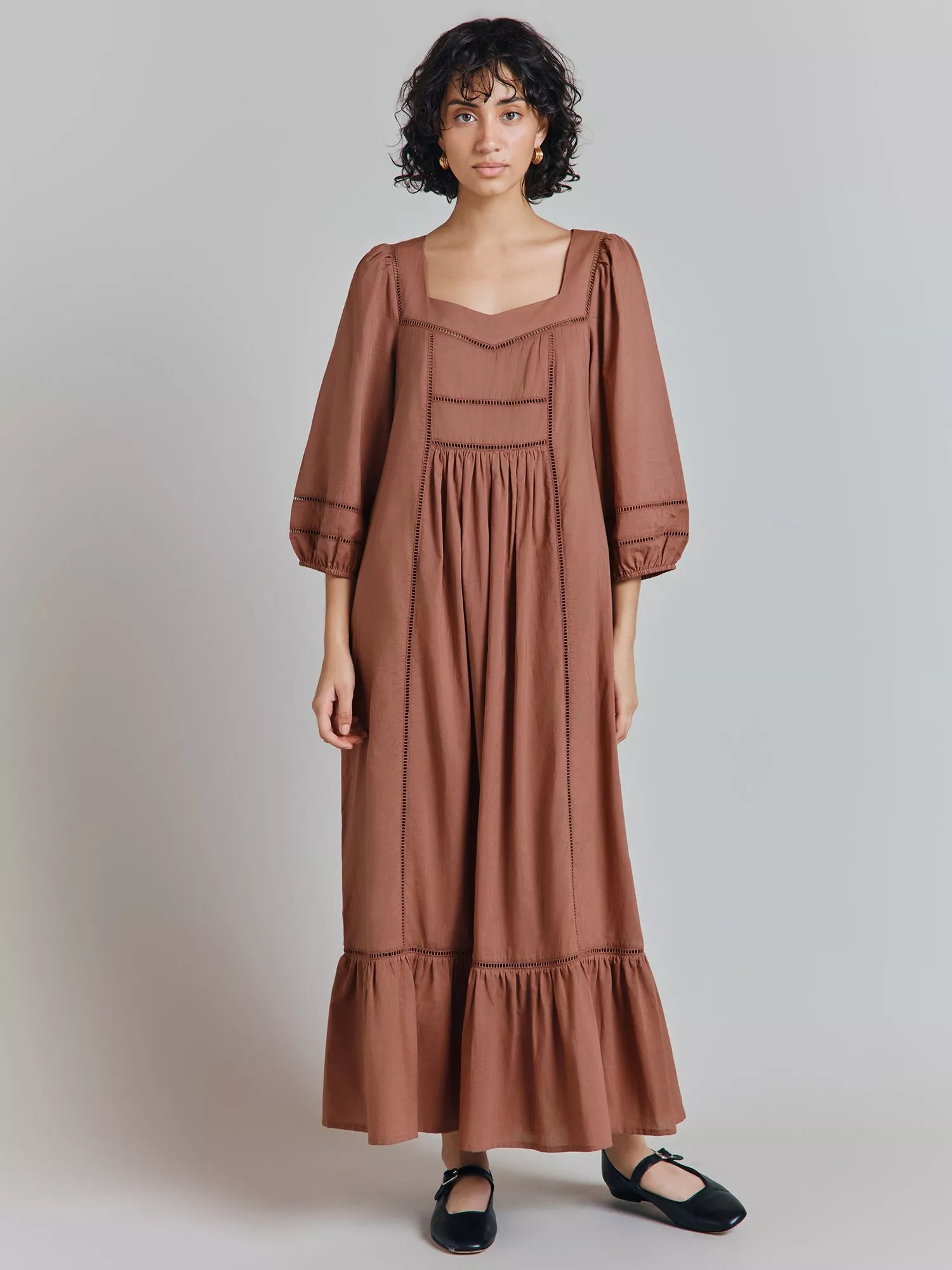A 3-quarter sleeve cotton smock dress with broderie details at the yoke, cuffs, and along the hem.