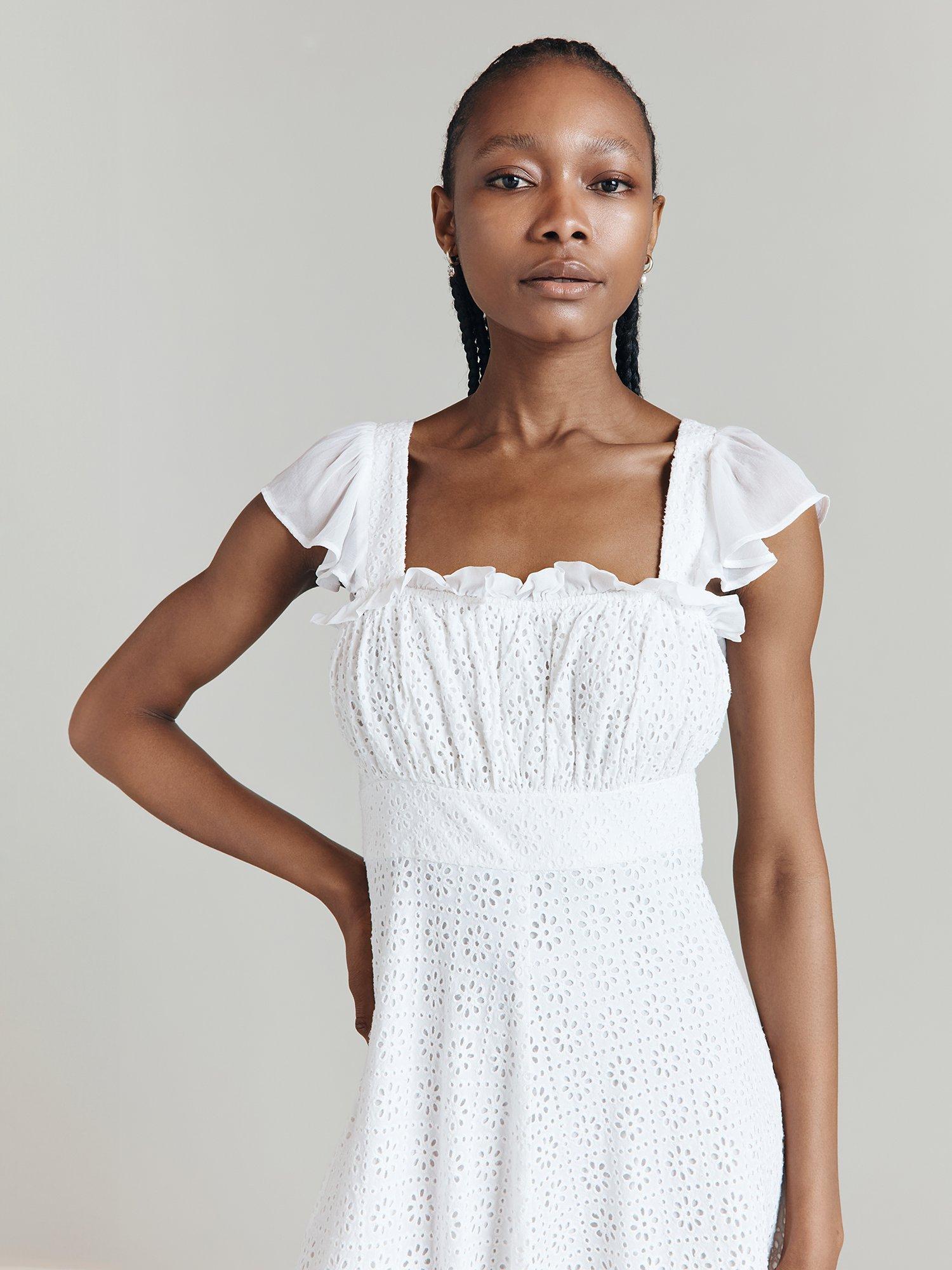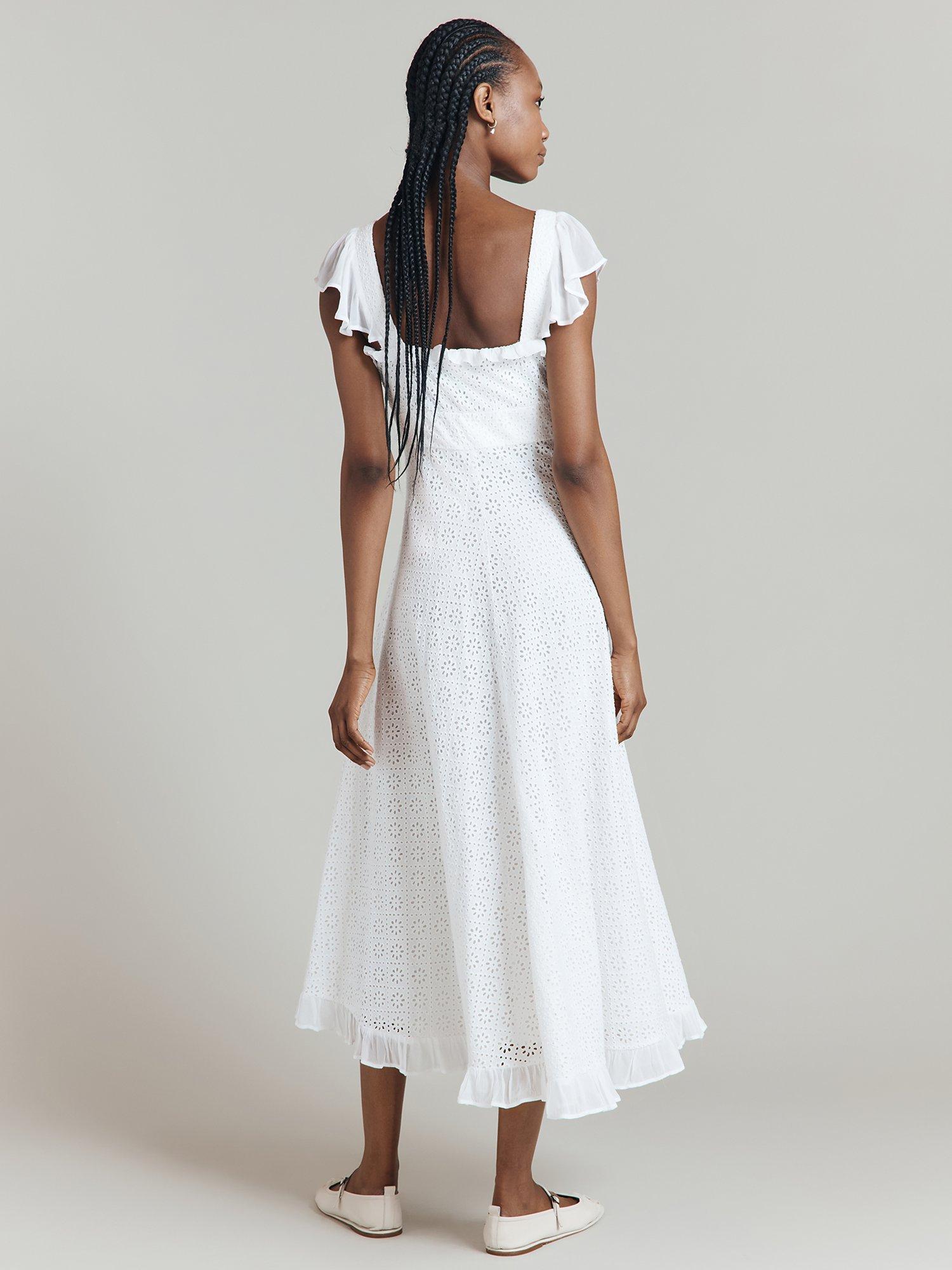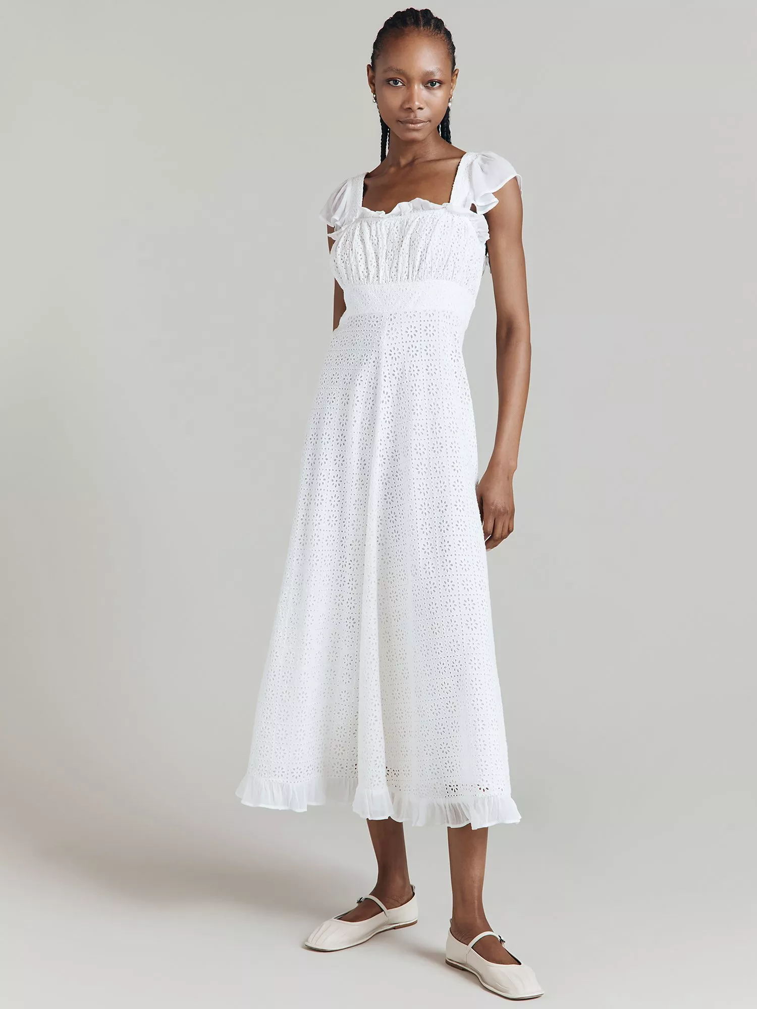 As chic as her Gallic names suggests, Fleurine is a beautiful cotton maxi dress featuring intricate floral-inspired cutwork. With a gathered bodice trimmed in soft ruffled georgette, matching cap sleeves, a stunning empire line silhouette with wide waistband and a voluminous skirt, this is a statement dress that's perfect for a variety of settings. Fully lined with a concealed side-zip fastening.