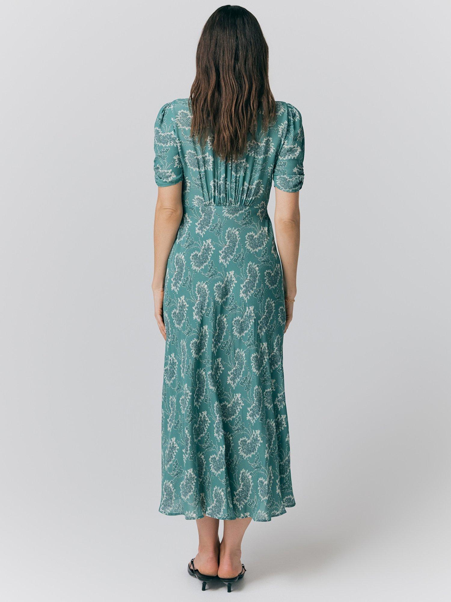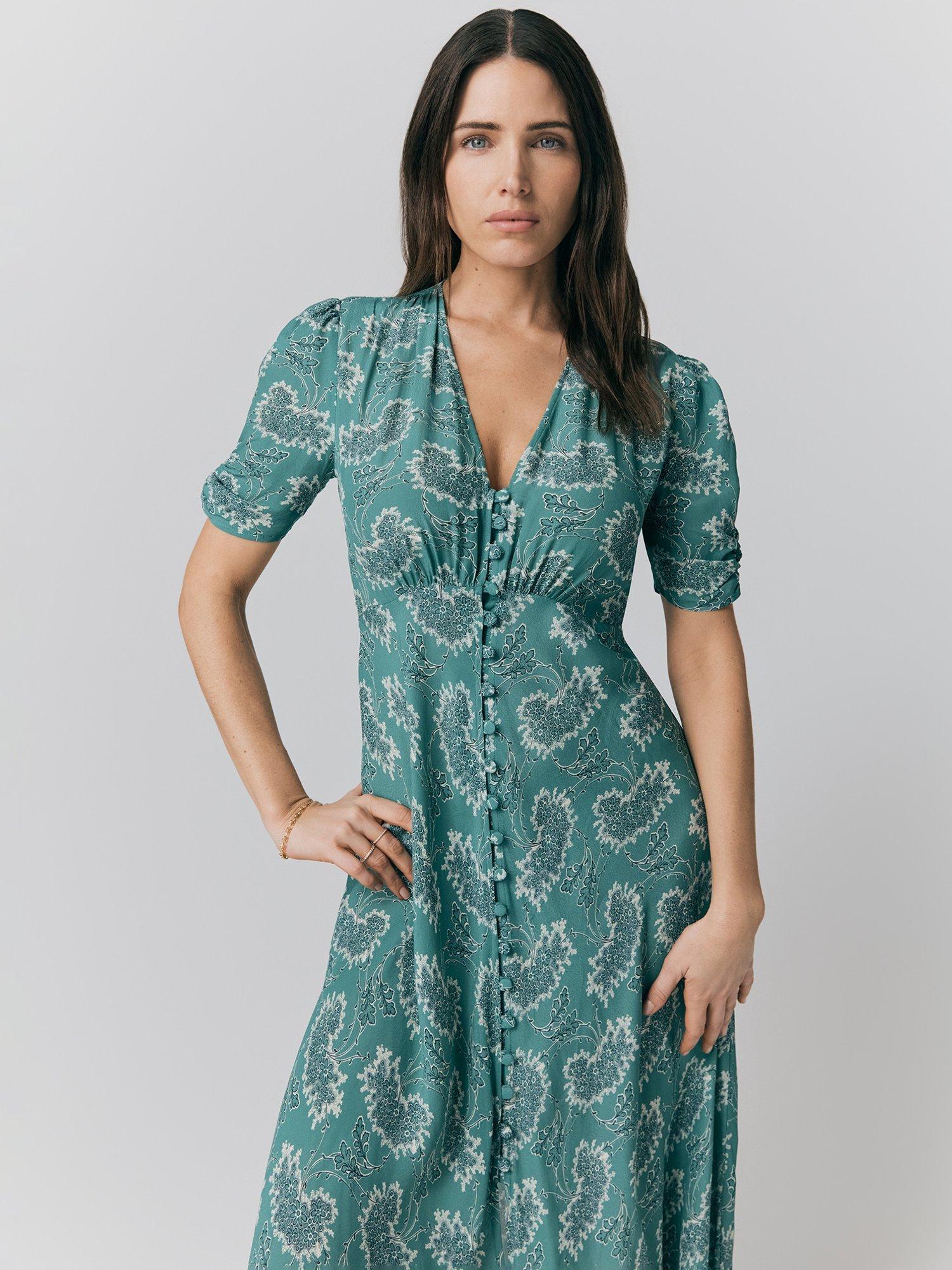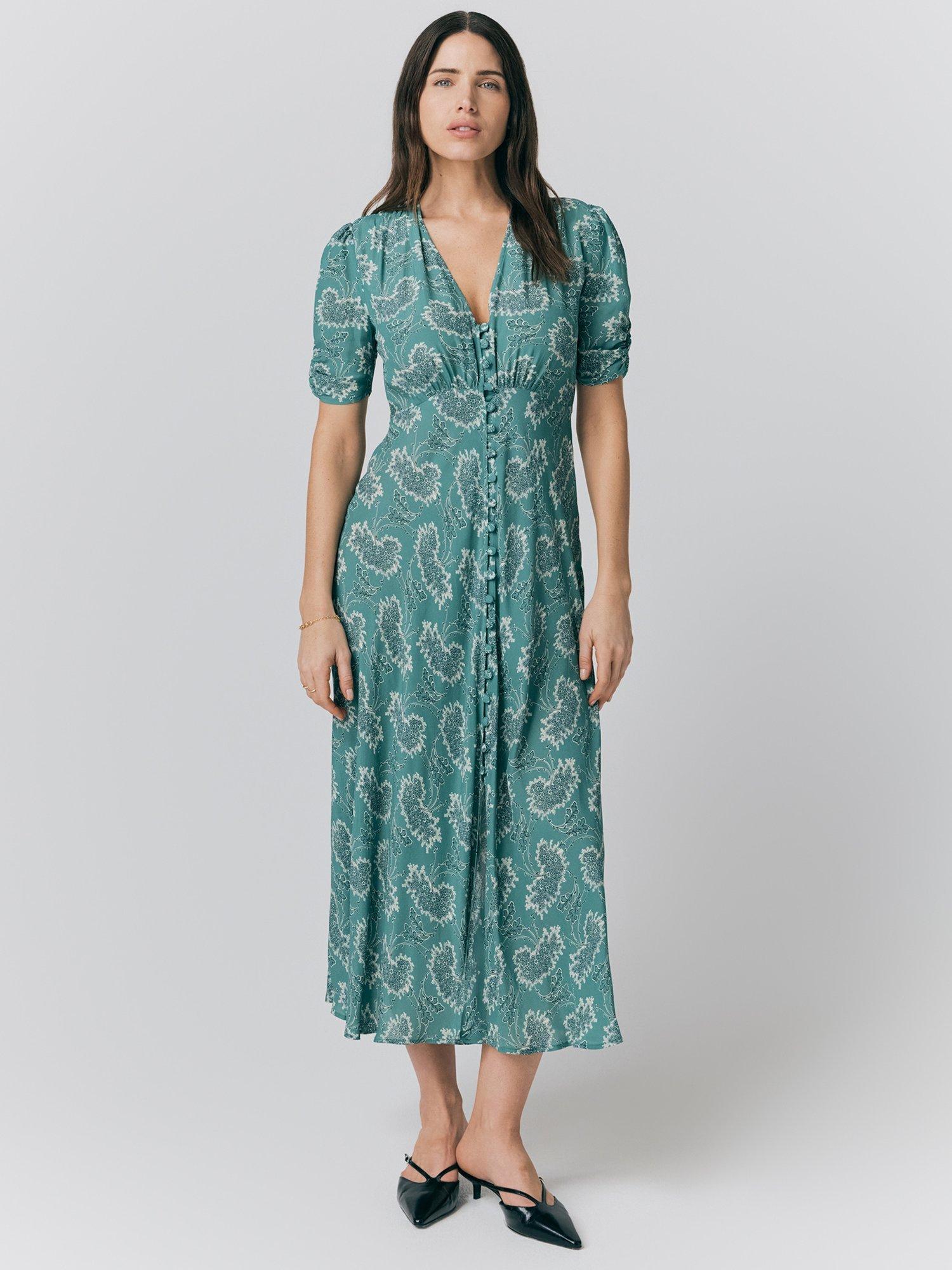 A classic choice in a tea silhouette, this printed midi dress from Ghost is crafted from an airy viscose crepe fabric. Carved with a v-neckline and short sleeves, it features a softly gathered bust for shape and buttons through the front.