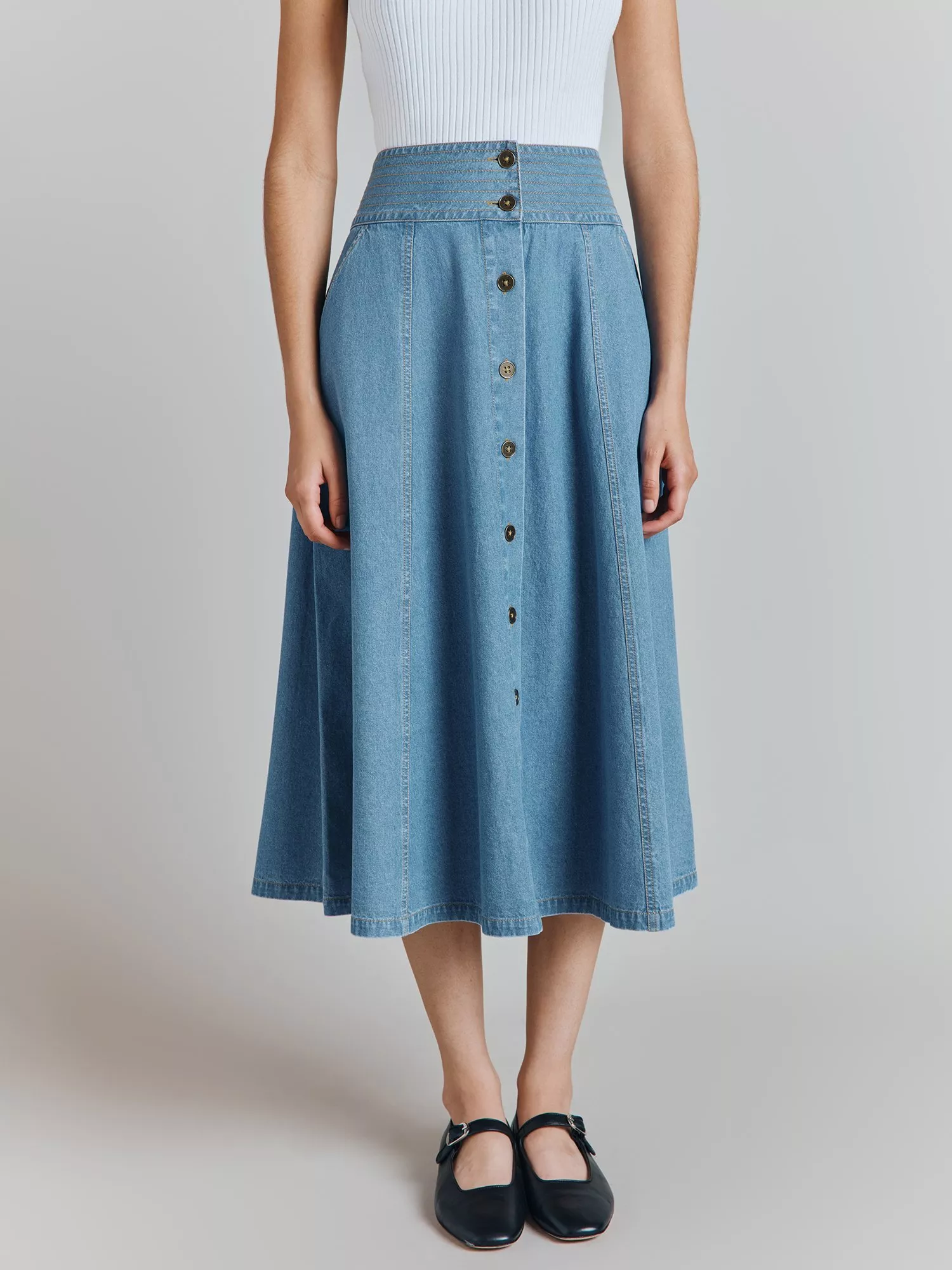 Saying yes to separates, this button front midi skirt by Ghost is minimally detailed for endless wearability.