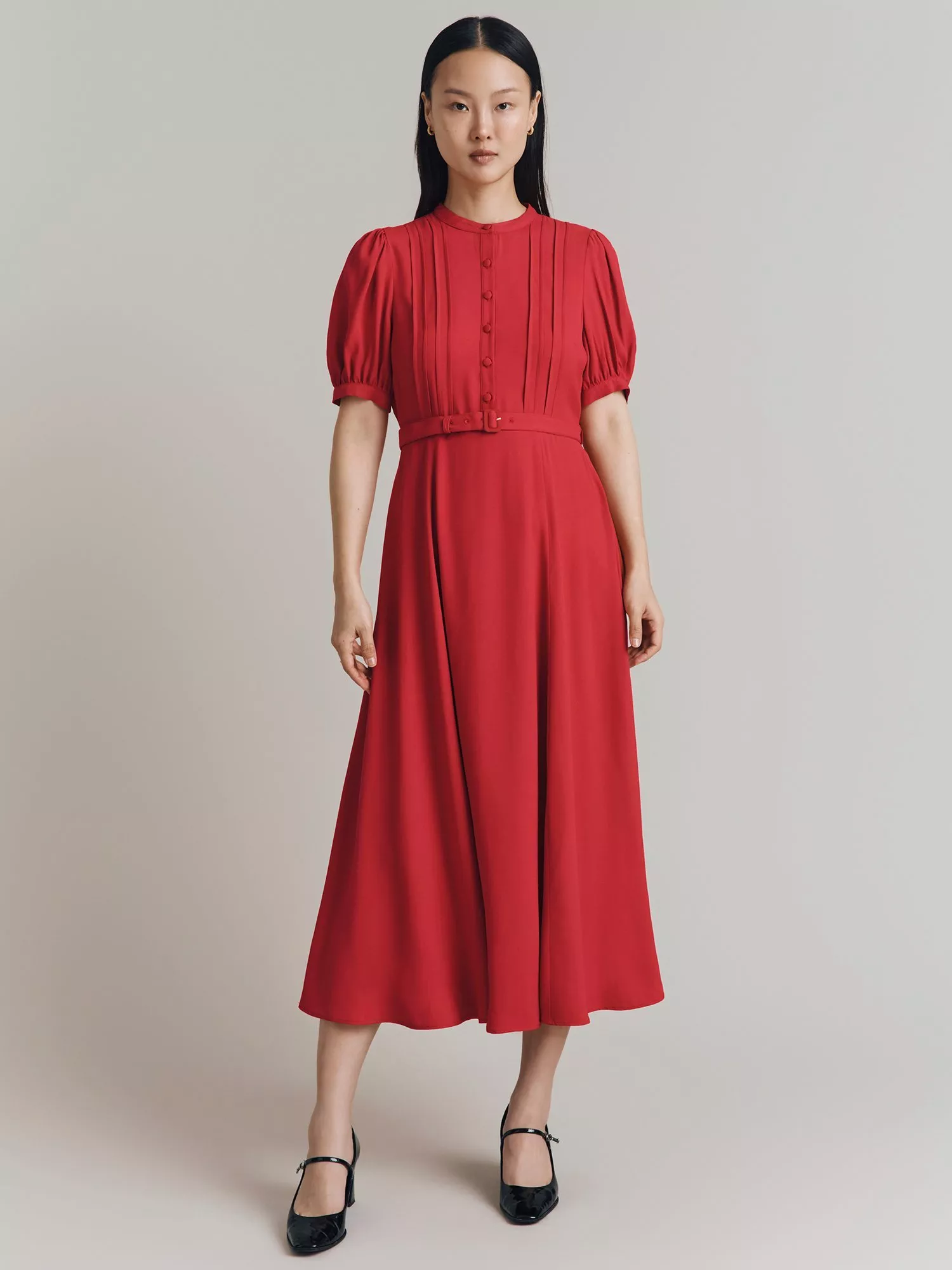 Evoking the spirit of classic 1930s and 1940s tea dresses, Francis is a midi dress that lends itself to all sorts of occasions, from days at work to a day at the races. Pintuck detailing on the bodice, covered buttons, short gathered sleeves and a simple stand collar are offset by a self-covered fabric belt at the waist that provides elegant definition. Crafted in satin back crepe for beautiful movement, the skirt is bias cut for volume and sweep.