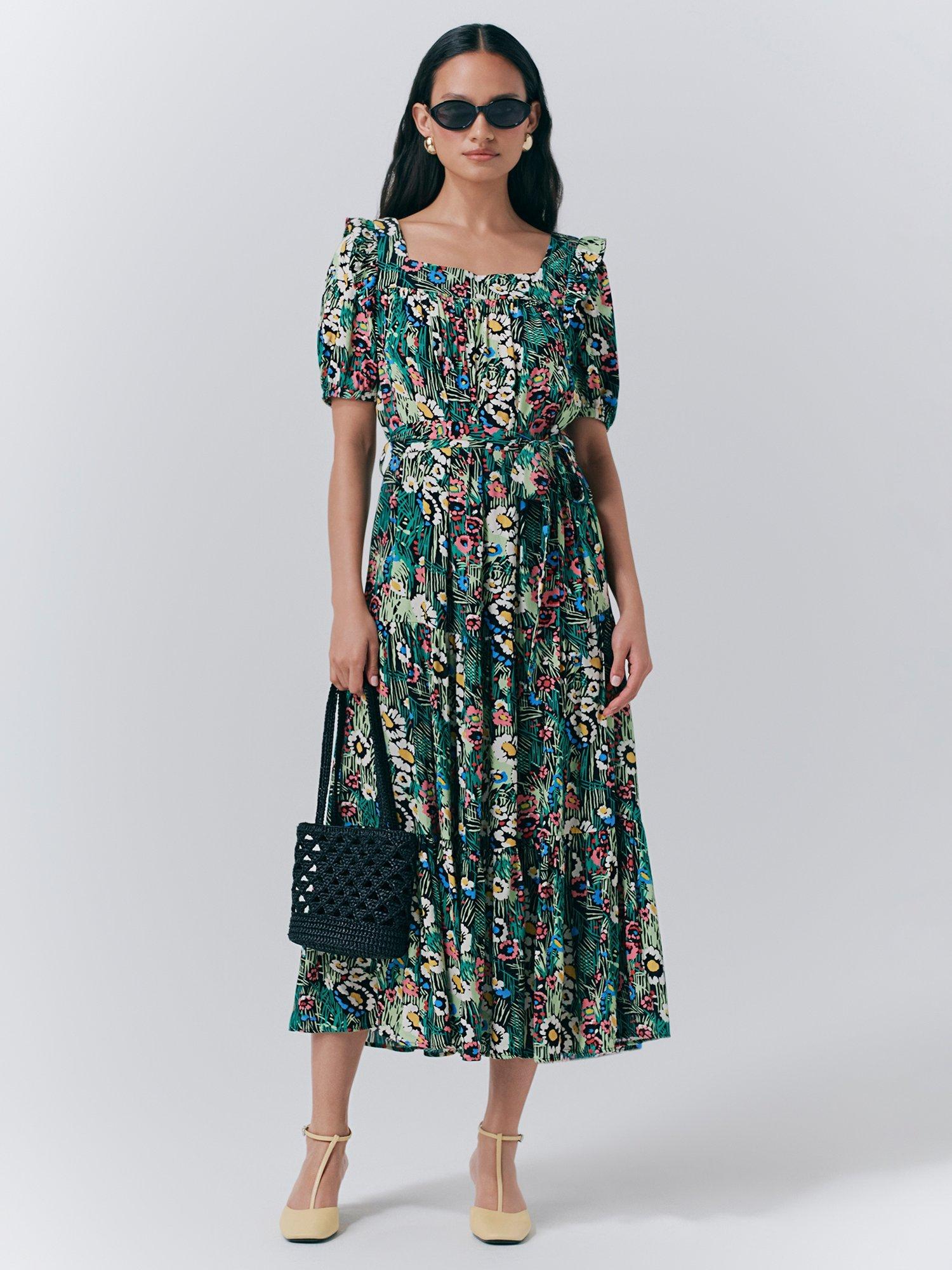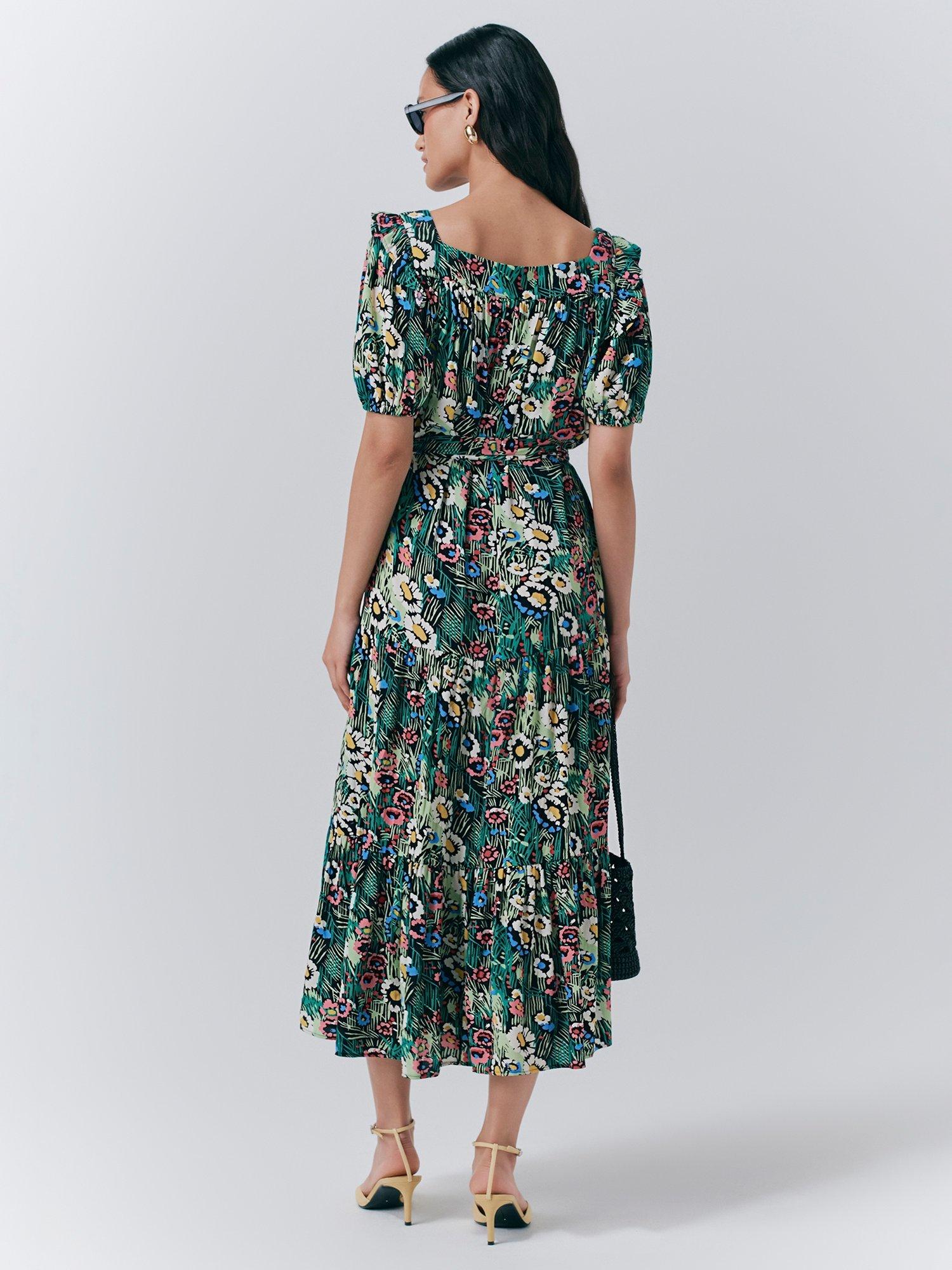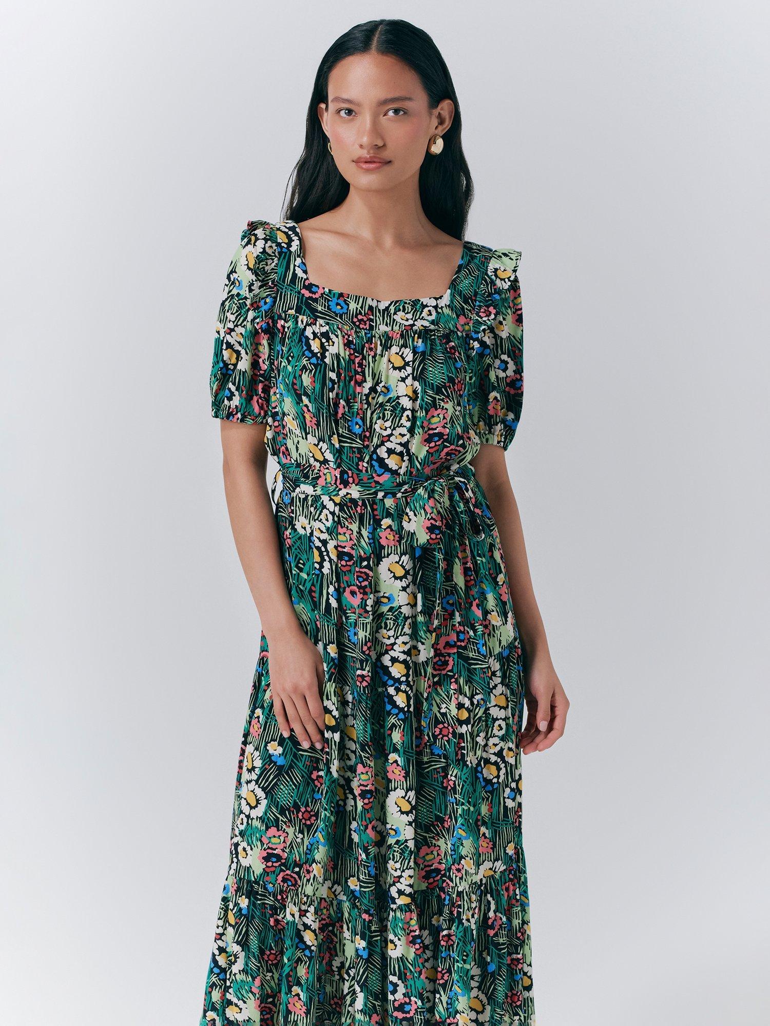 Short puffed sleeves with gathered cuffs, square neck, tiered hem, matching fabric belt- this floral dress ticks all the boxes for city breaks and escapes this summer.