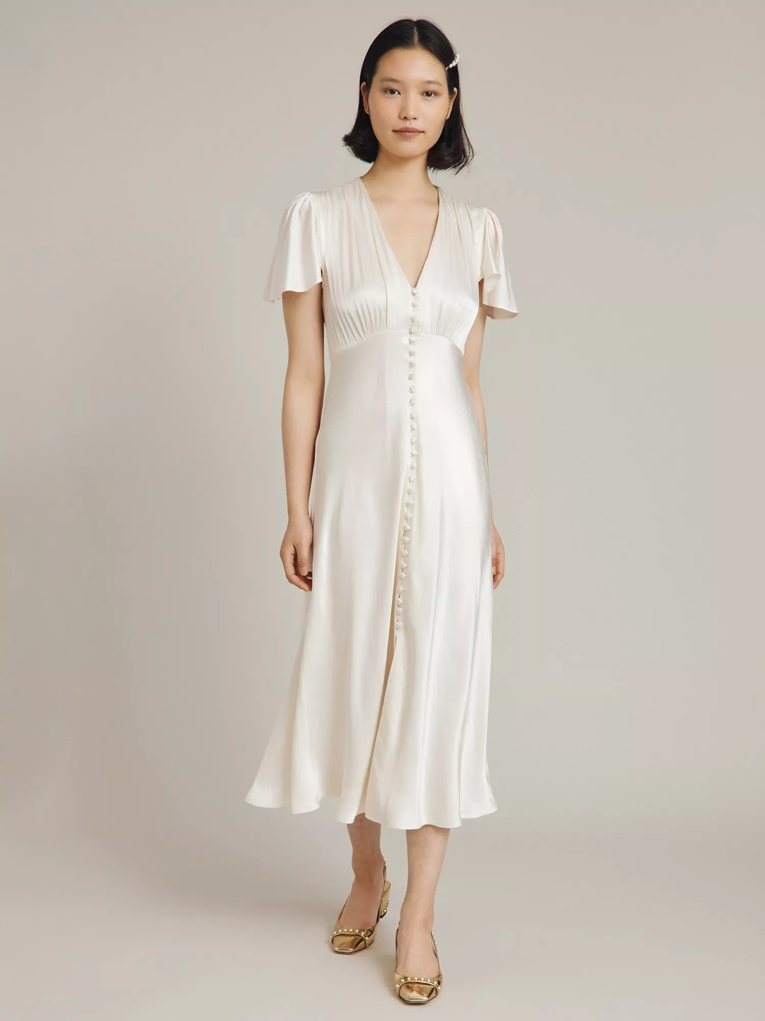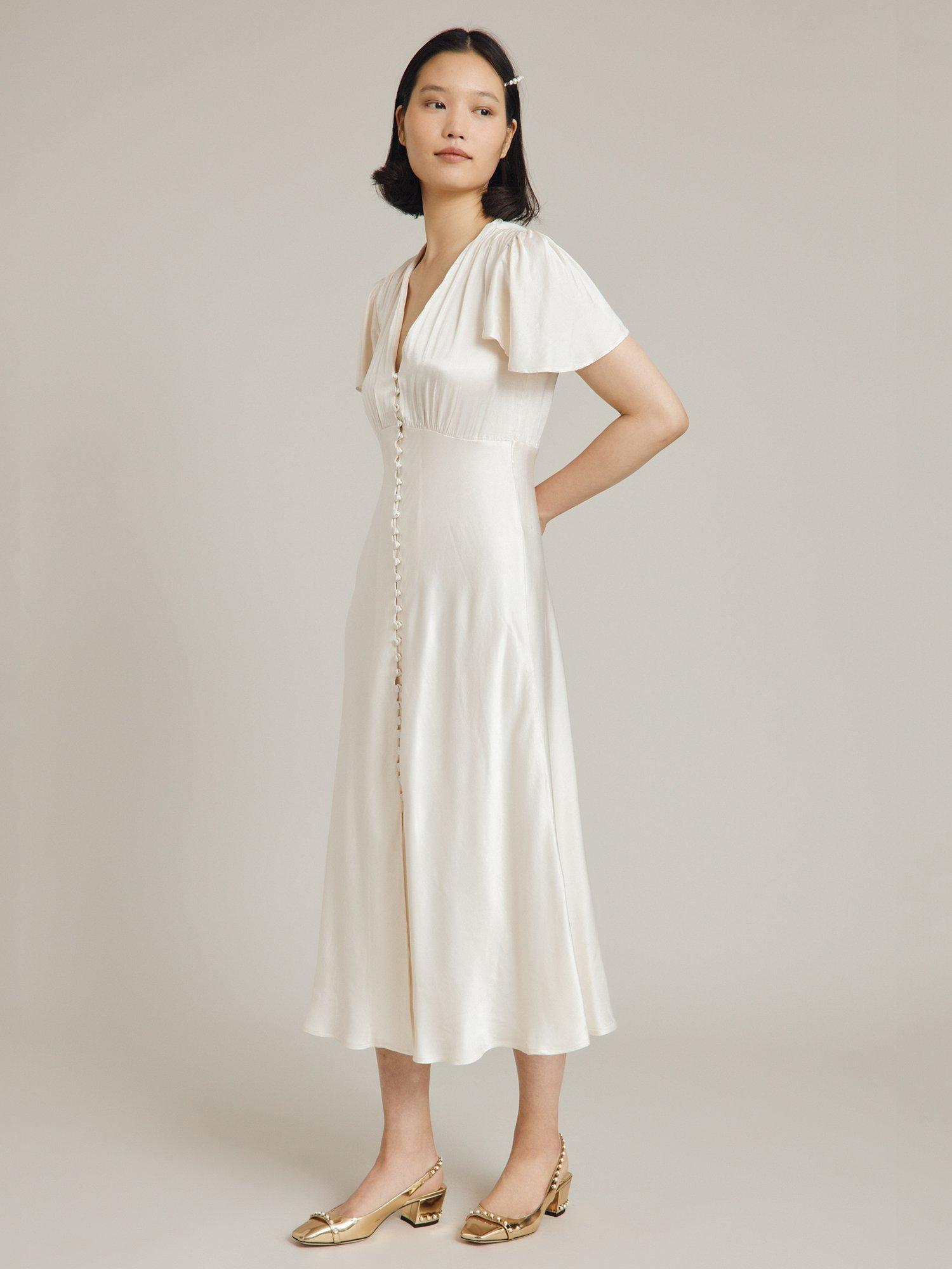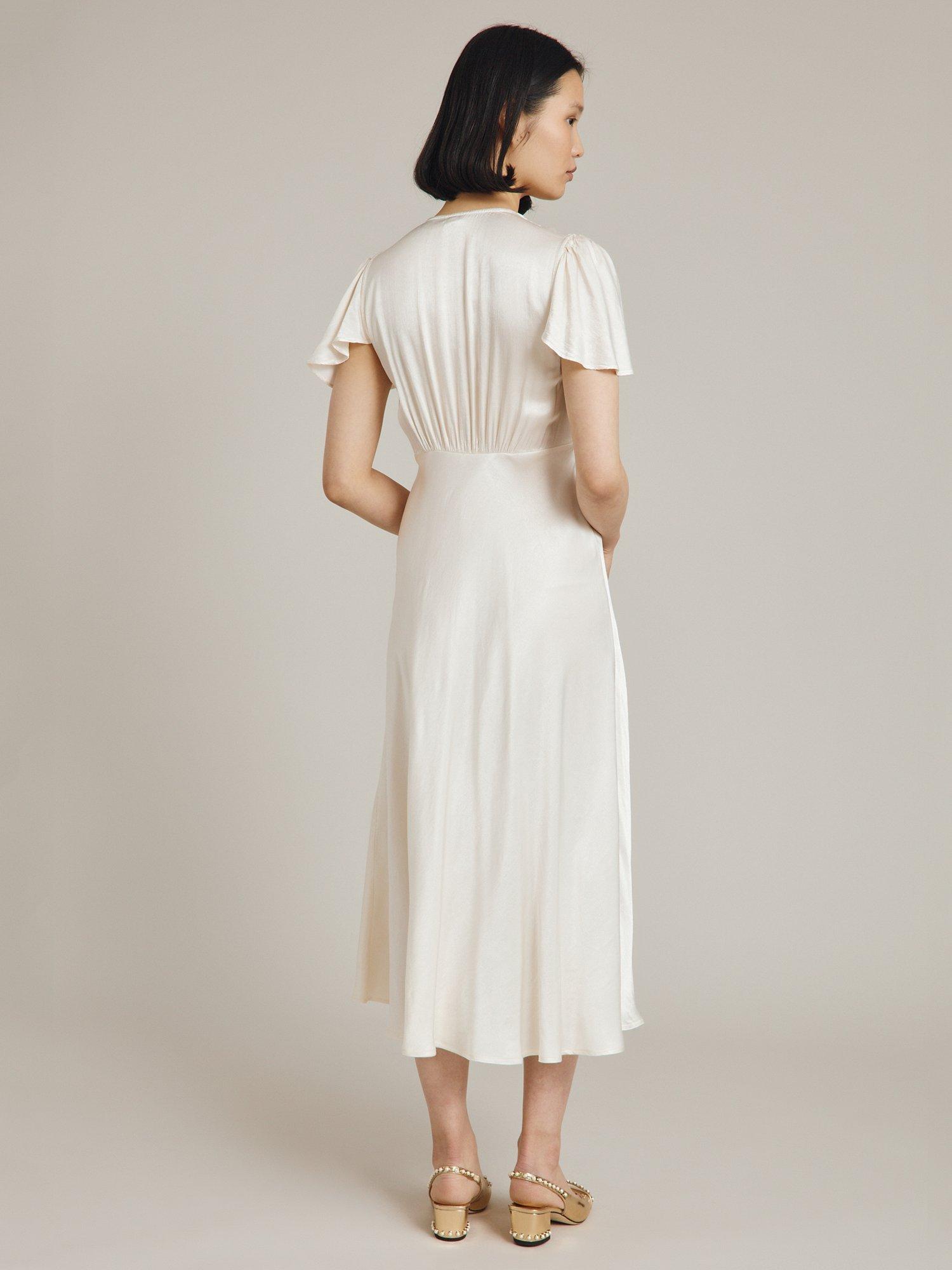 In a playful swing shape with gathered detailing, this satin midi dress by Ghost complements bold accessories with its plain canvas.