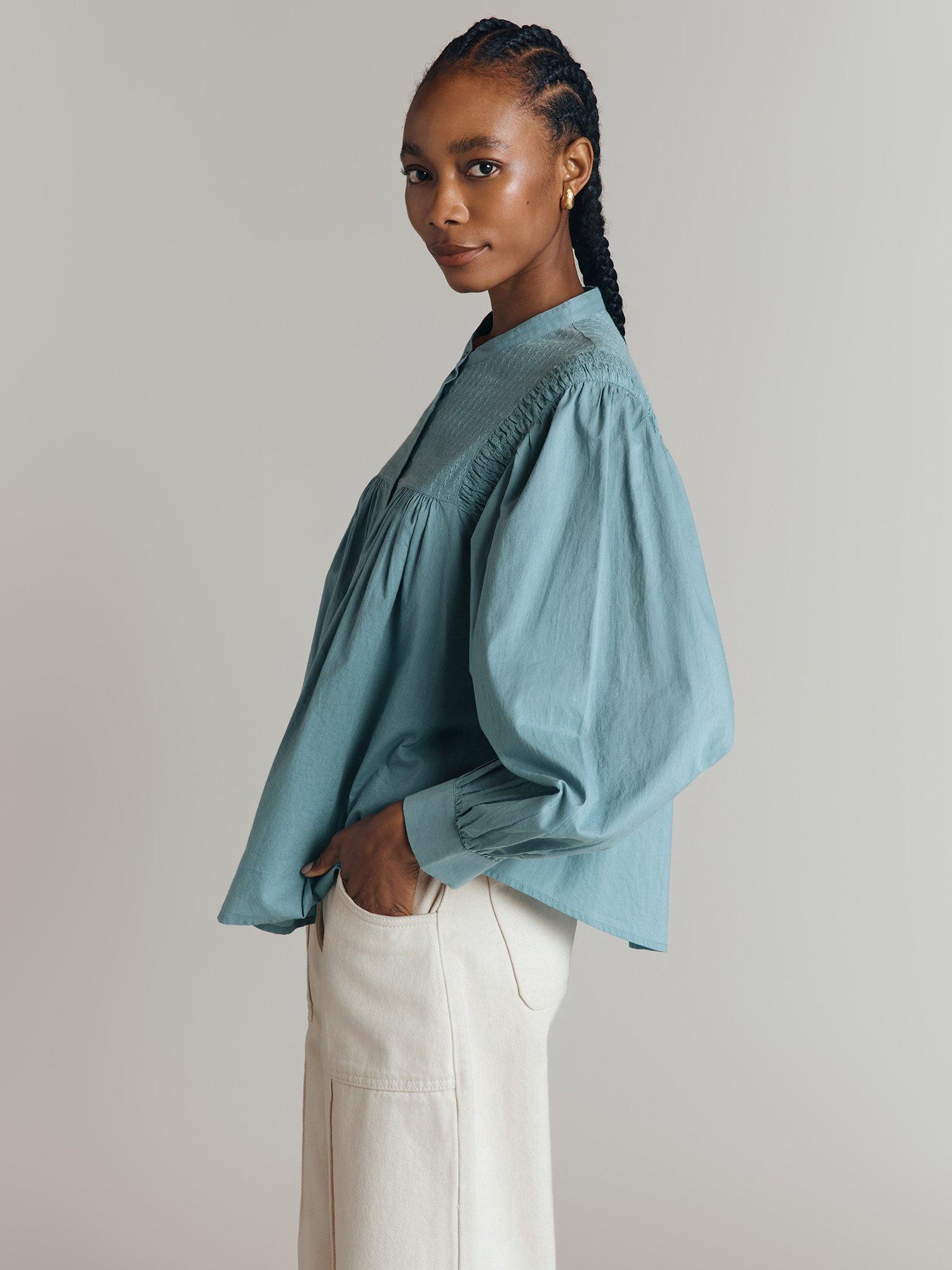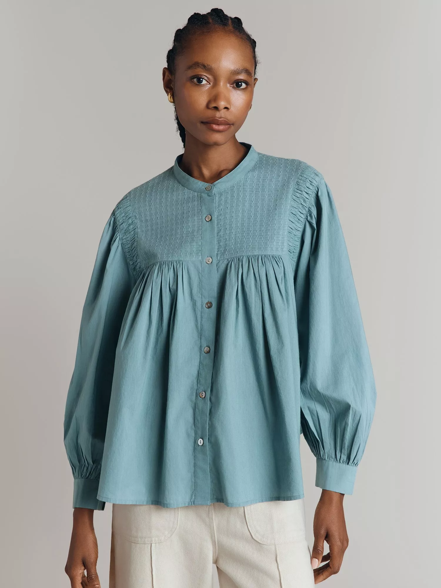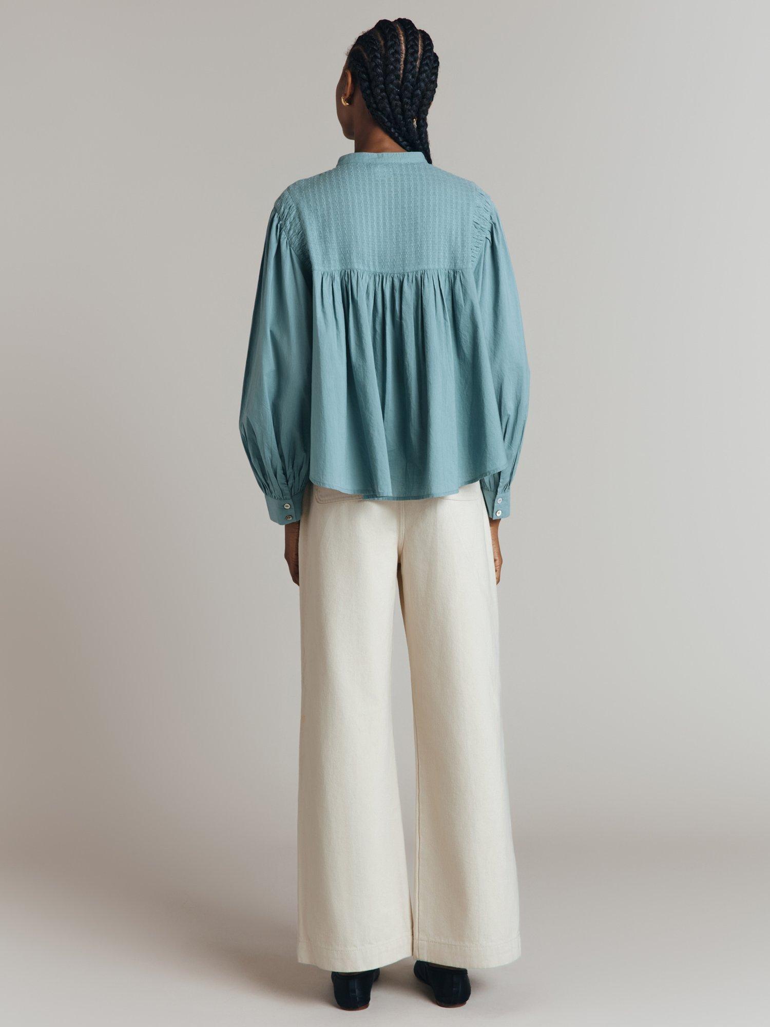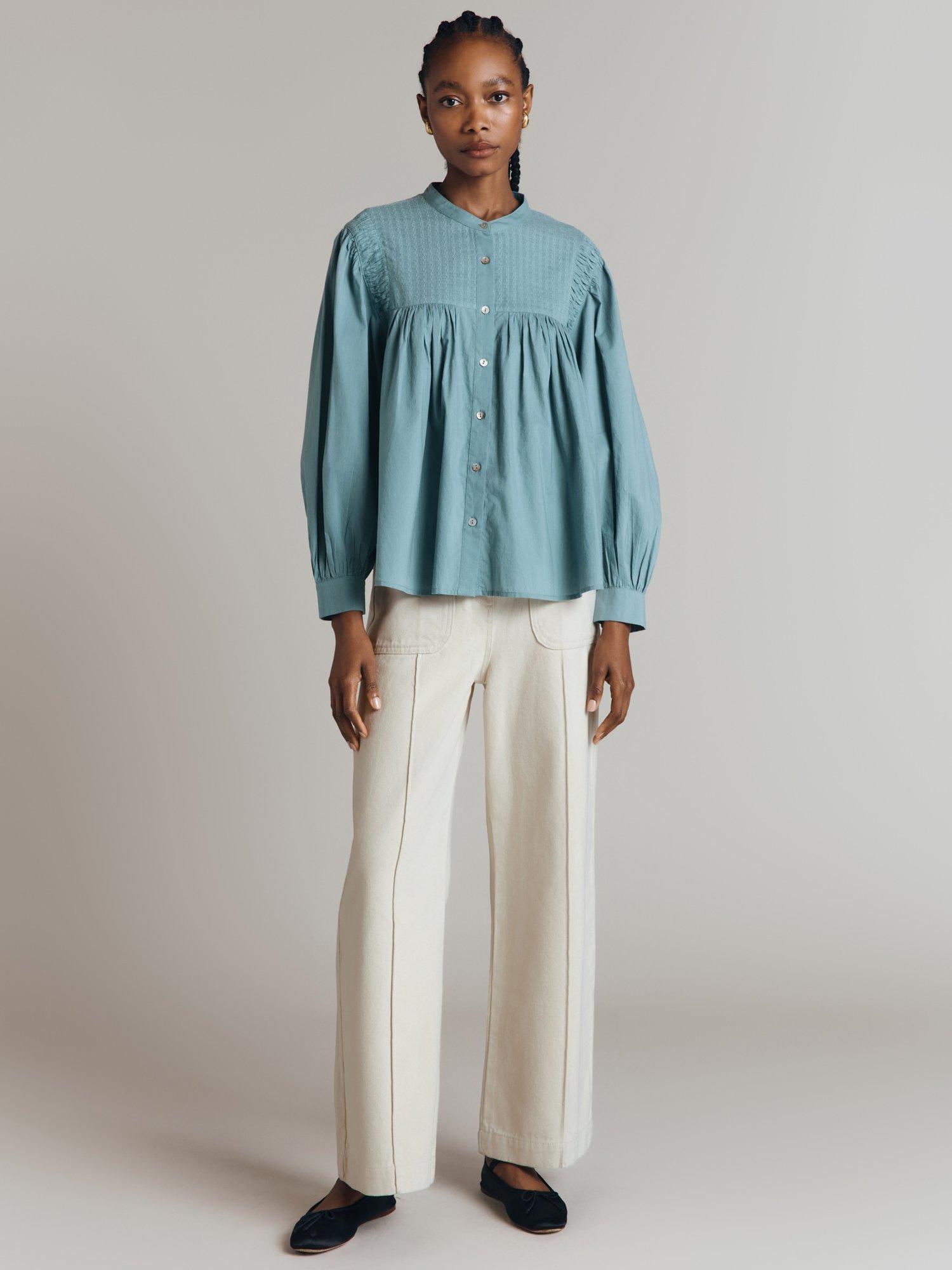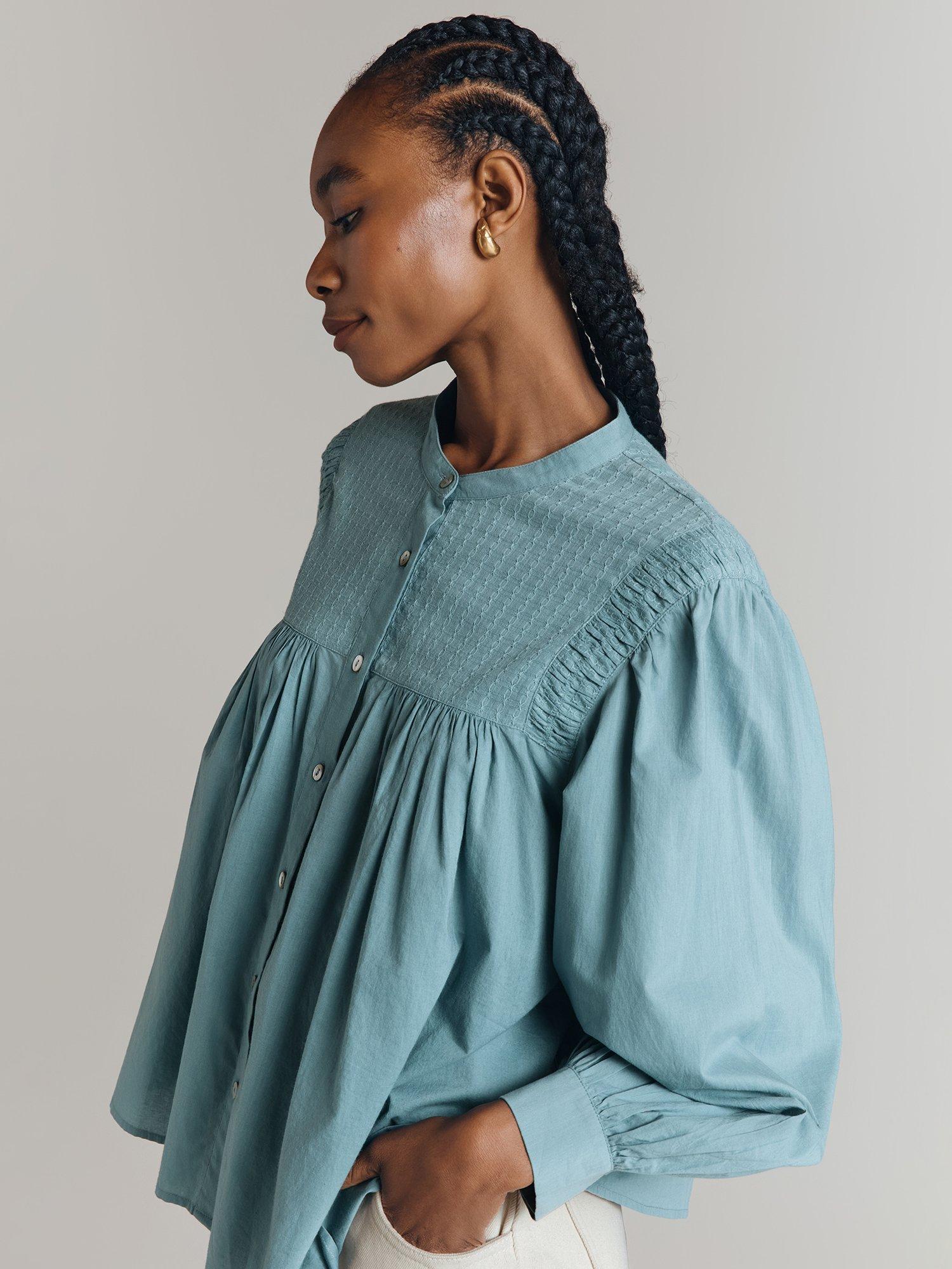 Update your wardrobe with Greta, a cotton poplin blouse with a classic, relaxed feel. Rich in detail, this style features a front bib with an intricate jacquard design, pleat detailing at the shoulders, gentle volume in the sleeves and shell buttons. Try it tucked into high-waisted trousers or jeans for an easy autumn look.