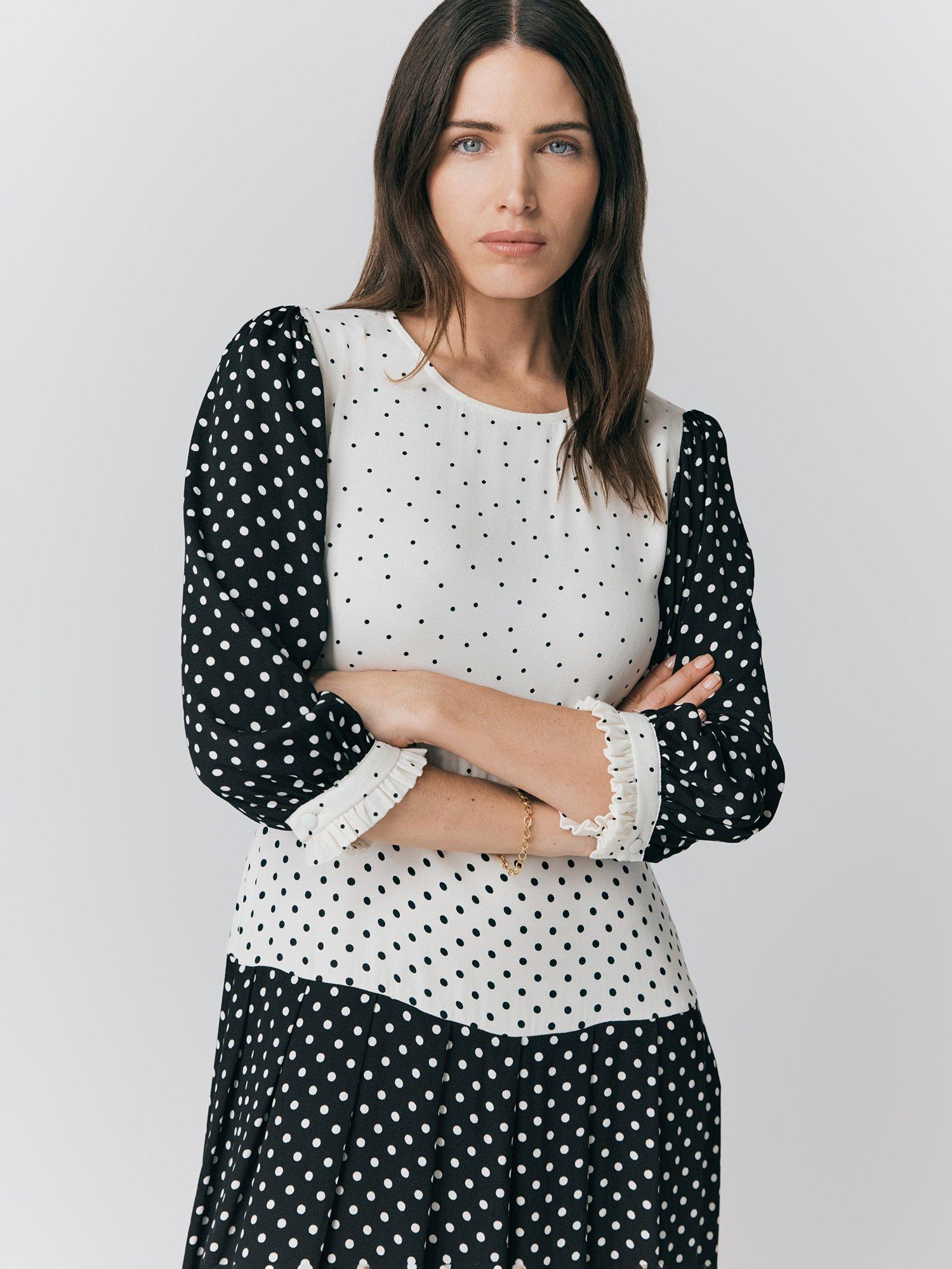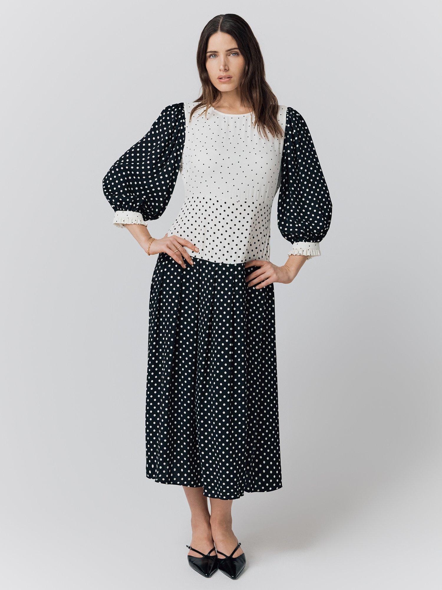 Crafted from a heavyweight crepe fabric in a timeless polka dot print, you can wear this versatile dress to the office, or for a special occasion. It combines three different spot prints and features voluminous three-quarter length sleeves with frill cuffs and a flattering drop waist with a pleated skirt.
