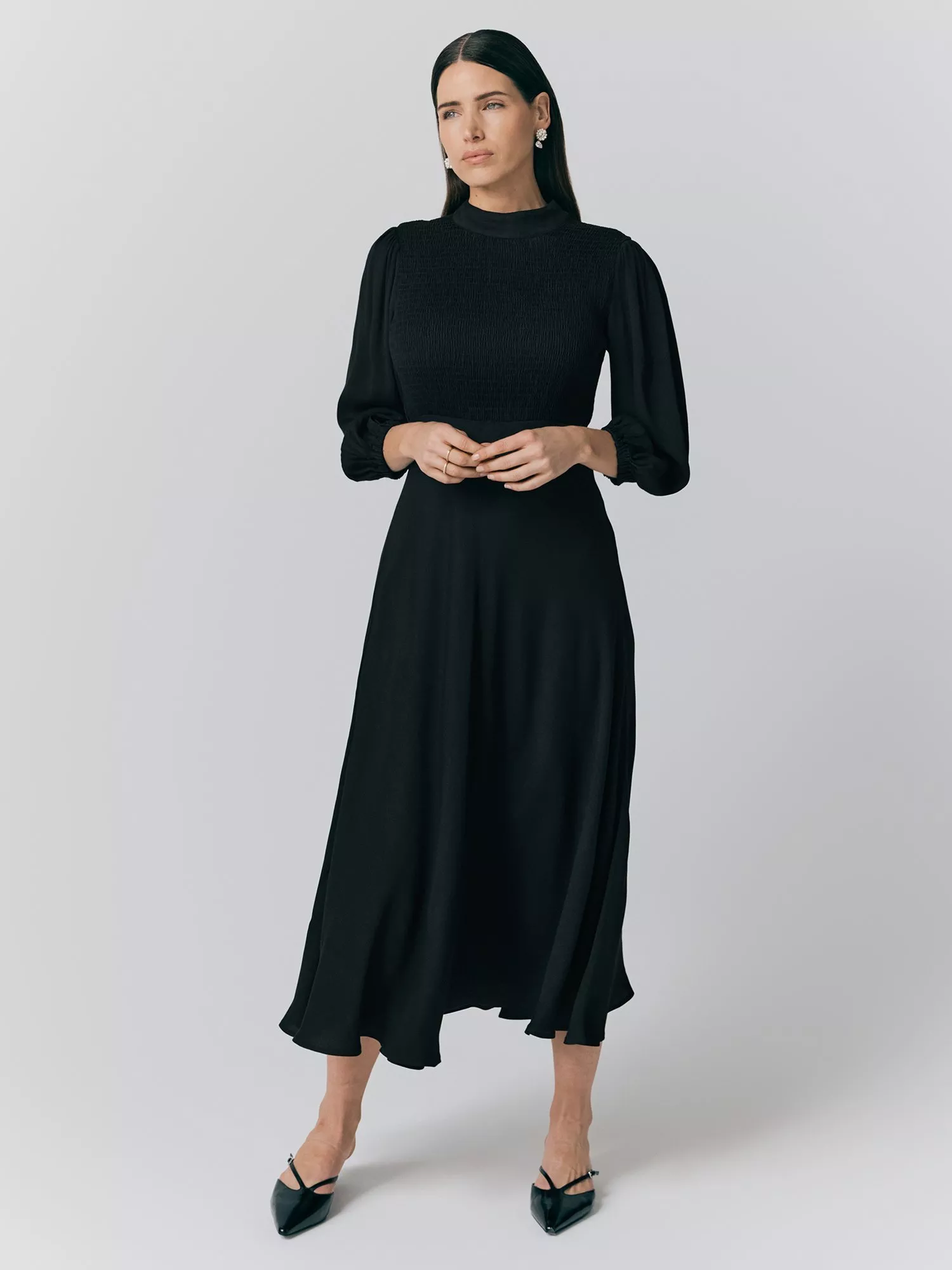 A lightweight dress with 3-quarter puffed sleeves with gathered cuffs, shirred detailing, button fastening at back, and high neck.