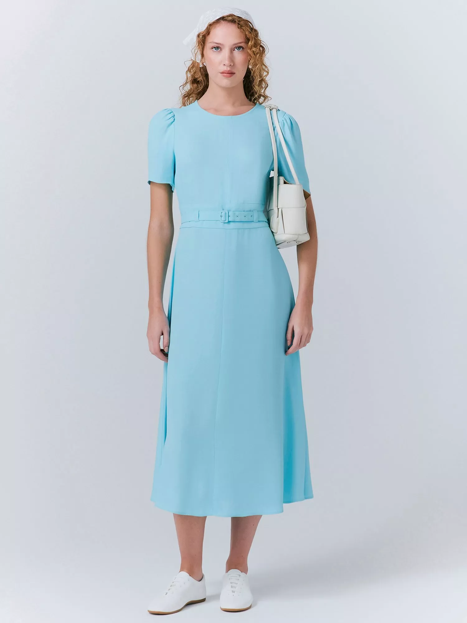 A flared midi dress from Ghost that's beautifully simple, featuring a cute matching fabric belt and key-hole detailing at the back for a sprinkling of charm.